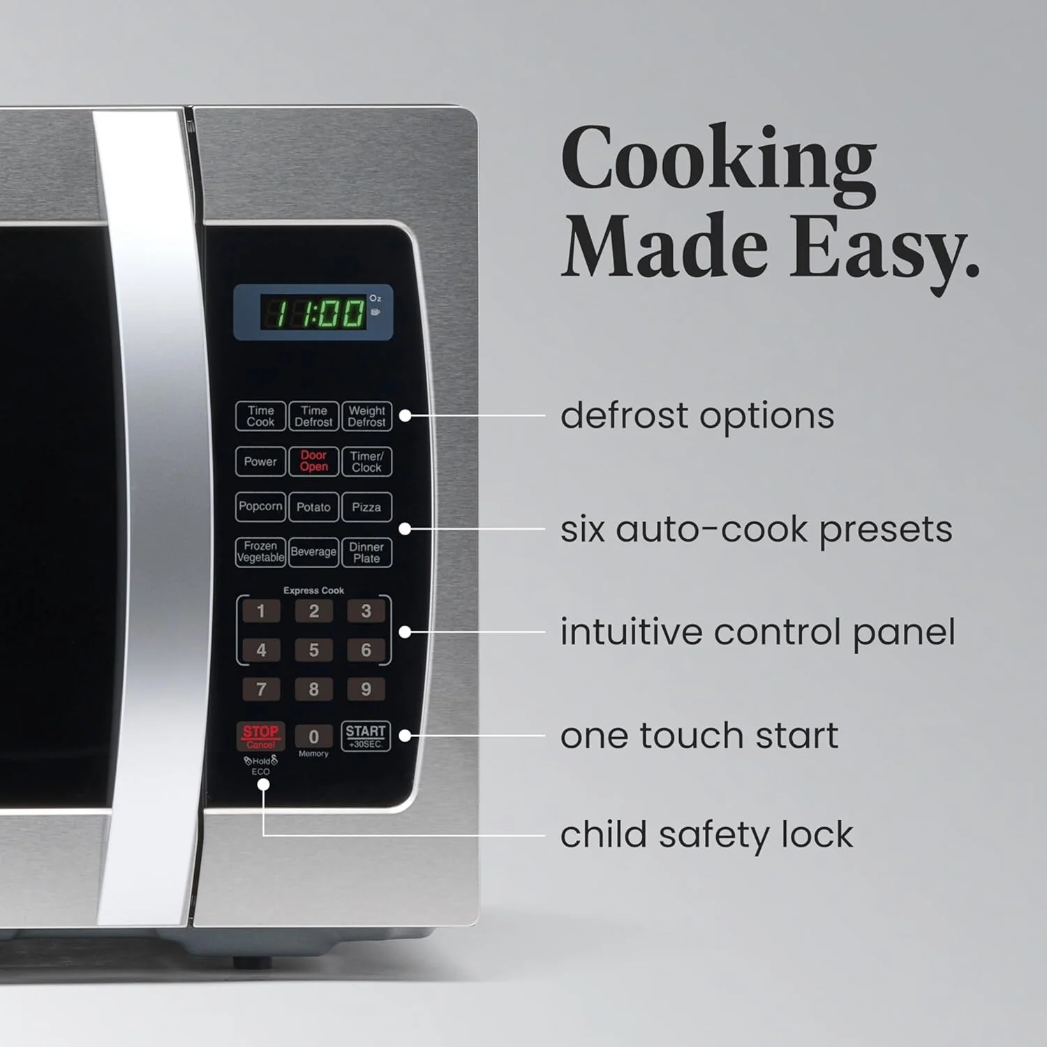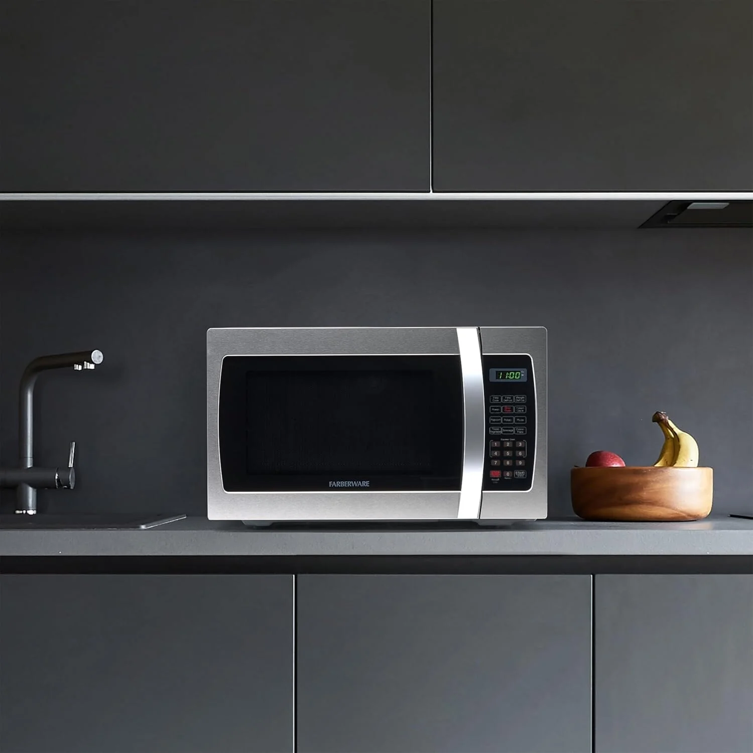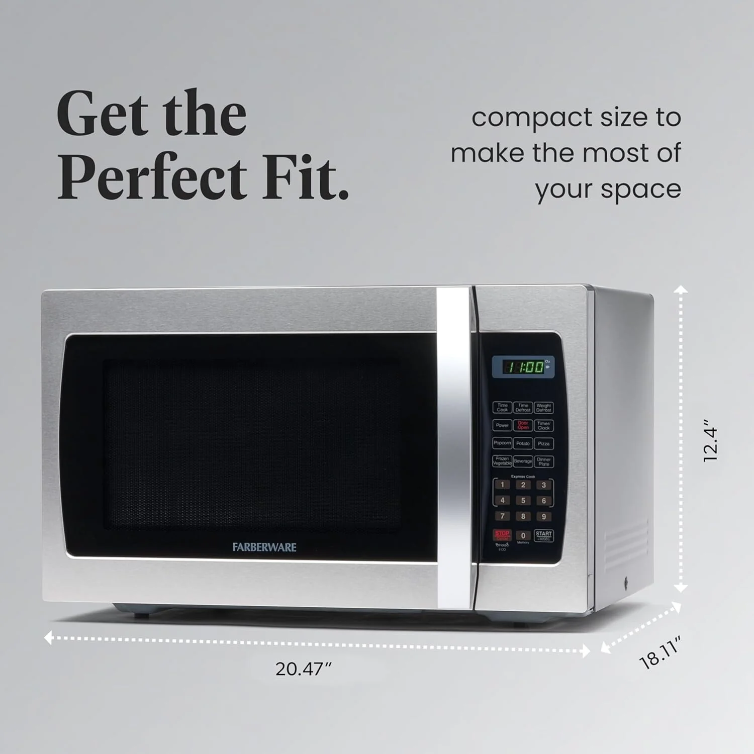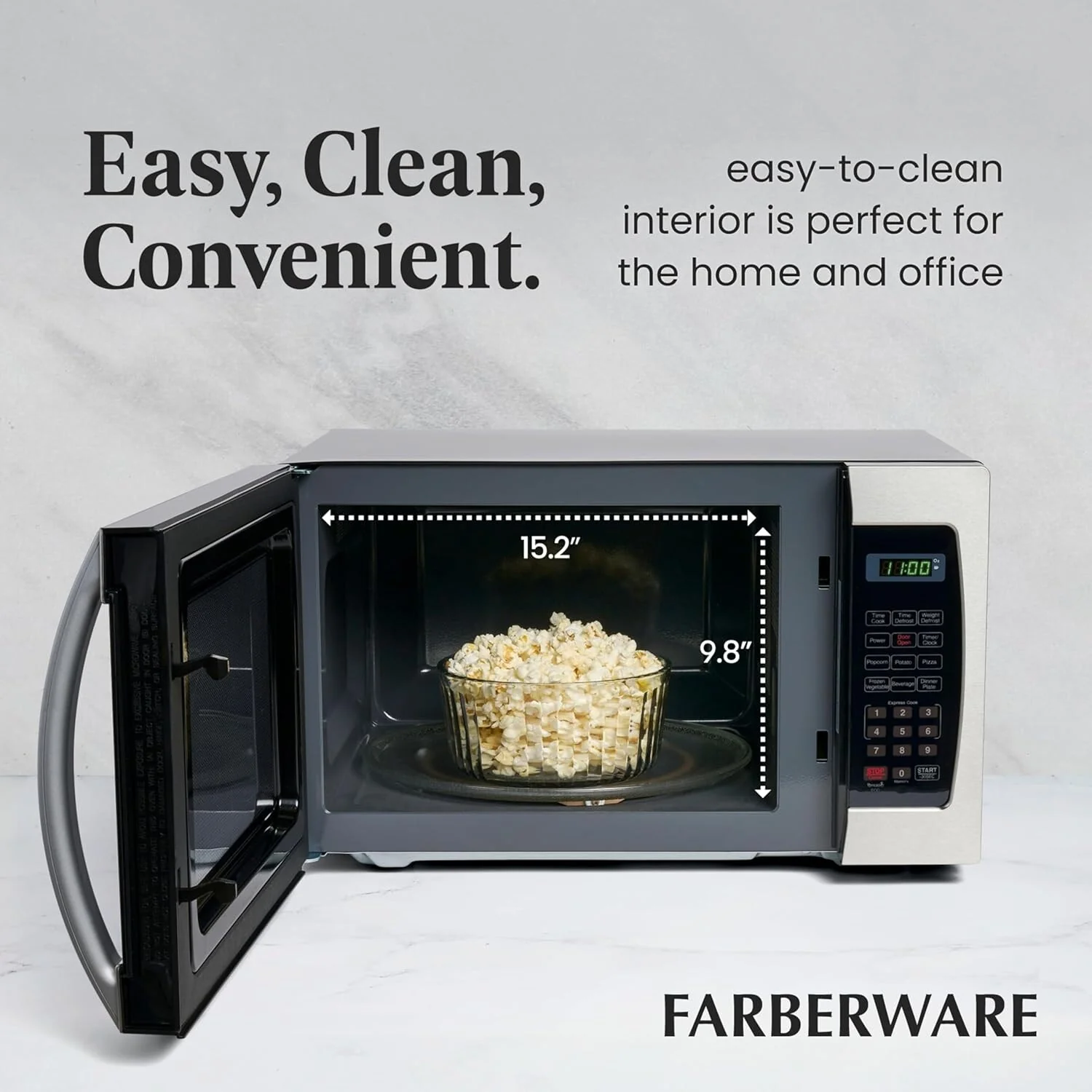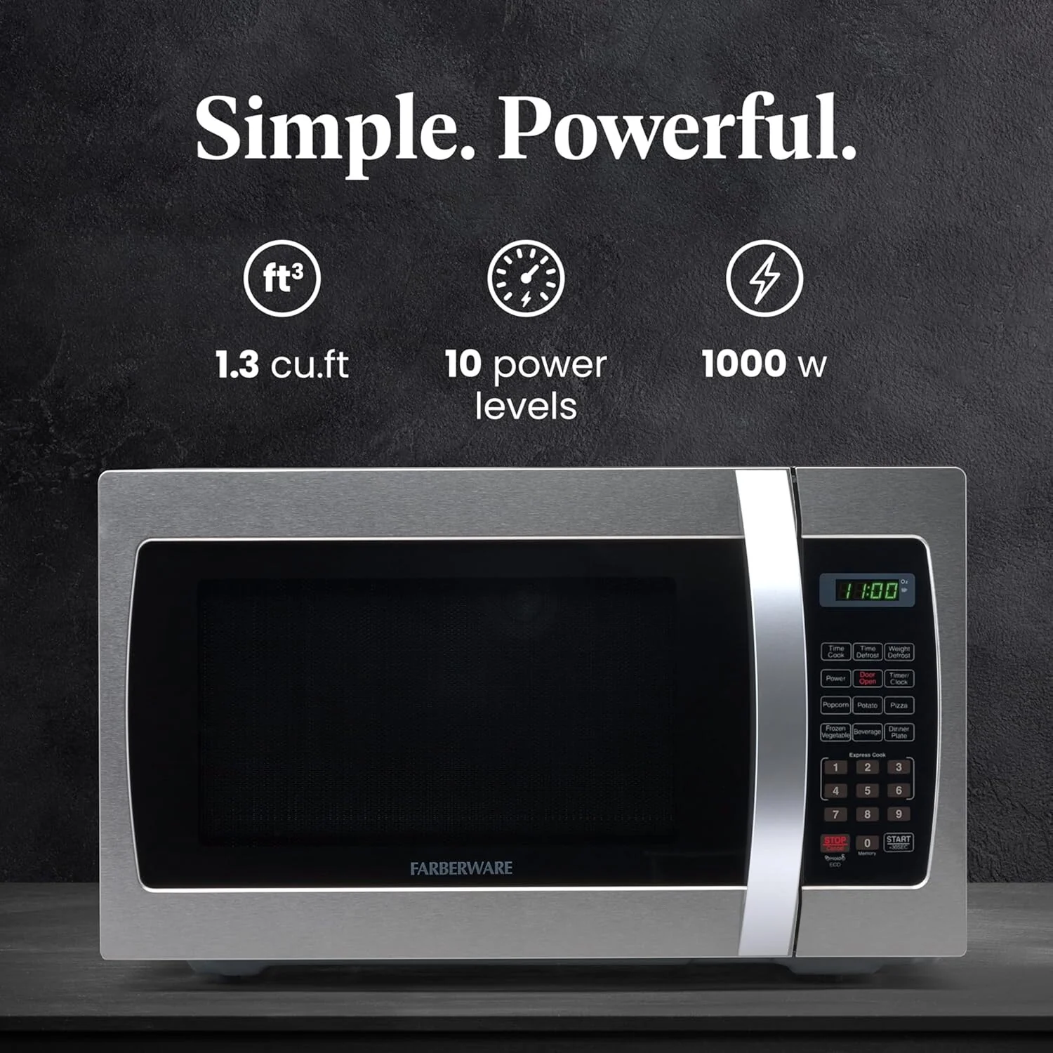 CONVENIENT MICROWAVE: Prepare quick and easy meals in a snap with our powerful microwave. It packs 700 of output power and features a range of settings for press-and-go speed. POWERFUL SETTINGS: This microwave has ten power levels with multi-stage cooking. You can fully customize your cooking with six one-touch options, including popcorn, potato, and pizza. Defrost by weight or by time settings to make quick work of any task. PERFECT SIZE: Measuring 1.3 cu ft, this microwave is the ideal small-space solution that offers full-sized cooking in a compact space. It features an easy-to-clean interior and exterior and is perfect for the home or office. ALL YOU NEED: This microwave has a clear LED display with a kitchen timer and clock that lets you easily keep track of time. Easy-to-view interior lighting lets you keep an eye on your dish, and a child safety lock adds additional security. FARBERWARE: From weeknight favorites to family feasts they'll never forget, Farberware helps today's families craft the meals that make memories and bring everyone together.