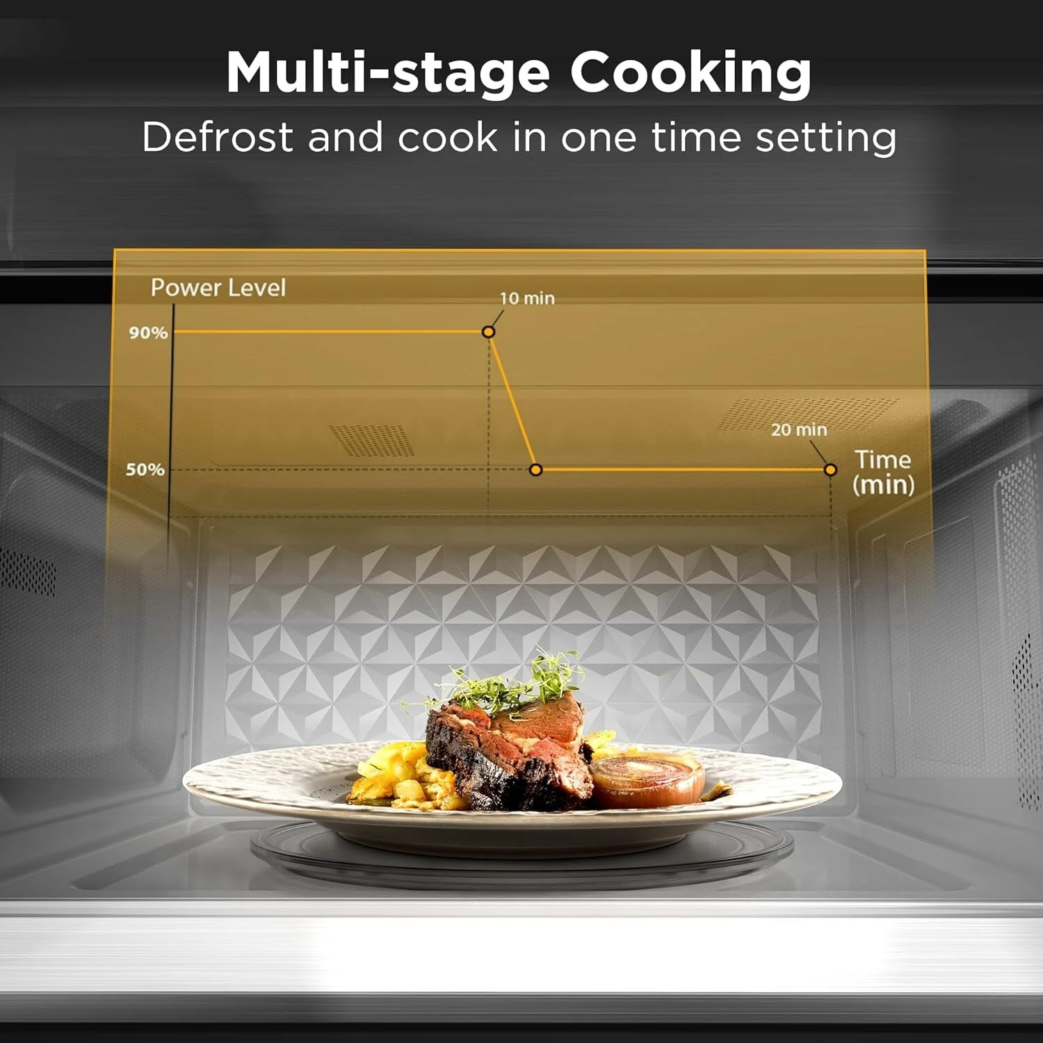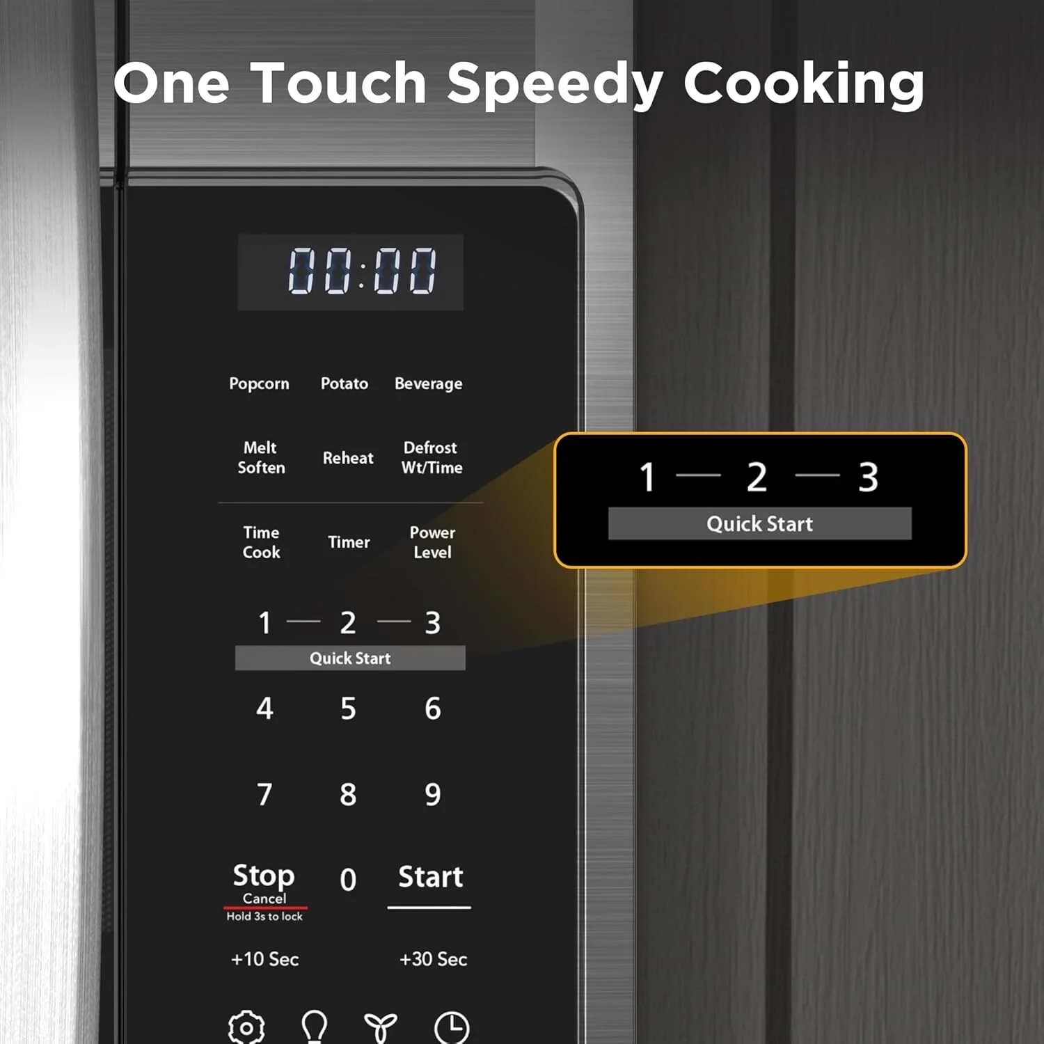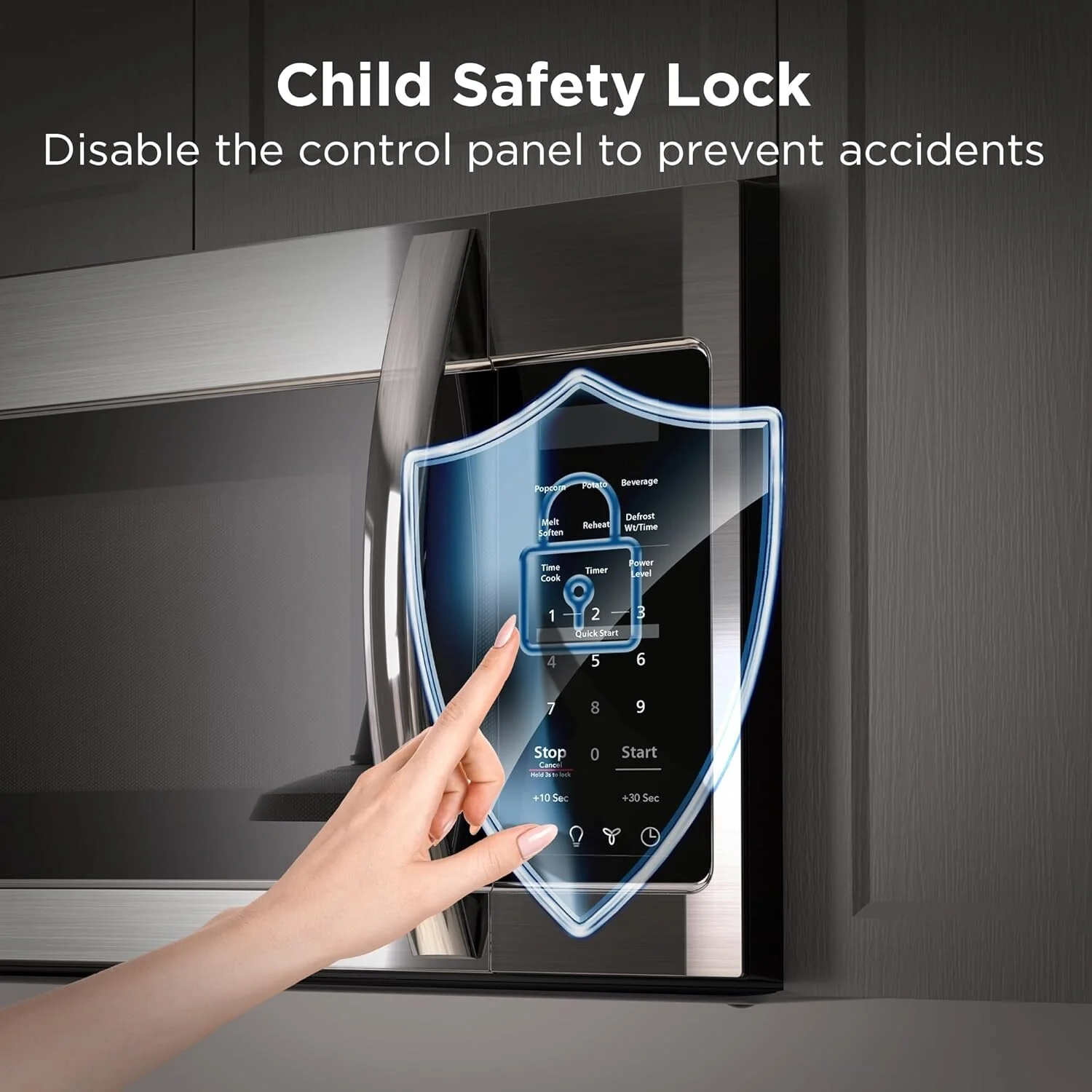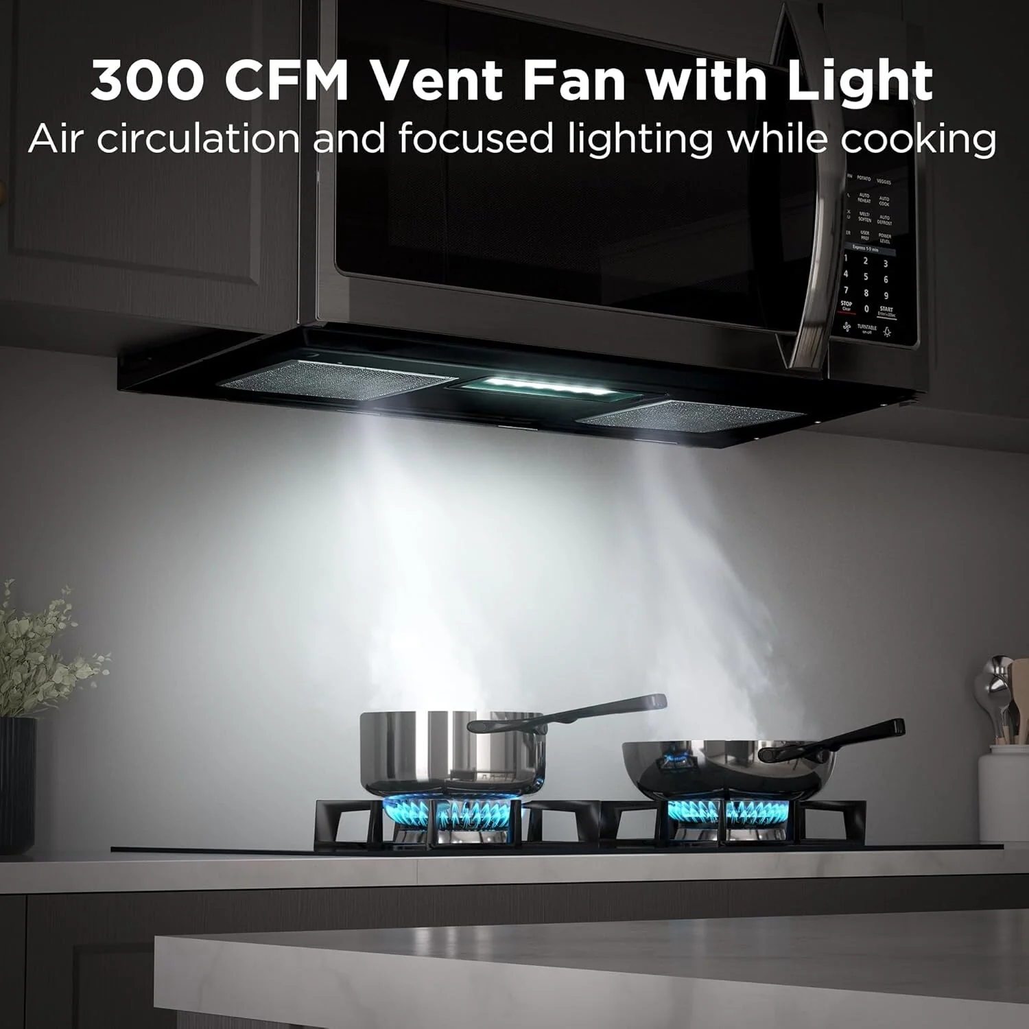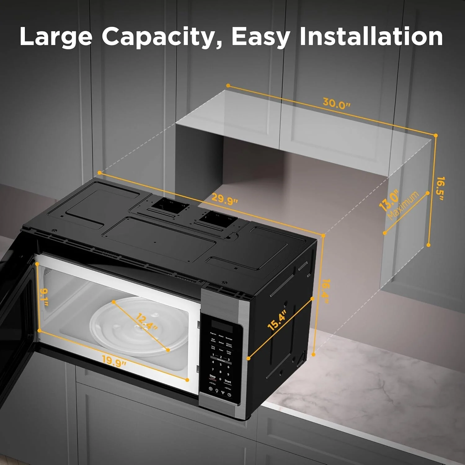 Large Capacity: 15.4'D x 29.9'W x 16.4'H. Featuring a spacious interior, this 1.7 cubic feet microwave oven includes a 12.4-inch turntable and will serve as your top sous chef for any meal or cooking adventure. 10 Cooking Levels: With aa 1000-watt output, this over-the-range microwave oven has 6 quick menus for your daily meals, including settings for Popcorn, Beverage, Melt/Soften, Reheat, and Defrost. Speedy Cooking: For quick action, press numbers 1, 2, or 3 for using the 100% power level at 1-3 minutes. Multi-stage Cooking: Save time by cooking with 90% microwave power for 10 minutes and then cooking with 50% power for 5 minutes in one time setting. 300 CFM Vent Fan with Light: With a 2-speed strong suction, the powerful vent on this stainless steel microwave helps to remove fumes and odors while an integrated light offers focused lighting while cooking.