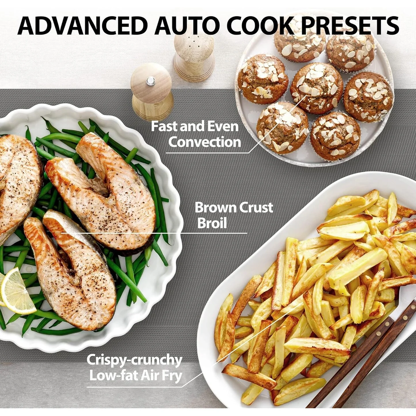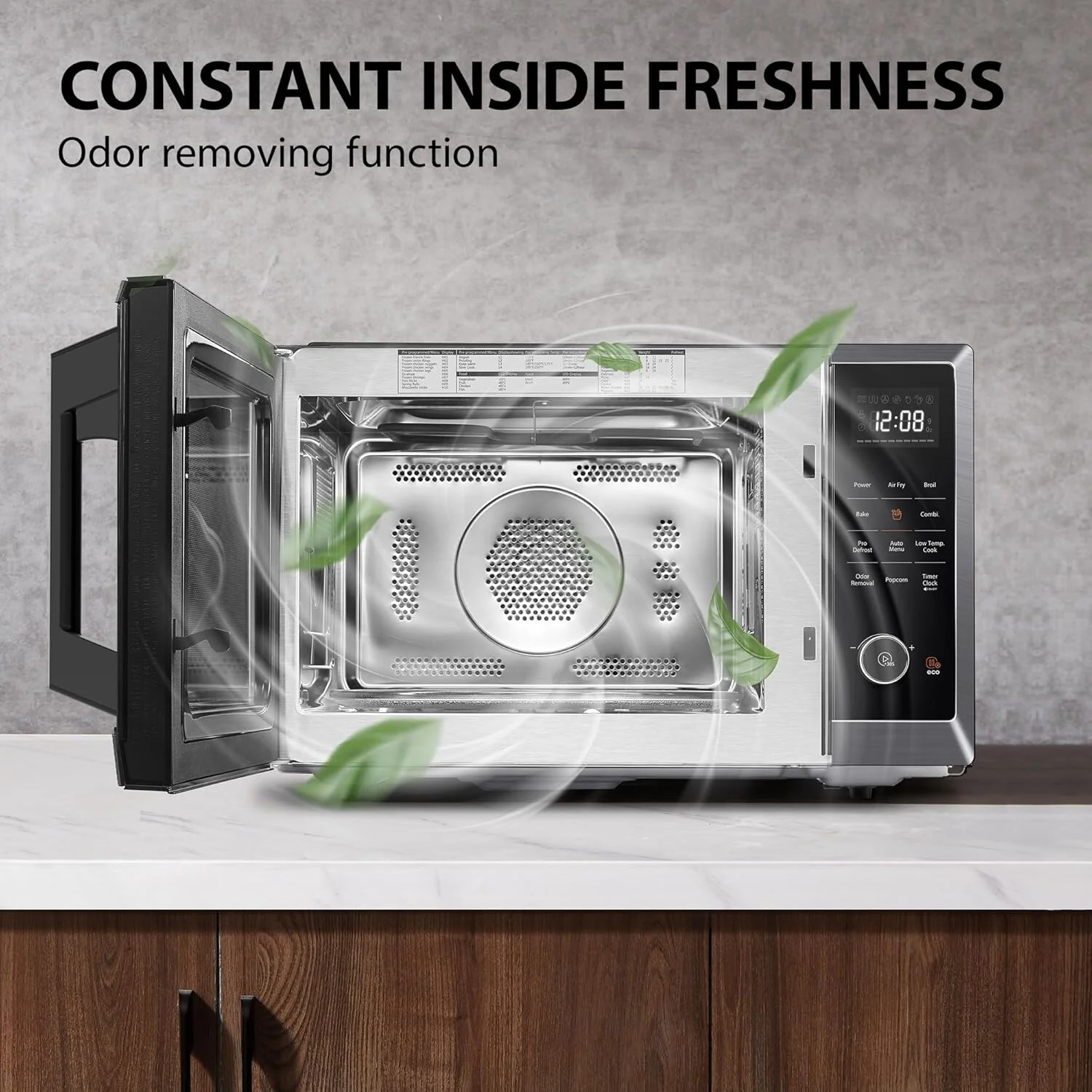 Two-Step Child Lock: This mandatory safety feature for microwaves helps prevent unintended use by younger family members, plesase open the machine according to the steps shown in the figure. 8-in-1 Multifuntional Microwave One microwave with multi-functions of microwave, air fry, bake(convection), broil (grill), combi., low temp., odor removal, defrost can fulfill more usages. Healthy Air Fryer Microwave Combo: Enjoy your wholesome fried food with original taste but less fat with healthy air fry. Microwave output power 1000 watts, input power 1600 watts. External dimension (WxDxH): 20.6*18.0*11.8 inches, internal dimension (WxDxH):14.0*13.2*9.5 inches, 12.4-inch position memory turntable Compact Size but Large Capacity & Powerful: Small Footprint as Kitchen Essential, 12.4inch removable turntable can fit a whole roasted chicken, 12 inch pizza and 8*4 inch casserole, offers the perfect balance of size and convenience. Convenience Features with One-touch popcorn, easy-to-turn knobs, position memory turntable, speedy cooking, multistage cooking, clock and kitchen timer, mute function. Stylish Appearance Classic black stainless steel finishes with easy to clean stainless steel interior