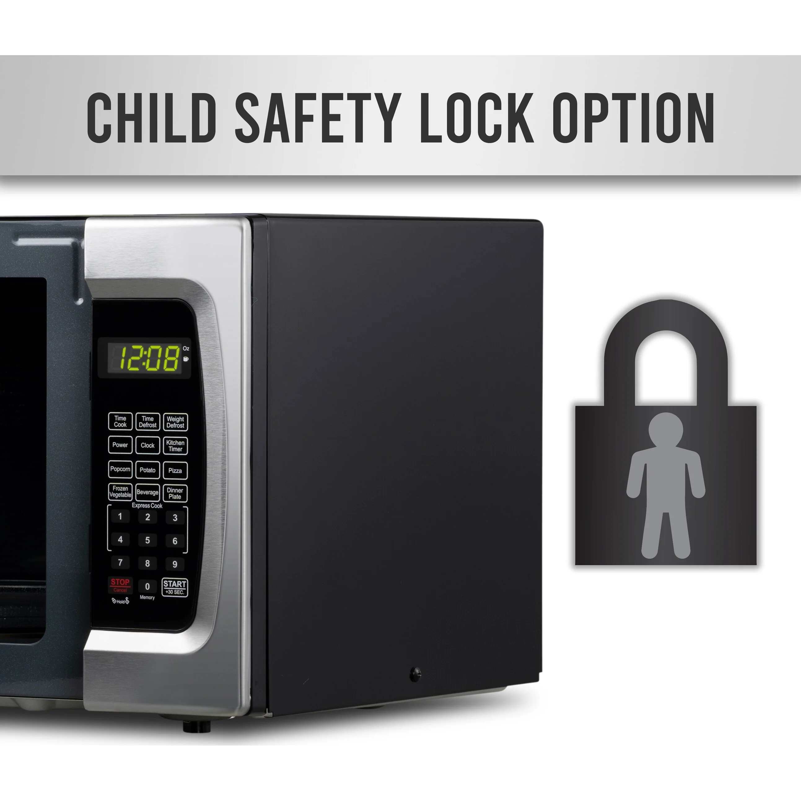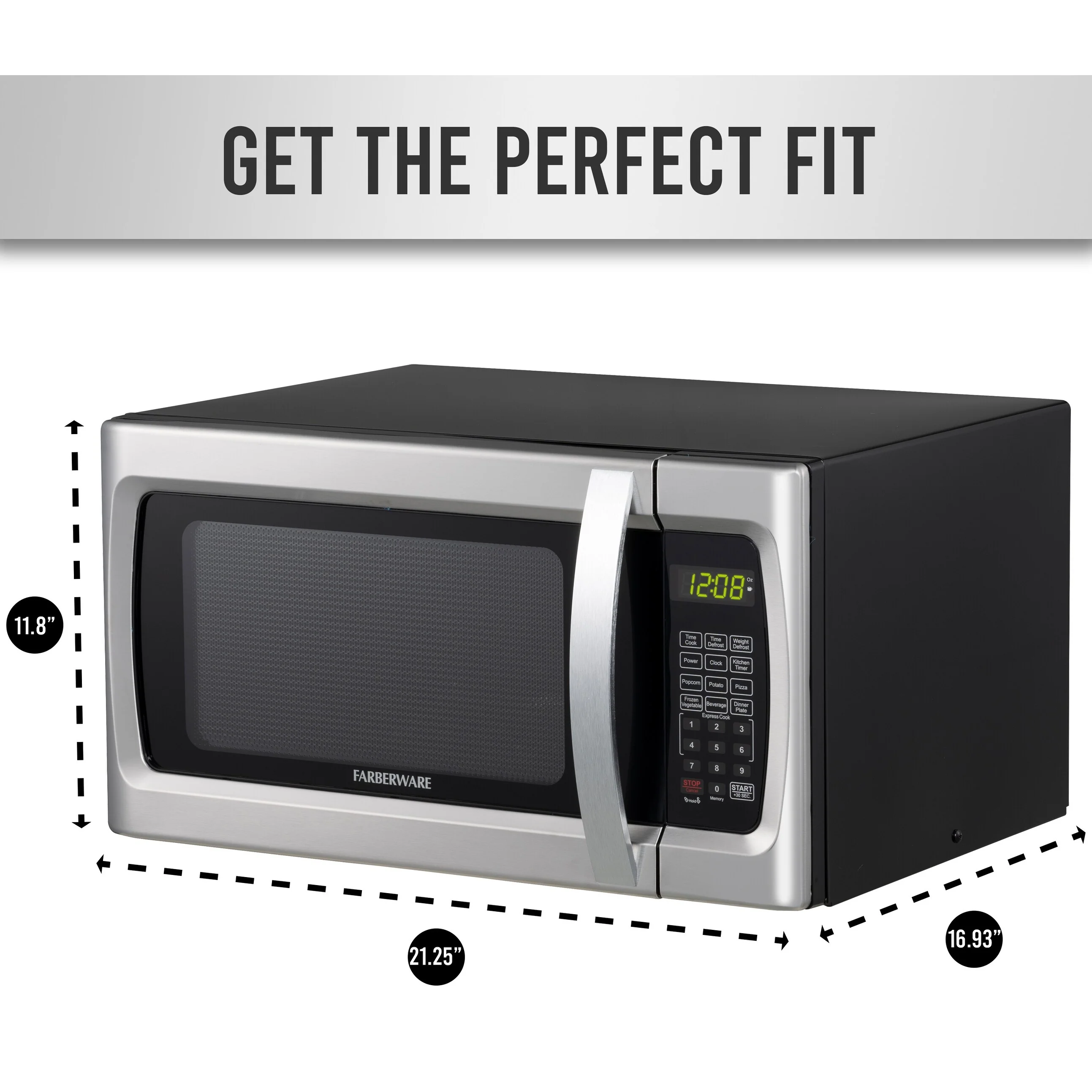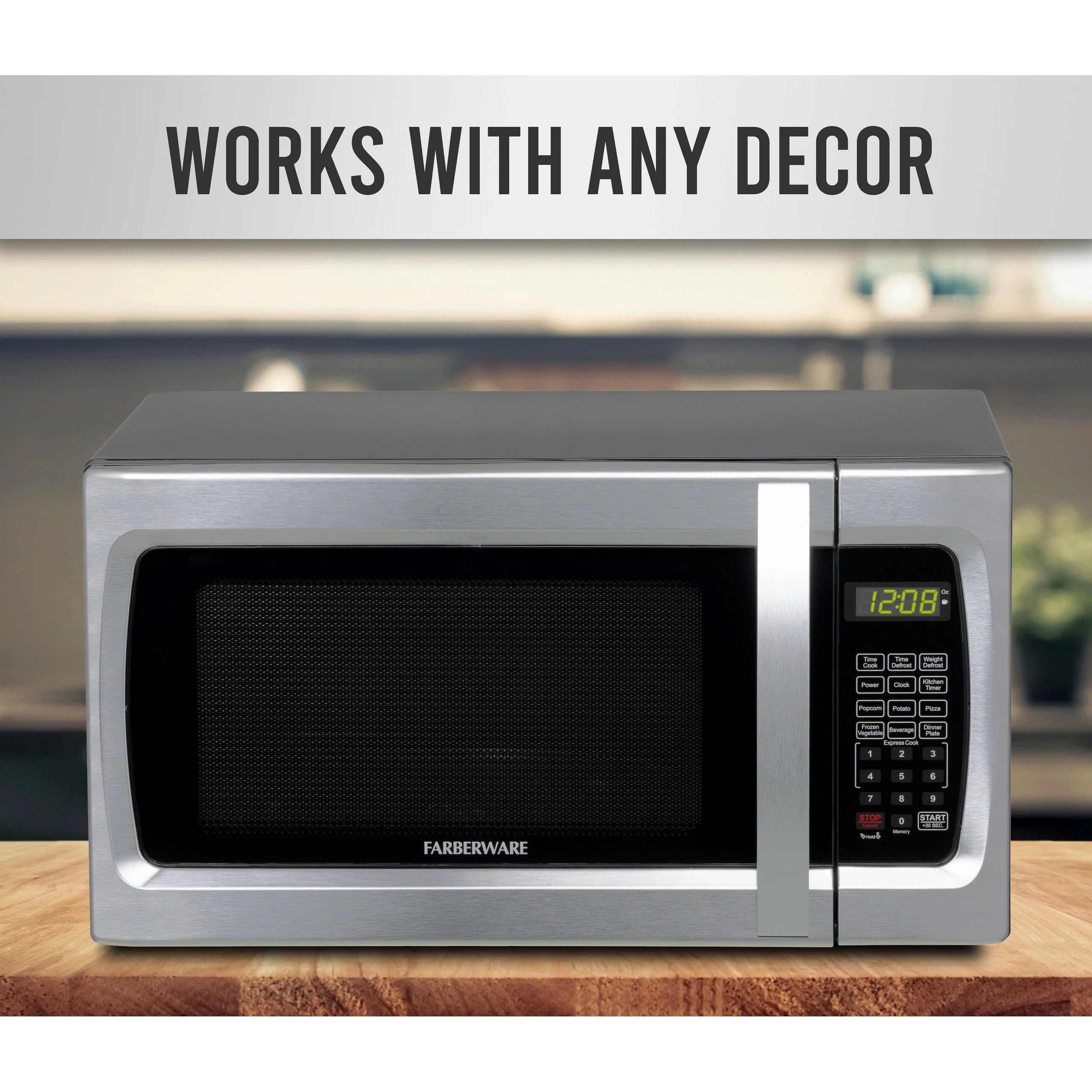 Farberware Professional 1.1 Cu. ft 1000-Watt Microwave Oven in Stainless Steel delivers power, style and convenience with a sleek design to complement your kitchen. Features include 10 power levels and a Memory Function that stores and recalls your preferred cooking settings. The Farberware Classic offers an easy to operate digital interface with 1-6 minute Express Cook buttons, time or weight based defrost controls, +30-Seconds control, as well as six pre-programmed cooking functions for popcorn, pizza, a dinner plate and more. Multi-Stage cooking means that you can set the power level to adjust during the cooking cycle for perfect results without interruption. The LED display provides a clock and kitchen timer. With a generous 1.1 Cubic Foot cooking capacity, 1000 Watts of power, and a rotating turntable, the Farberware Classic is the perfect multi-tasker for your kitchen.