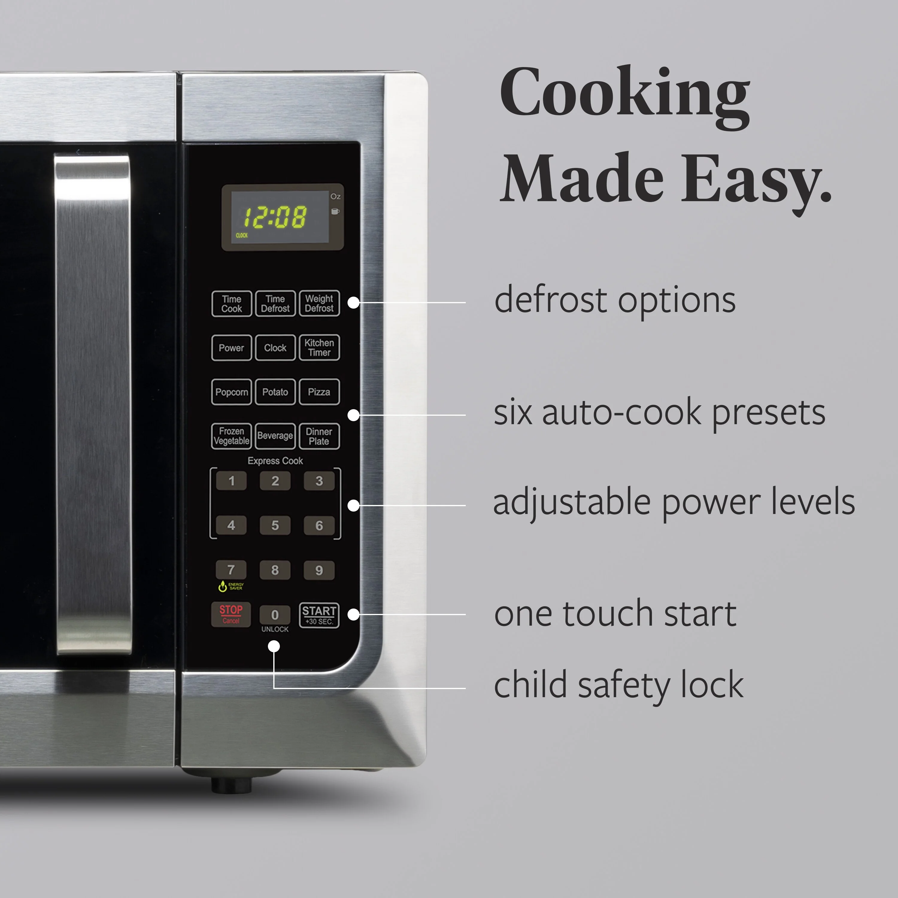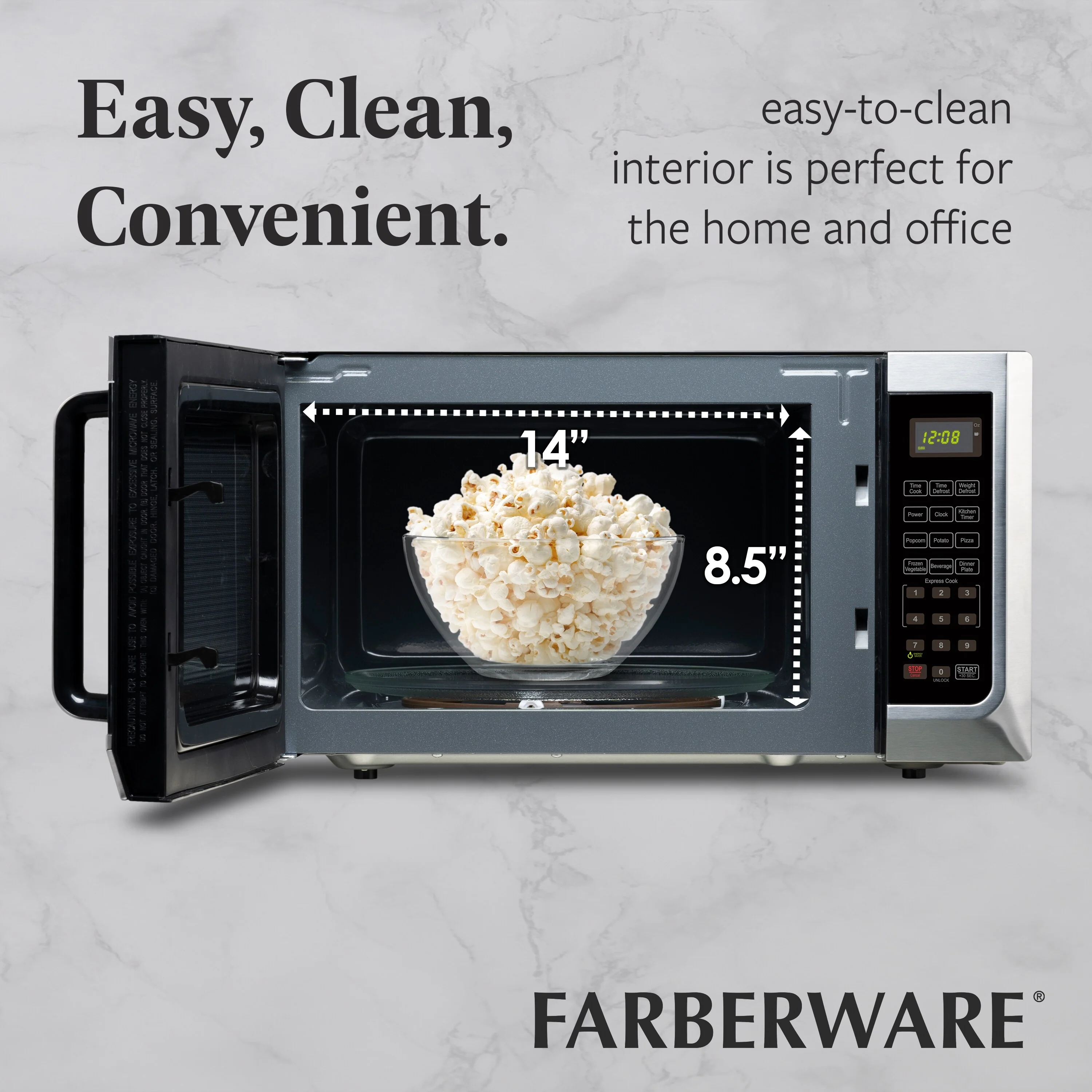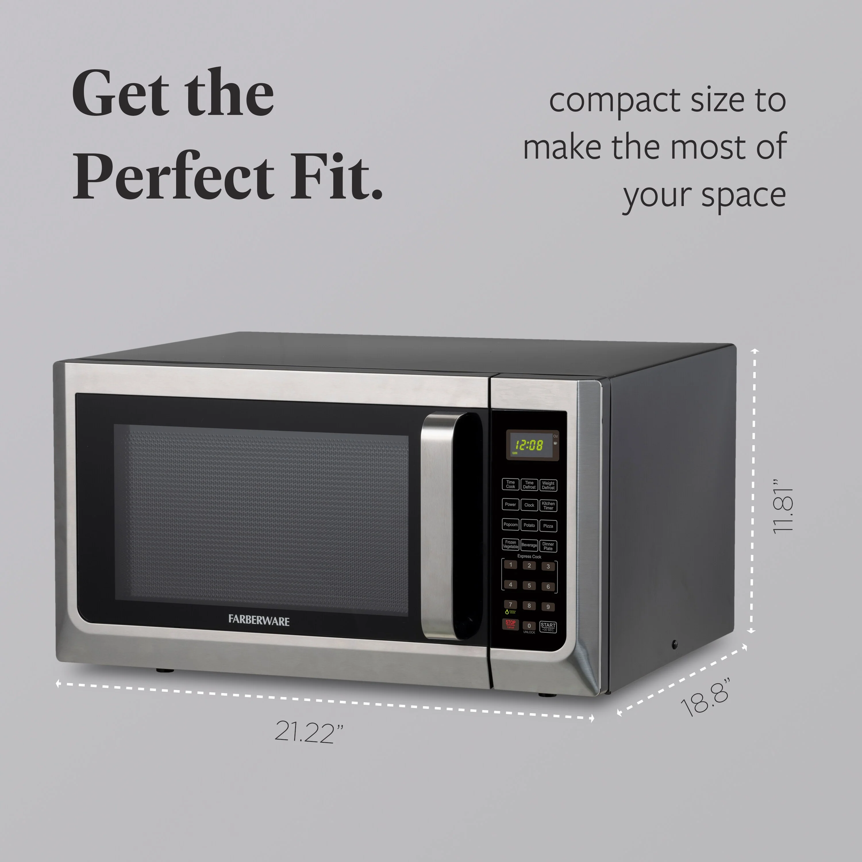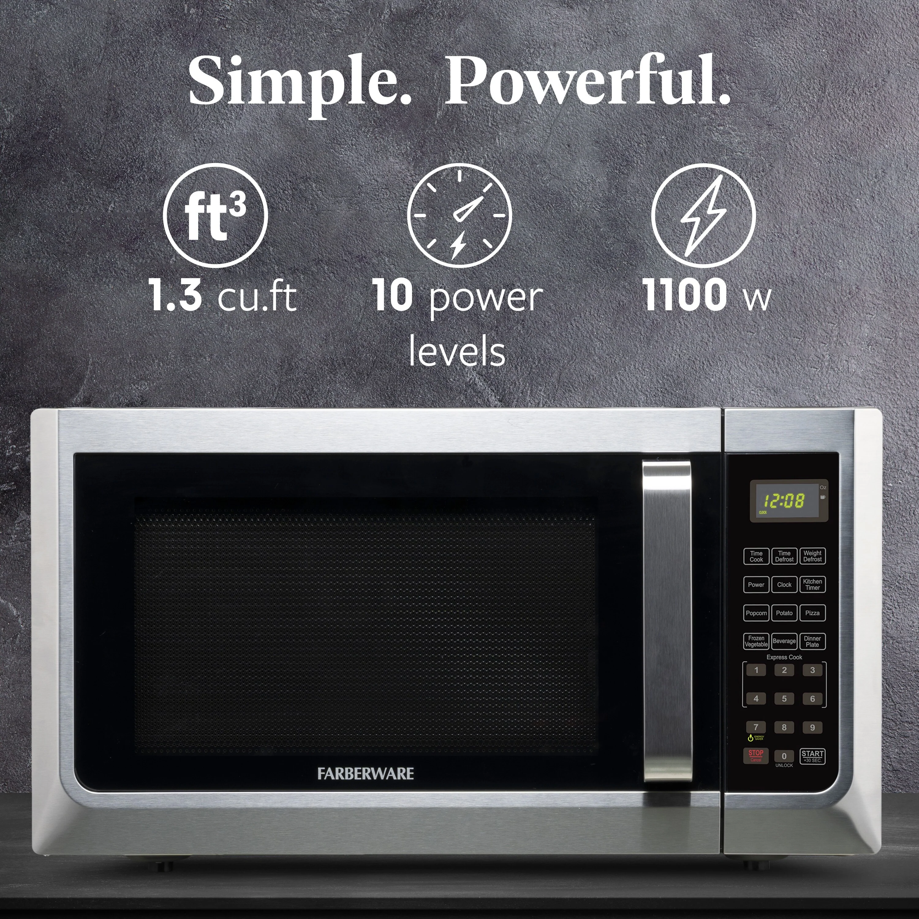 Farberware Professional 1.3 Cu. ft 1100-Watt Microwave Oven in Stainless Steel delivers power, style, and convenience with a sleek design to complement your kitchen. Features include 10 adjustable microwave power levels and a Memory Function that stores and recalls your preferred cooking settings. The LED display provides a clock and kitchen timer. The Farberware Classic offers an easy to operate digital interface with 1-3 minute Express Cook buttons, time or weight based defrost controls, +30-Seconds control. Also includes the 6 pre-programmed cooking functions for popcorn, frozen pizza, vegetables, and more. The Farberware Stainless Steel Microwave is the perfect multi-tasker for your kitchen.