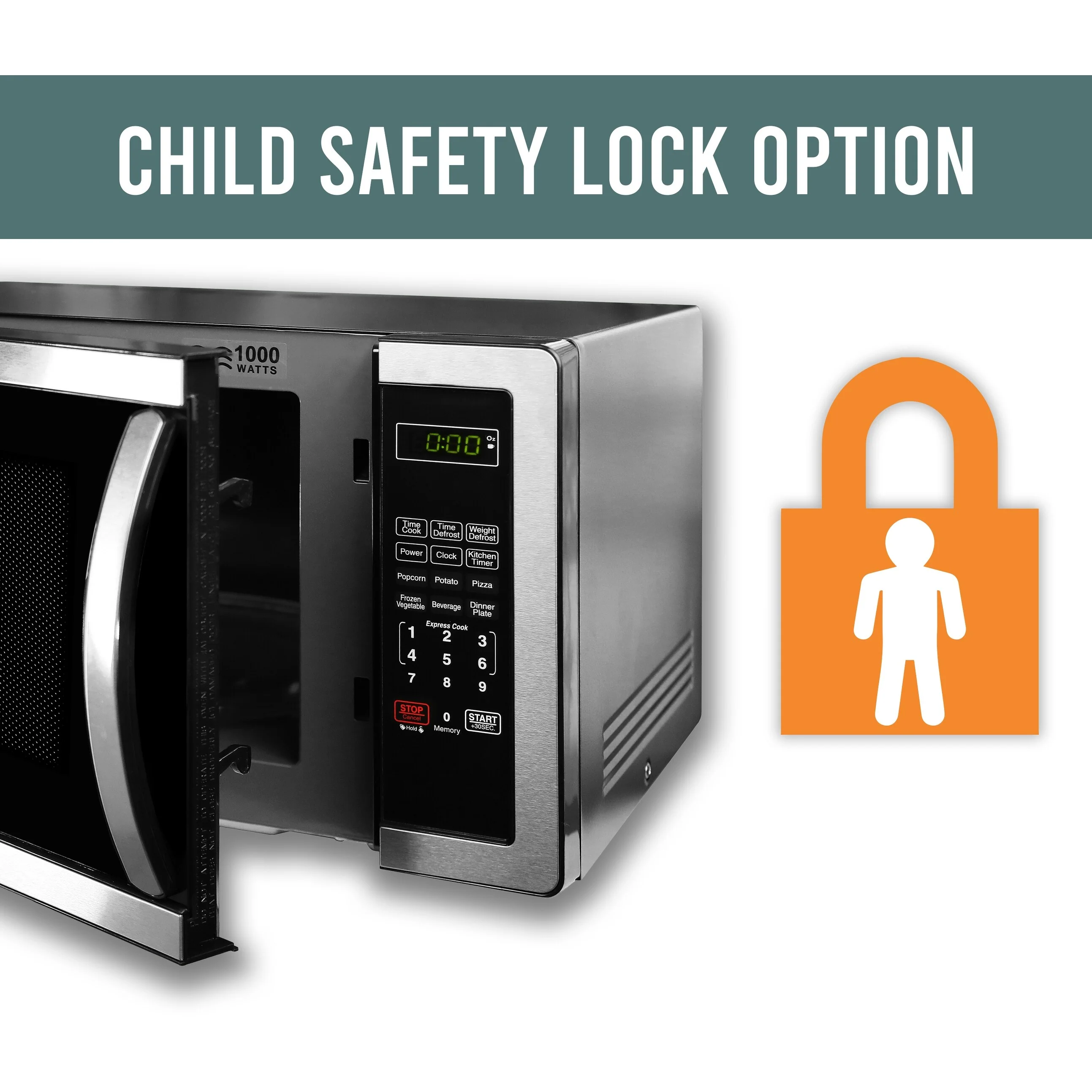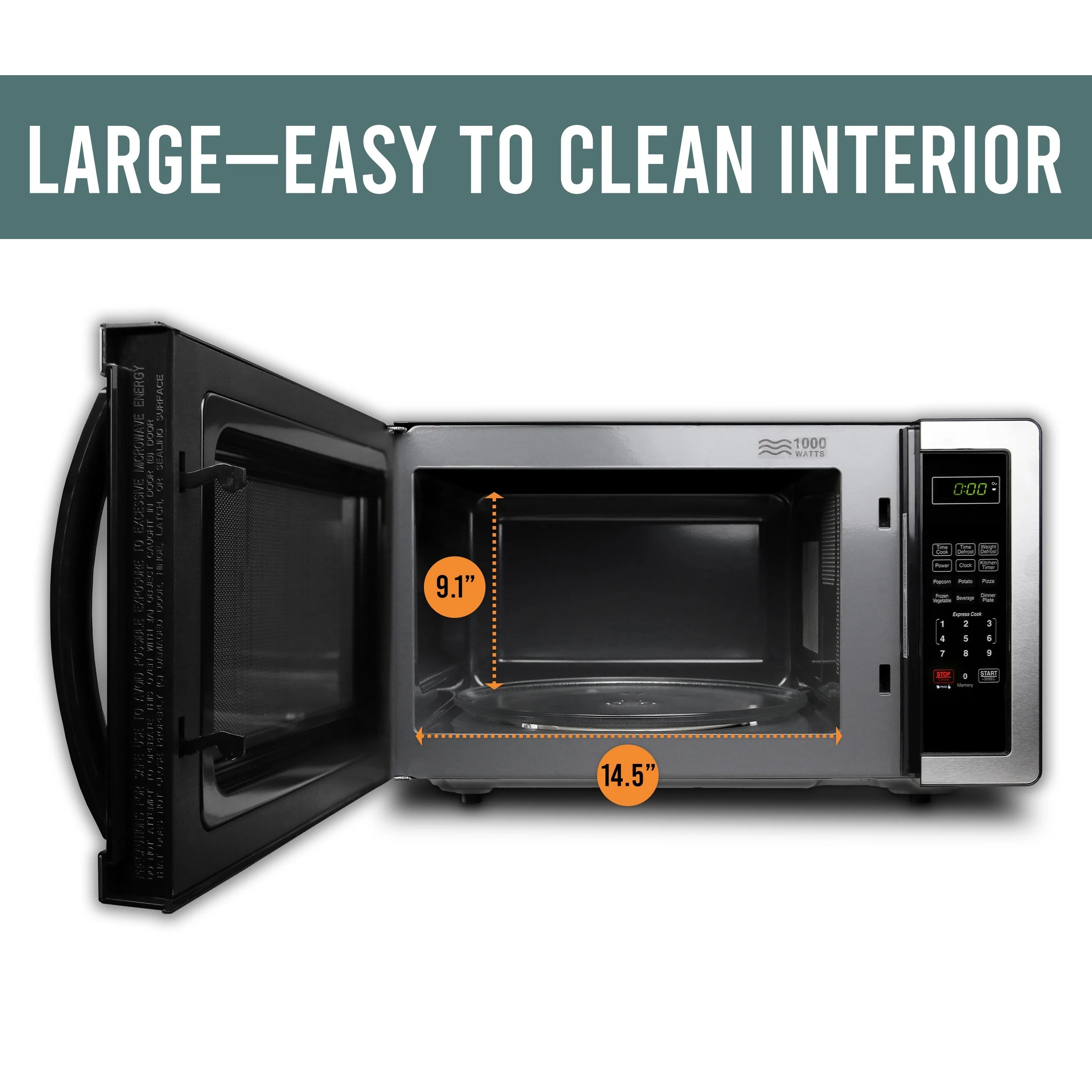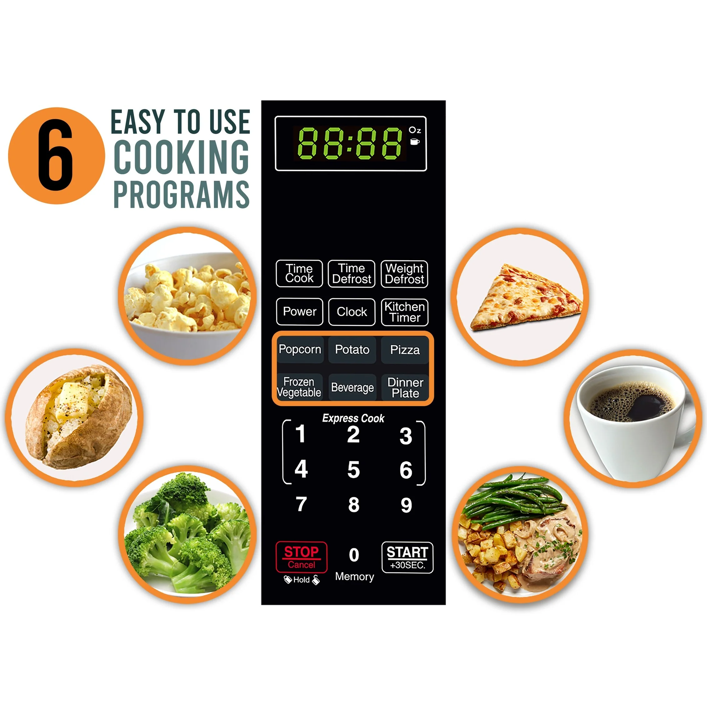 - QUICK & EASY: Prepare meals and snacks in a snap with this compact microwave that packs 1000 Watts of output power. 1-6 min. Express cooking and plus 30 sec. Button offer simple press-and-go speed while the memory function lets your store your most used customized settings