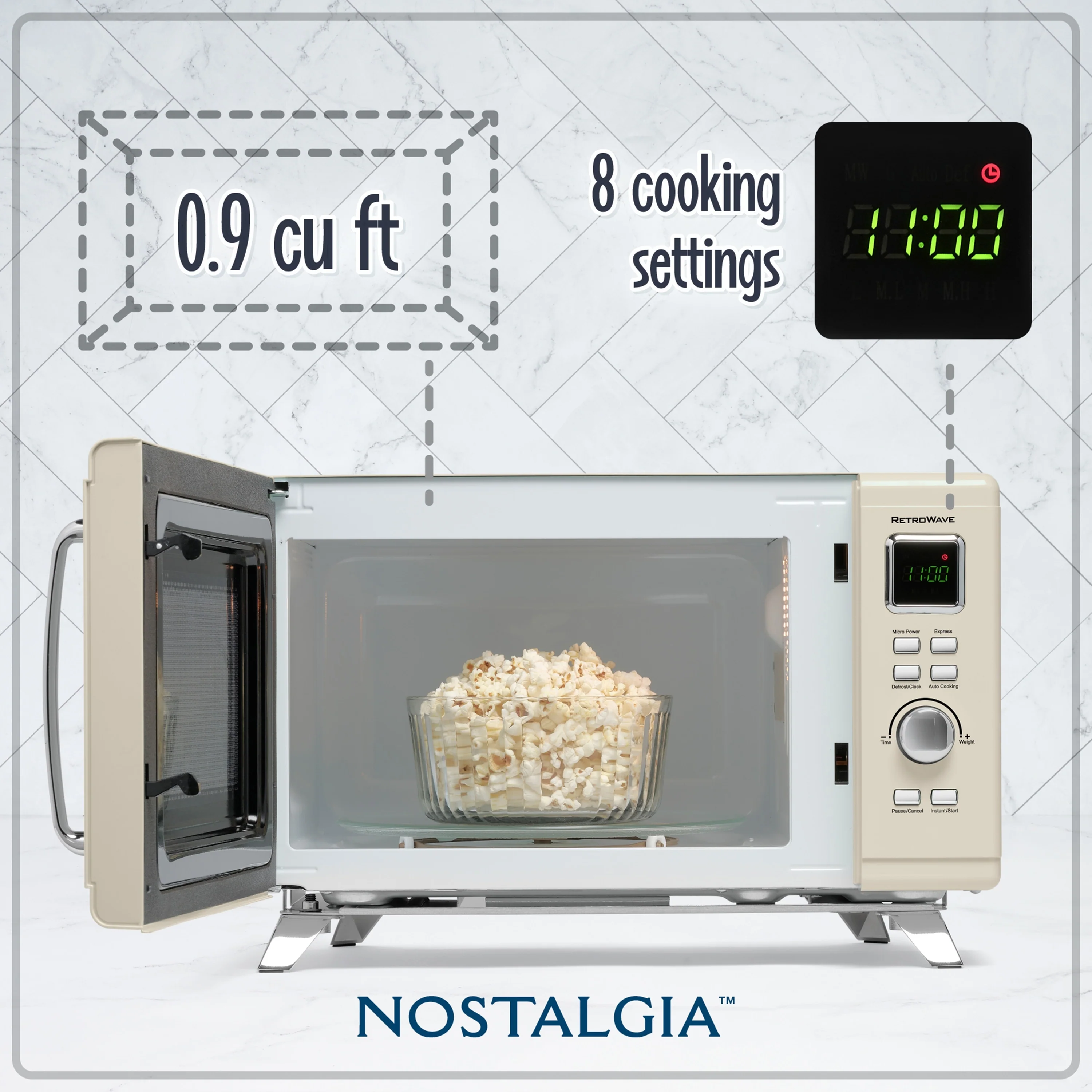 This 0.9 cubic foot microwave still has all the conveniences of modern microwaves, while still staying true to its clean and sleek mid-century design. It features 8-pre programmed cooking settings, a rotating carousel, a bright LED display, and 5 power levels, : Instant/Start, Express Cooking, and Defrost,�� ideal for reheating leftovers or cooking food. The programmable LED clock and child-lock feature makes this kitchen appliance a must-have for any home. �