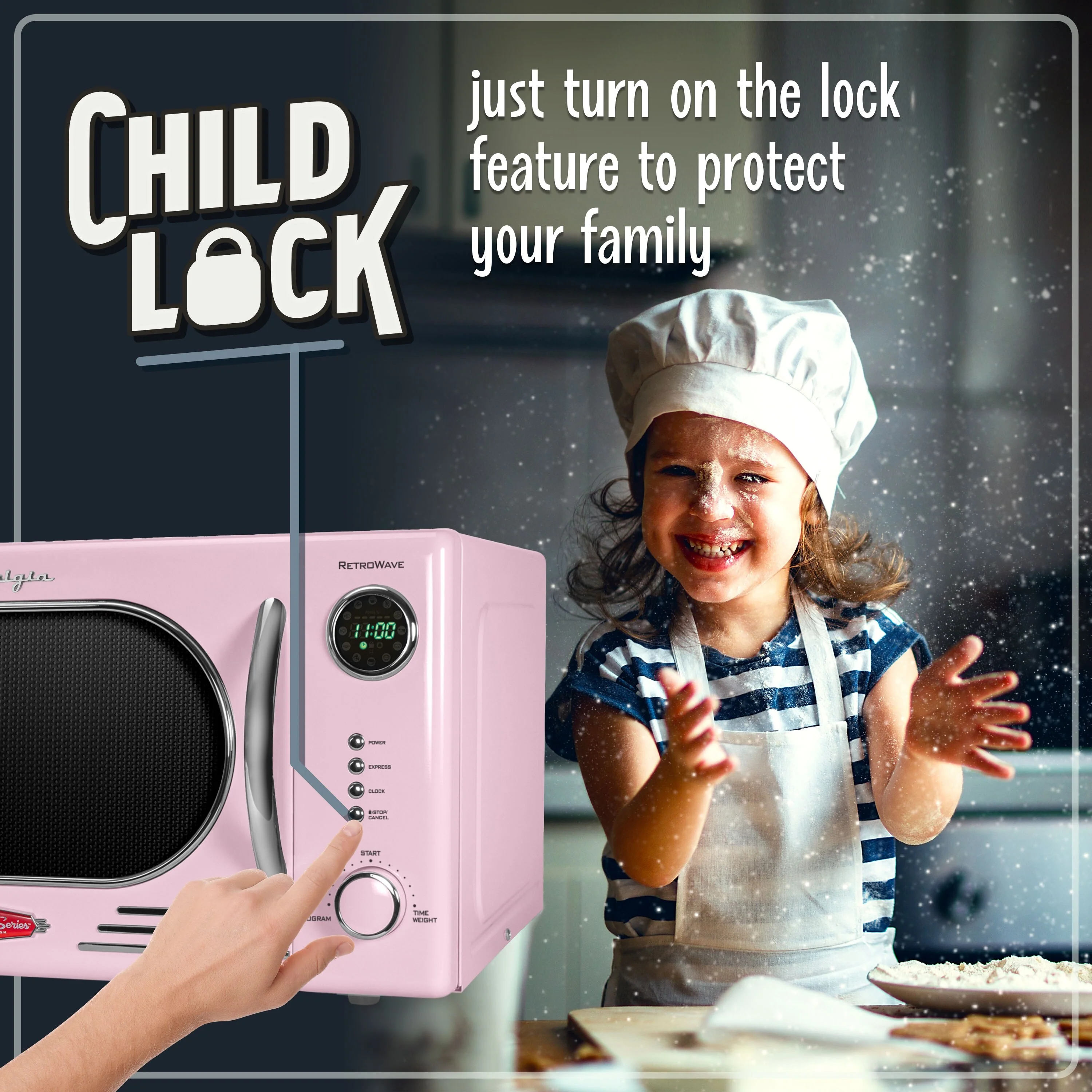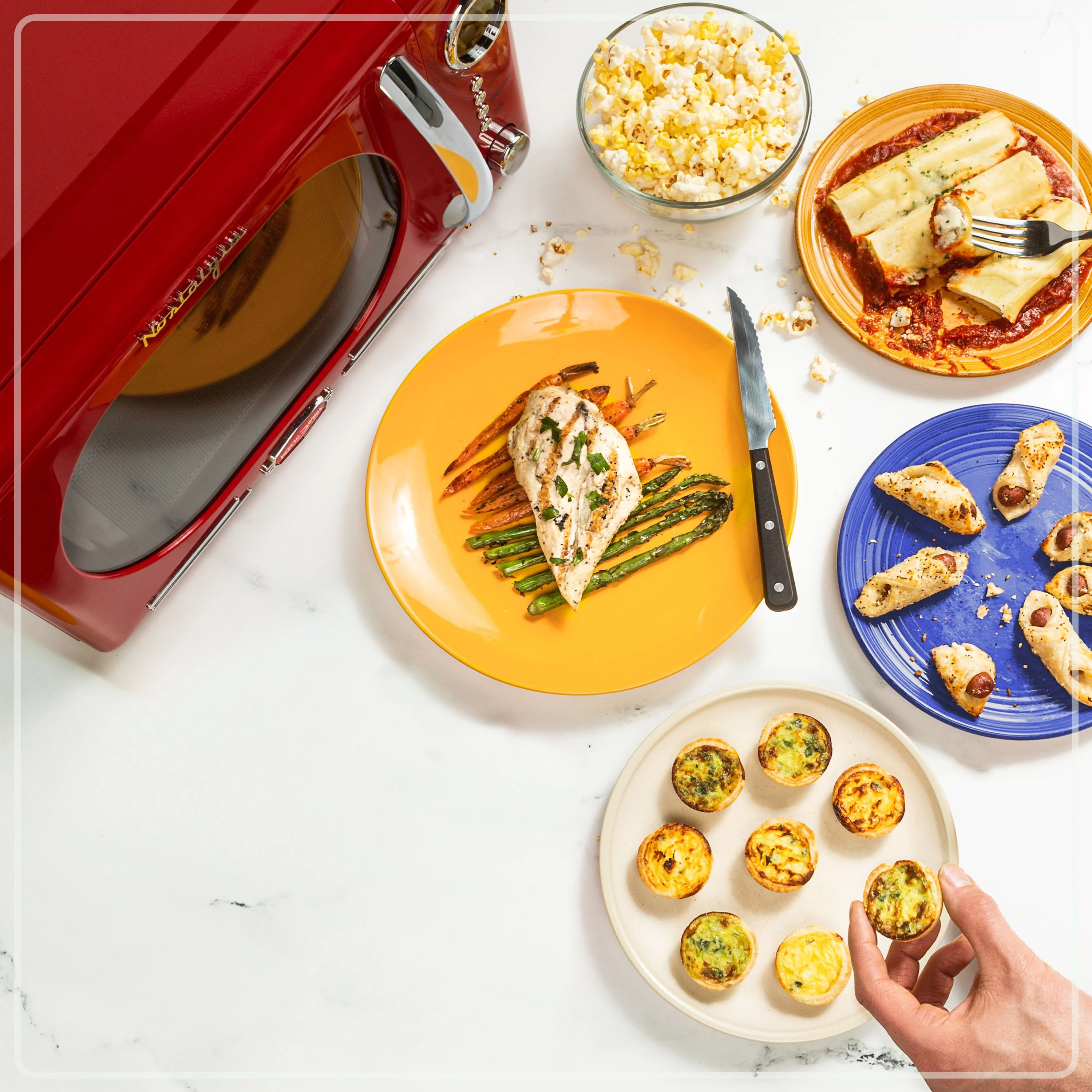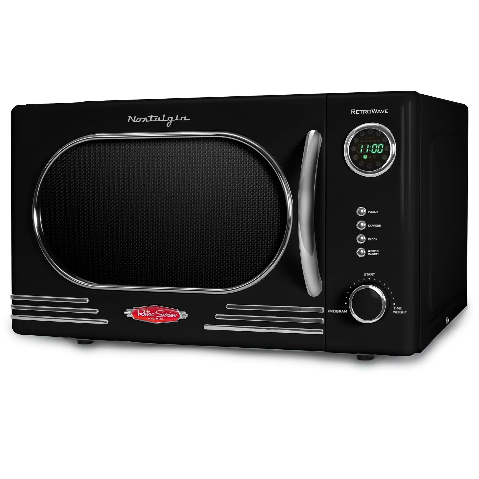 Add vintage charm to your kitchen with the Nostalgia Retro Countertop Microwave Oven. With its sleek retro design and 1000 watts of cooking power, this microwave combines both style and functionality. It features 12-pre programmed cooking settings, a glass rotating table for even cooking, a bright LED display, and 5 power levels ideal for all of your cooking needs. The 1.1 cubic feet capacity is perfect for preparing meals of various sizes. Cook with confidence knowing that the 2-action child safety lock will keep everyone safe while operating. Its easy to use, simple to clean, and adds vintage charm to your cooking space.