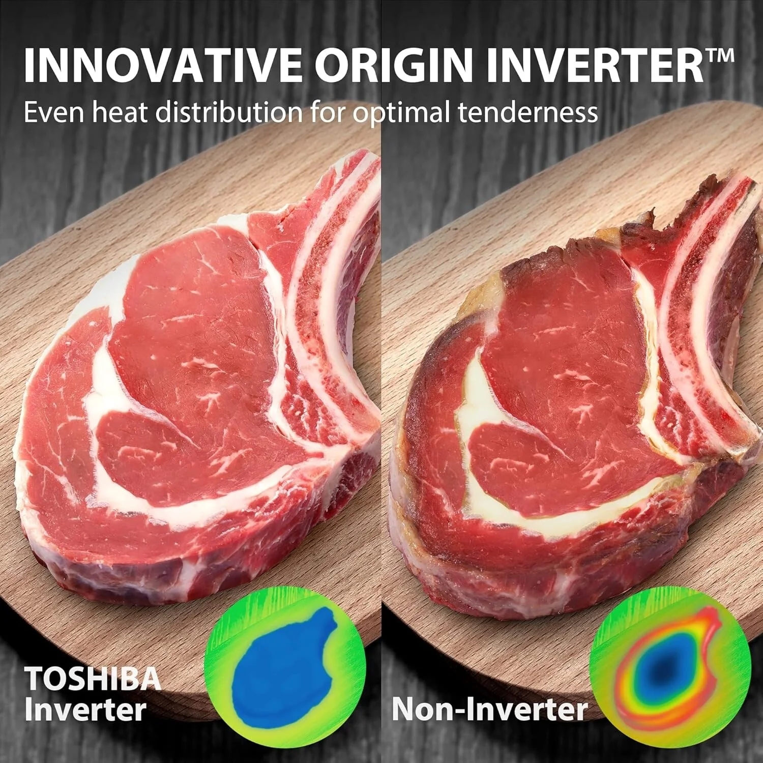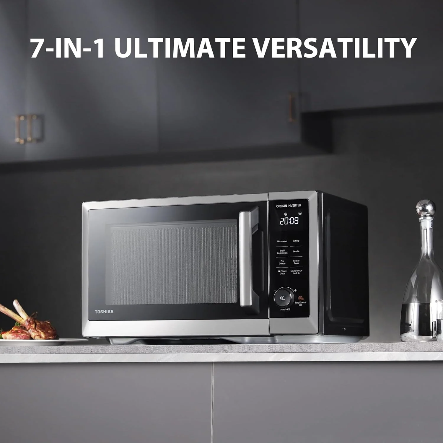 Ultimate Versatility: This multi-microwave with 10 power levels is your ultimate kitchen helper. The versatility as a microwave, air fryer, convection oven, broiler, defroster, toast function and yogurt making function make it your best countertop space-saver Inverter Microwave with Smart Sensor: Built-in humidity sensor intelligently adjusts power and cooking time, make sure your food is never undercooked or overcooked. Inverter Microwave technology also provides even cooking, reheating and defrosting with no cold spots, guarantee the maximum tender texture Less Fat and Crispier: With 360掳 rapid heat circulation technology, TOSHIBA Multi-Microwave with air fryer cuts down on calories by using no added oil while delivering crispier and golden fried food like chicken nuggets, fried fish and French fries. The supplied air fry basket, bake tray and two wire racks are used for optimal air fry results. Speed up Cooking with Combi-Modes: Despite powerful output of 1800W under Convection up to 425掳F and 1000W under Grill, Combi-Modes speed up your cooking with combination of Microwave, convection and grill function, while delivering perfect dishes with crispy, browned outsides and tender texture insides. Discover Amazing Recipes: Comes with an original cookbook with 47 classic recipes. Also, the microwave itself has 6 Auto Menus, 10 Home Fry Menus, 5 Sensor Cook Presets and 6 Defrost Presets, so that novice can also make Michelin-star meals at home. External Dimension: 20.6'W x 16.3'D(18.7'' with handle) x 11.8'H with 12.4' turntable.