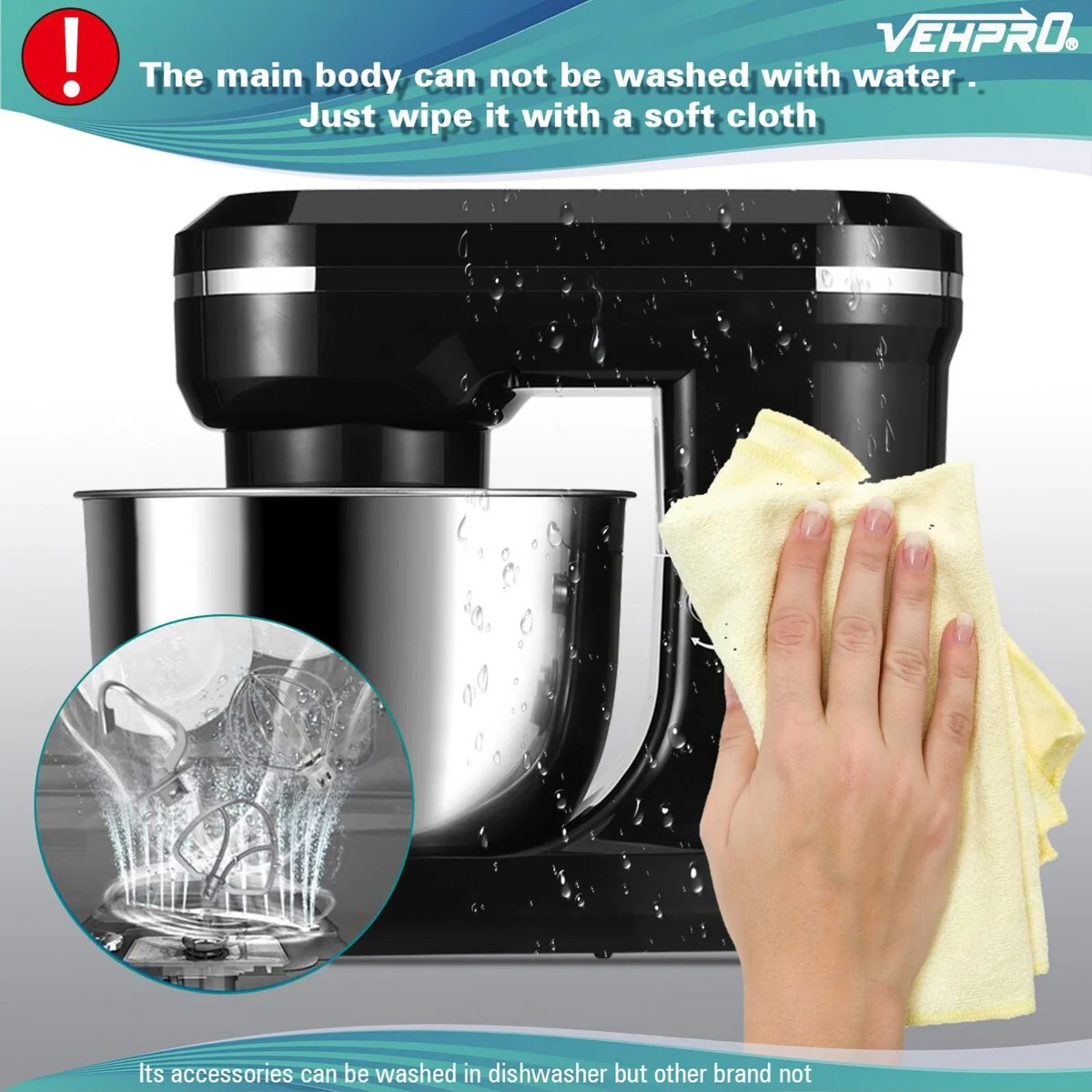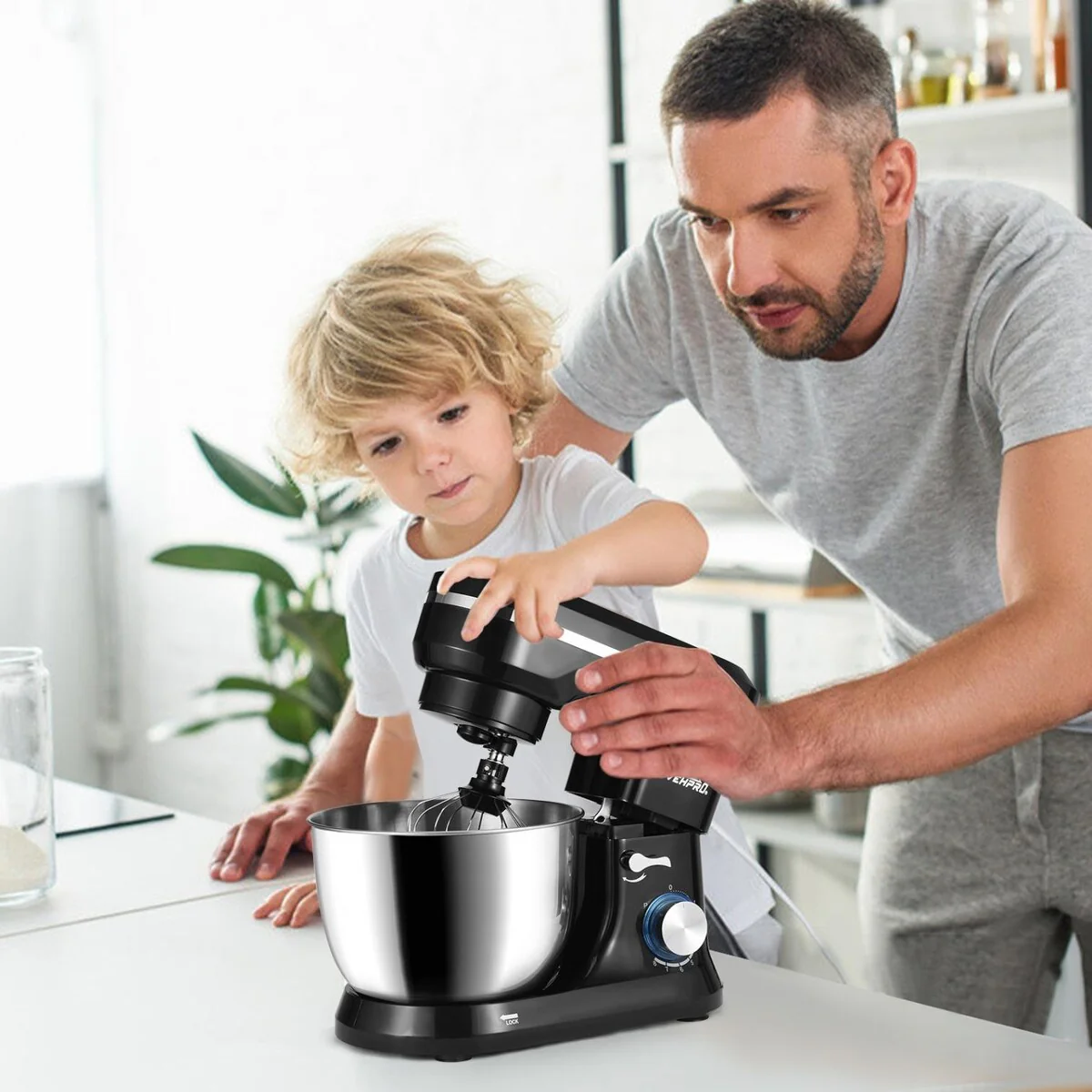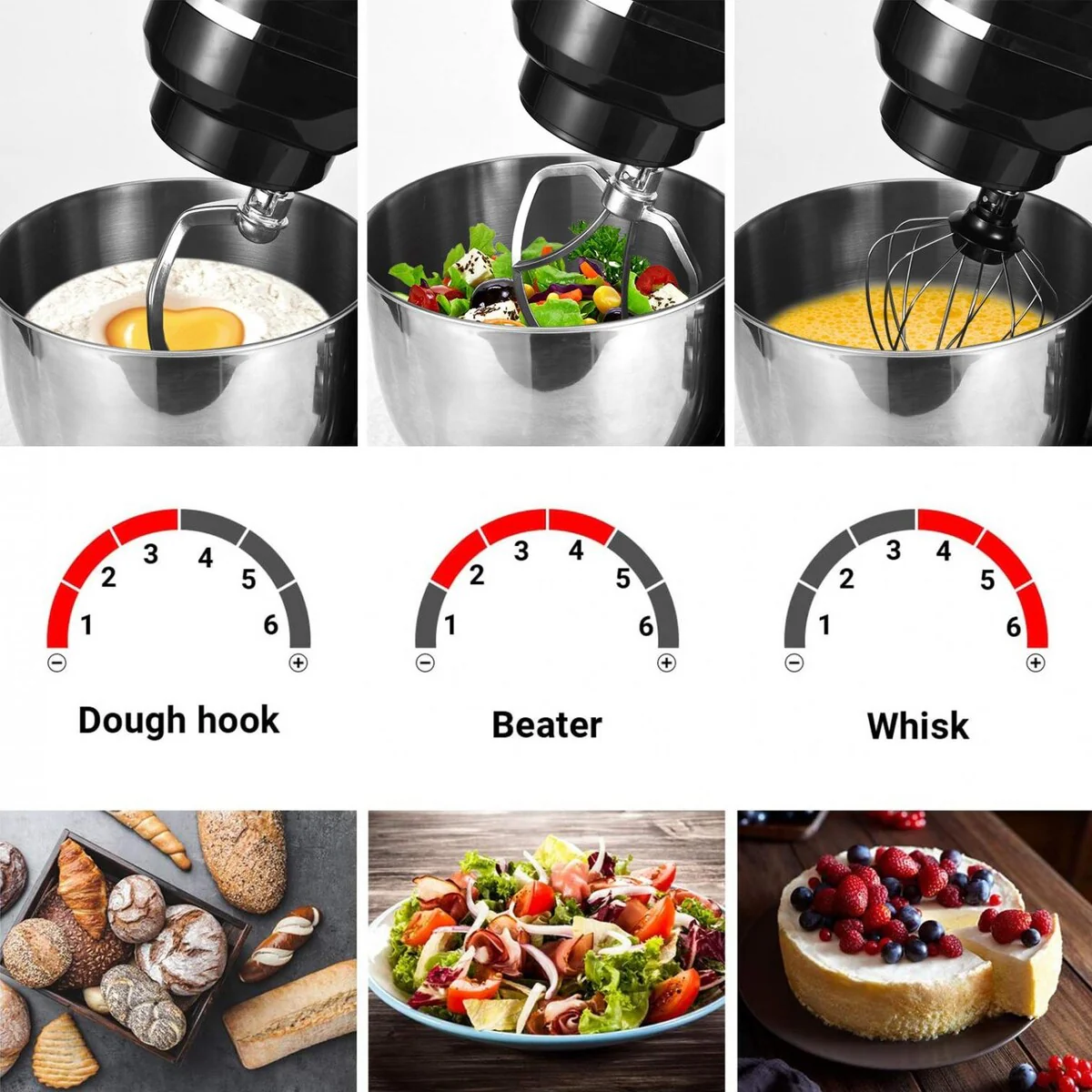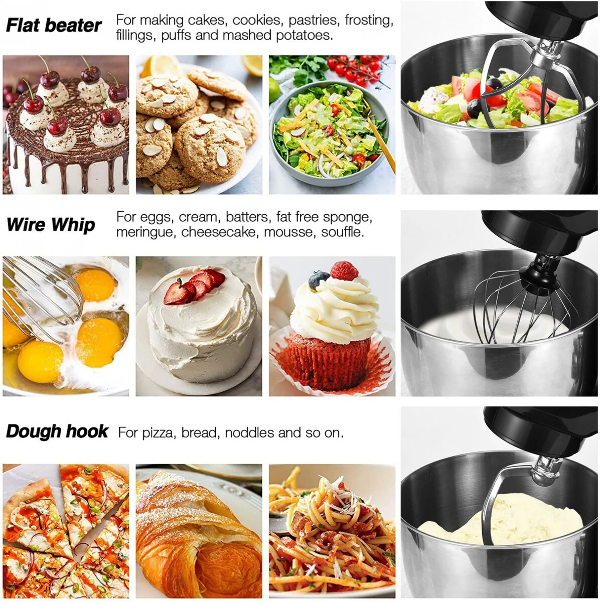 5L HIGH CAPACITY - 380W high performance motor, Big stainless steel mixing bowl offers enough capacity. Each kitchen stand mixer comes with a dough hook, flat beater, wire whip, and pouring shield avoiding mess kneading process.You can enjoy the fun of making cakes, bread, cookies, pastry, muffins and waffle.