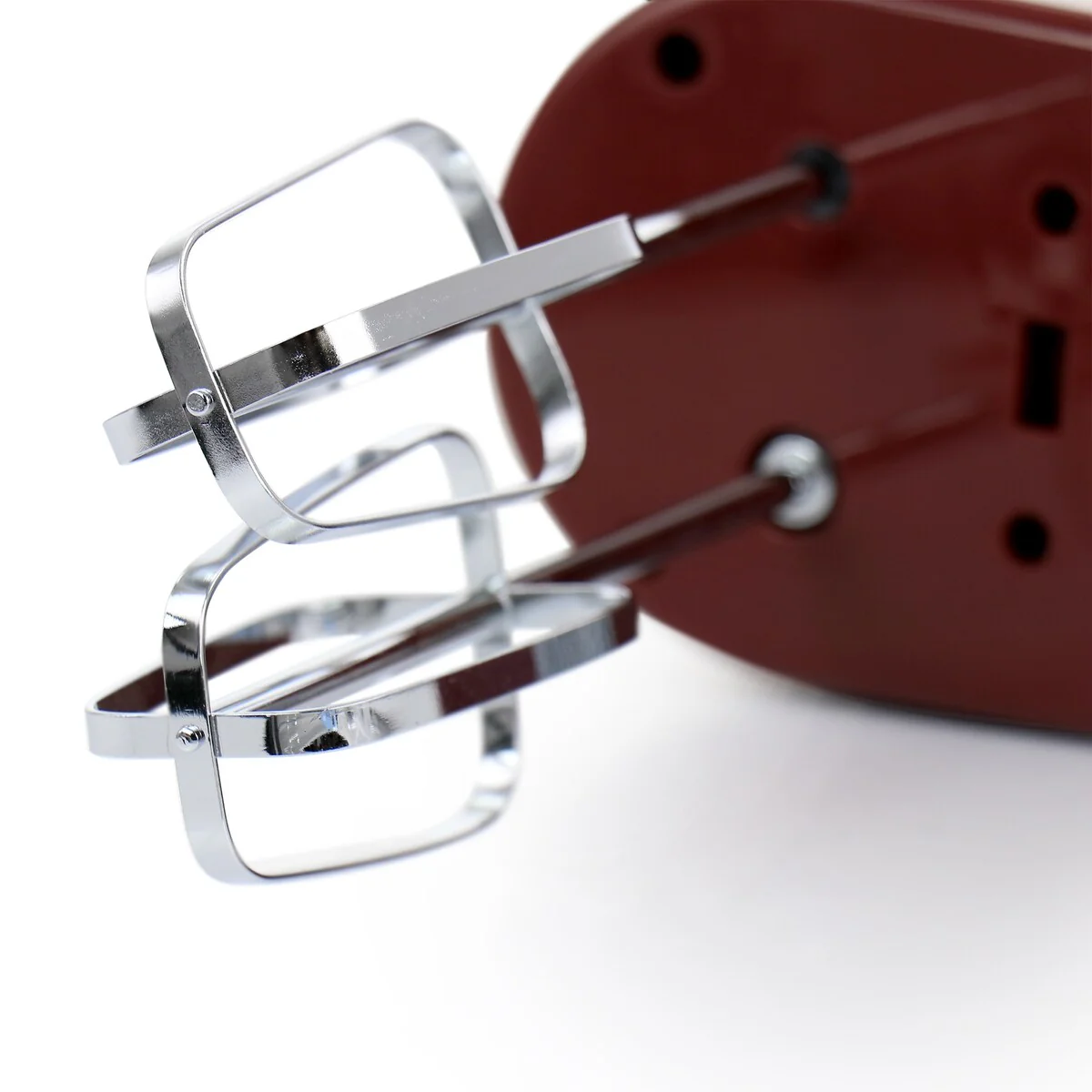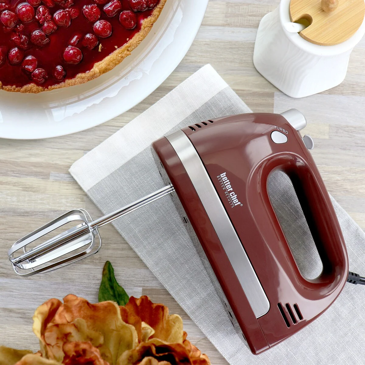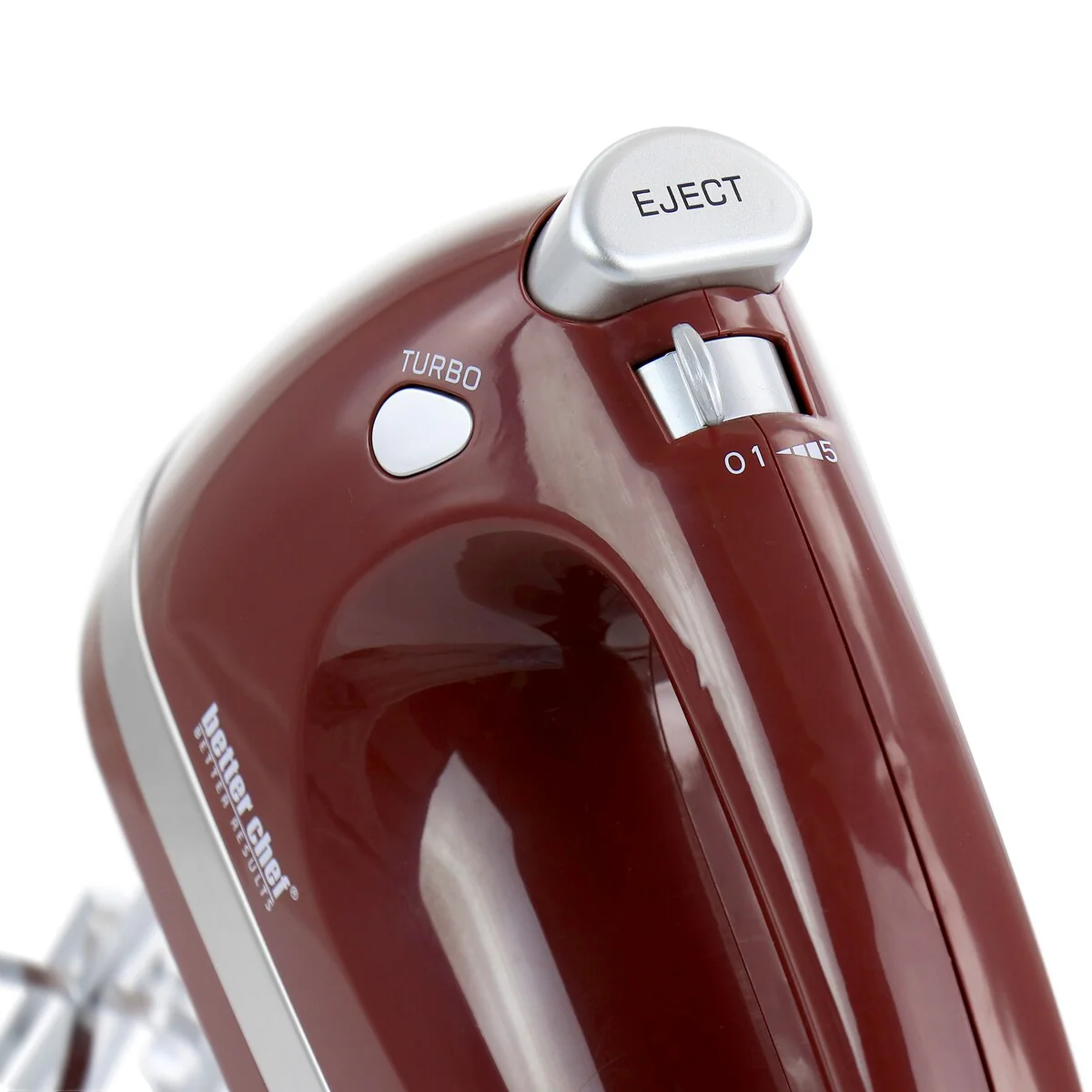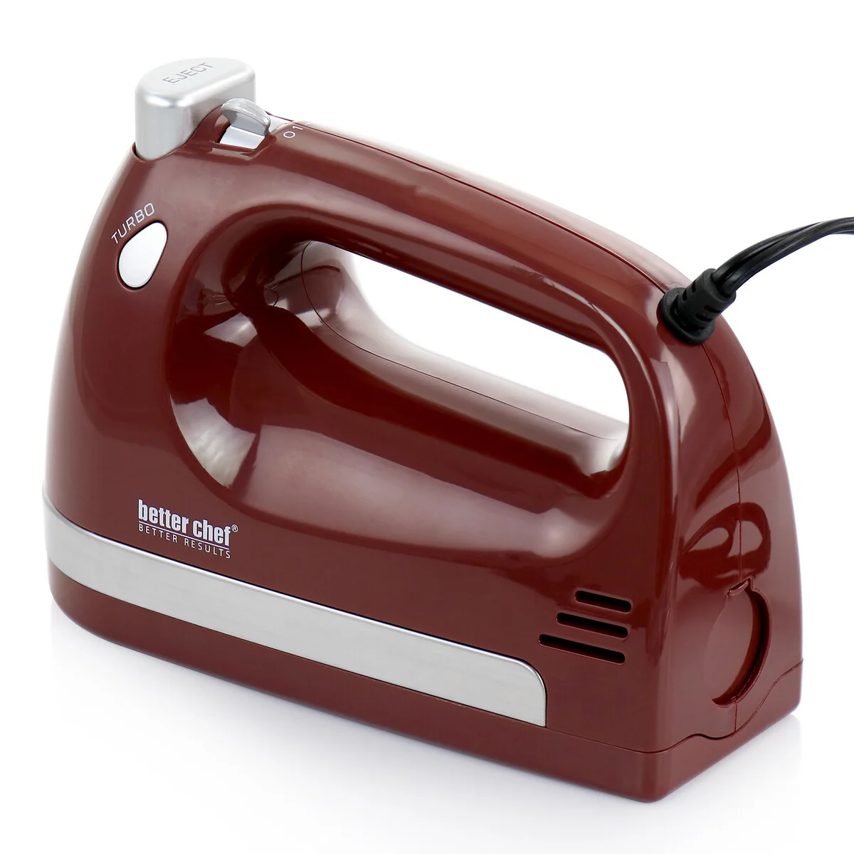 Mix, Blend, Beat and Kneed all with the Better Chef 250 Watt MegaMix 5 Speed Hand Mixer in Red. Ergonomic handle for one handed operation offers a powerful 250 Watt motor for most of your everyday mixing needs. Ideal for quickly and easily mixing up your favorite cookie dough's, mashed potatoes, bread dough's and so much more. Includes interchangeable beaters and dough hooks. Dishwasher safe accessories for easy clean up and compact for convenient storage.