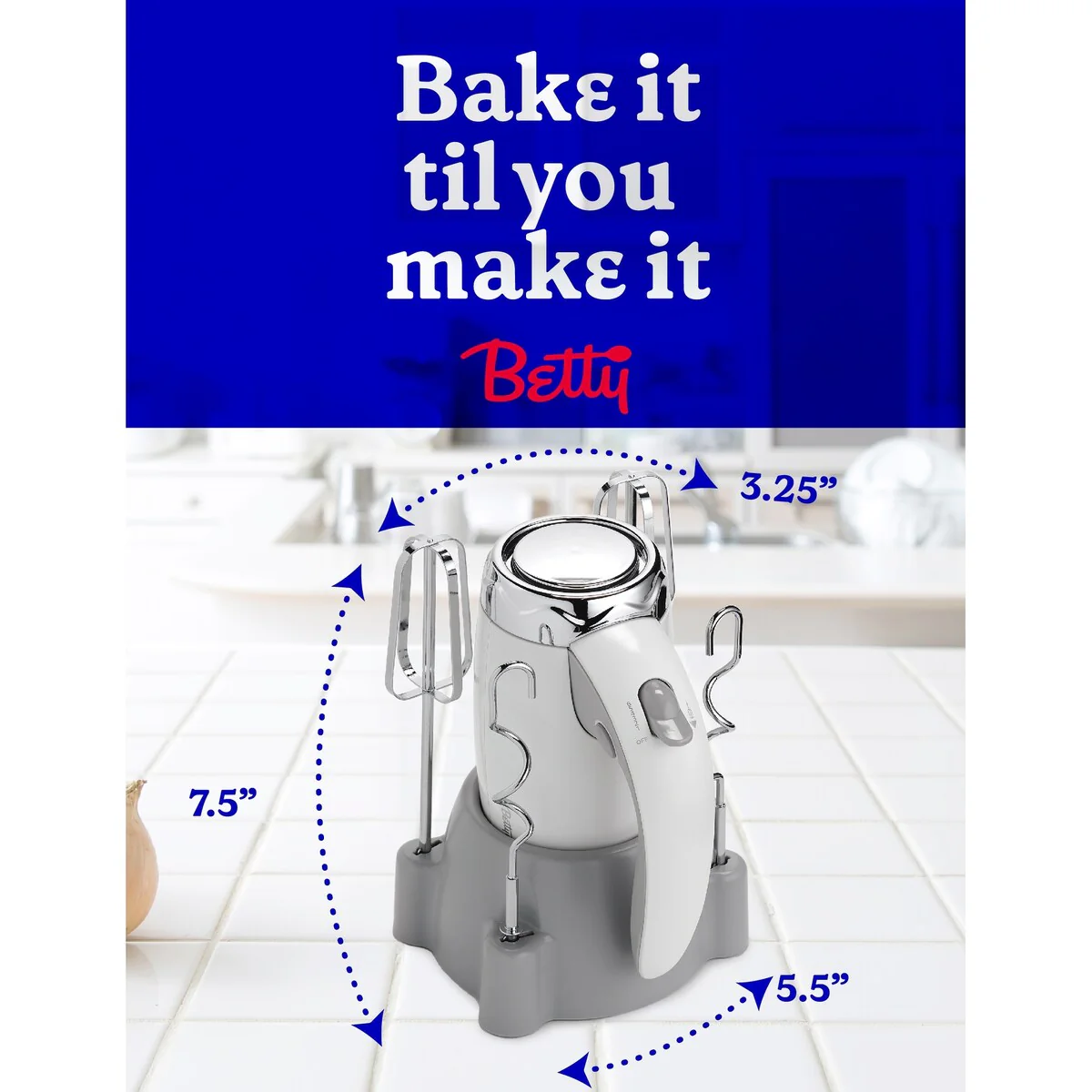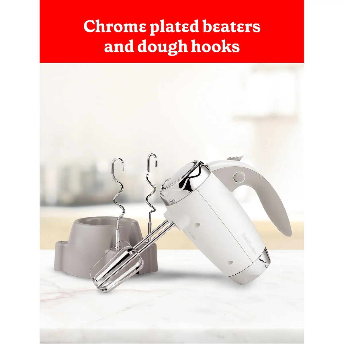 This BETTY CROCKER 7-Speed Power Up™ Hand Mixer with Stand in white is your number one kitchen sidekick to bake someone happy. When it comes to easy-to-use ergonomic kitchen tools, this handheld electric mixer is your solution to creating mouthwatering dishes, meals, and treats. With 250W of power and a turbo 300W at peak power, this egg white beater is considered one of the top household items for its versatility and easy storage. When it comes to high quality kitchen appliances, especially hand blenders for kitchen, our mixer comes with necessities like hand mixer beaters and dough hooks. Whether you're using each dough whisk to share the joy of homemade for a special occasion or selecting one of 7 mixing speeds for cake batters, mashed potatoes or homemade whipping cream, our beaters for hand mixer ensure thorough and quality mixing each and every time. Also included is a storage stand so you can place your new hand mixer upright when not in use. 120V/60Hz. Easily select your speed thanks to an intuitive speed selector switch and press the beater eject button when finished. When it comes to mixin’ it up, Betty’s got your back.