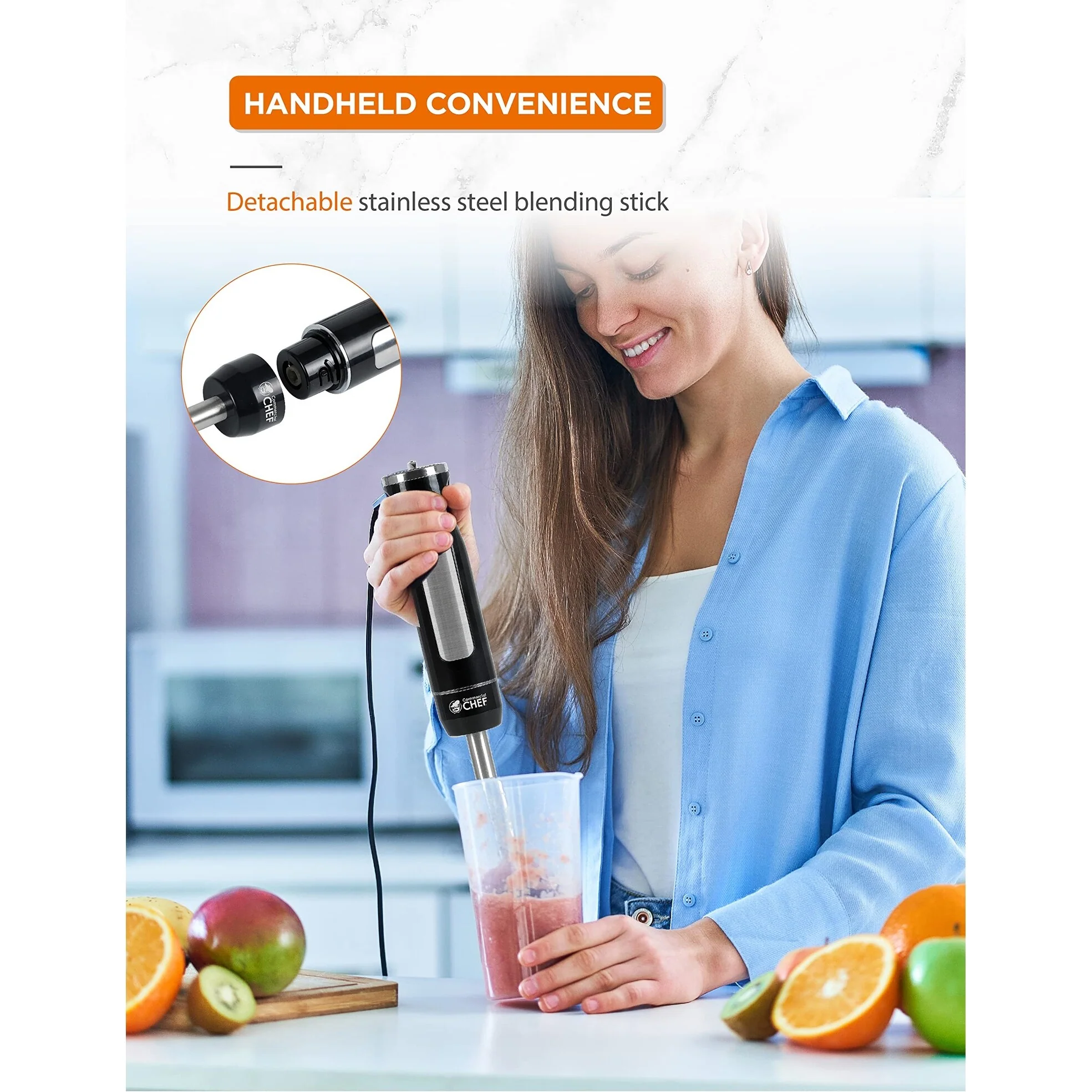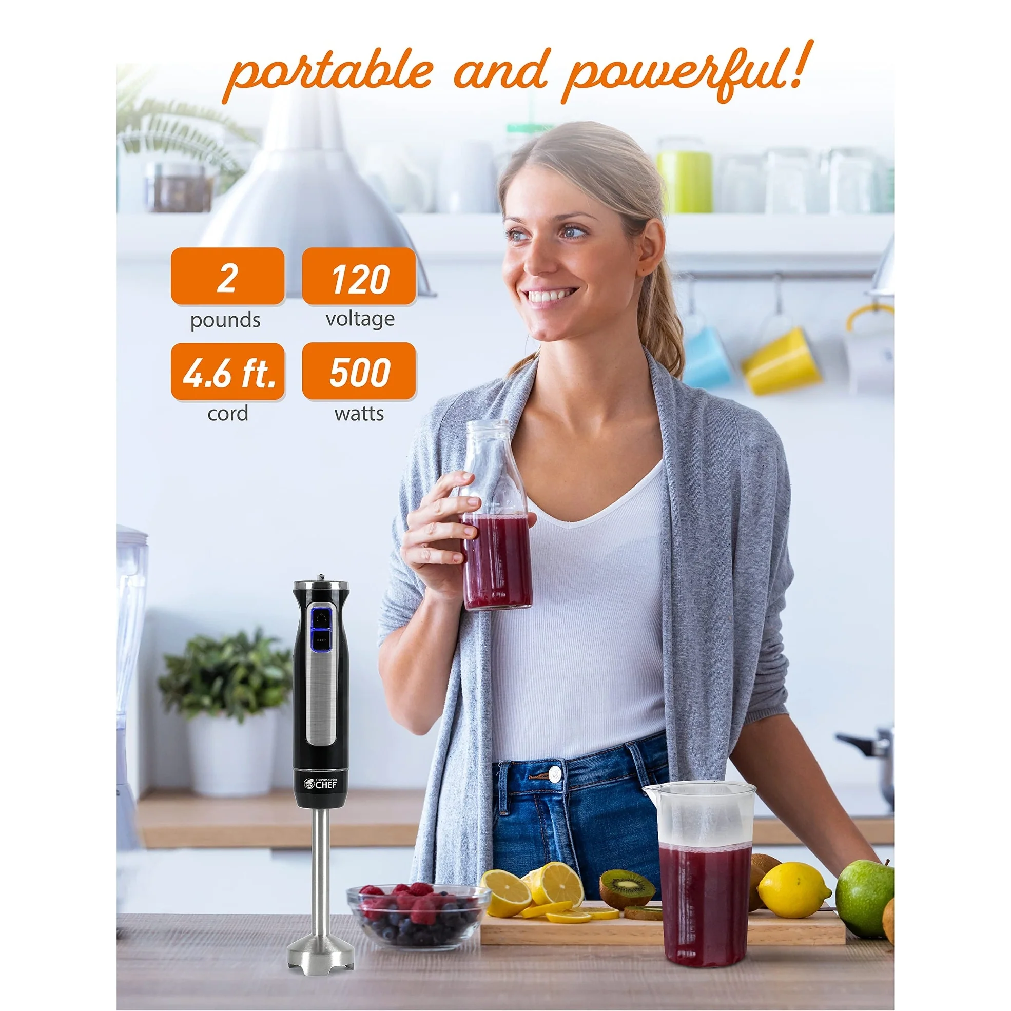 HANDHELD CONVENIENCE—This game-changing COMMERCIAL CHEF immersion hand blender (2.16' x 2.16' x 15') is what you need to create mouthwatering soups, delicious dips, and impressively frothed milk. With 2 speed options and 8 variable speeds, your dishes will be plate-ready in no time.STAINLESS STEEL—Blend and puree foods impeccably with our phenomenal electric mixer. Enjoy a high quality stainless steel blade and detachable stainless steel stick that yield impressive—and delicious—results. And good news—the 500W motor won't distract you from your sharp chef focus!ACCESSORIES INCLUDED—Whether you're emulsifying soups, beating eggs for a birthday cake, or frothing milk for that highly anticipated morning cappuccino, this immersion hand blender (2.07 lbs.) is your solution to a variety of versatile kitchen needs. This bundle includes a phenomenal milk frother, 600ml beaker, and egg whisk.PERFECT FOR MEAL PLANNING—Create delicious soups and recipes that you can make ahead and freeze. Considered one of the best immersion blenders available, you can spend a whole Sunday making soups, smoothies and other amazing dishes for the week ahead.QUALITY GUARANTEED—This handheld milk frother, like all COMMERCIAL CHEF products, comes with a quality assurance guarantee for all customers. ETL/CETL certified.