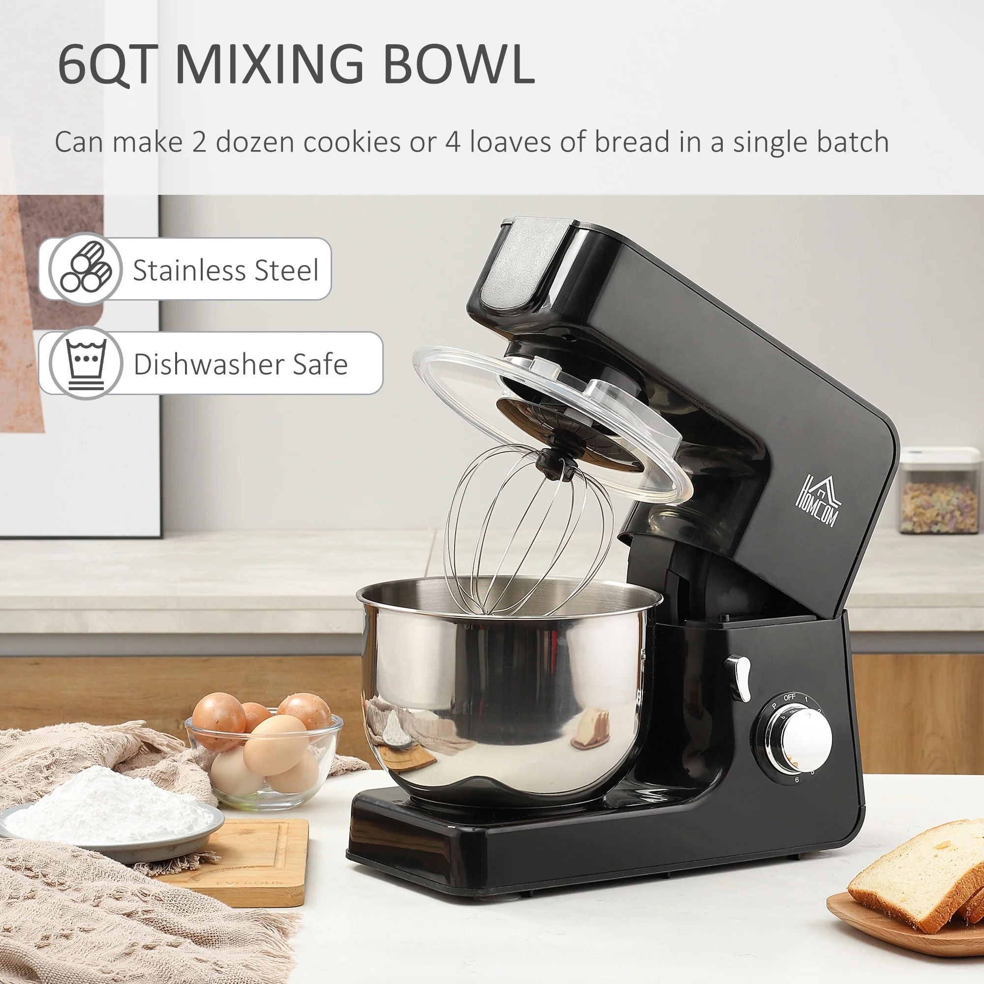 - 6 qt. stainless steel mixing bowl allows you to make two dozen cookies or four loaves of bread in a single batch