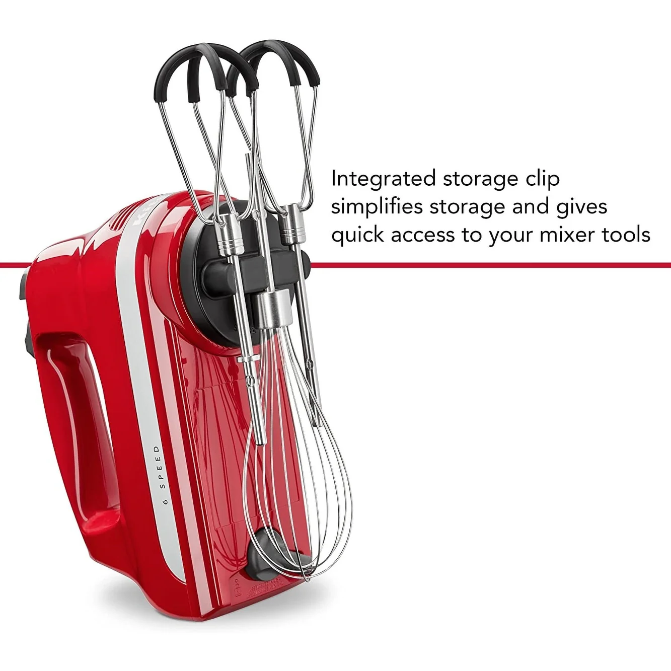 Compact, lightweight and great for your everyday mixing needs. This hand mixer features 6 speeds, 2 Flex Edge Beaters and the power and control to mix up your favorite cookie dough, mashed potatoes and so much more. Slowly stir in chunky ingredients, like nuts or chocolate chips, at speed one or whip egg whites or heavy cream at speed six. The Flex Edge Beaters deliver 2X the surface area for faster, more thorough mixing,* and also reduces the need to scrape down sides of the bowl, when compared to metal beaters. When you're finished mixing, you can securely store your accessories with the integrated storage clip that attaches to the underside of your mixer, eliminating the need for bulky containers and/or storage boxes. *Compared to metal Turbo Beater II accessories based on cake batter.