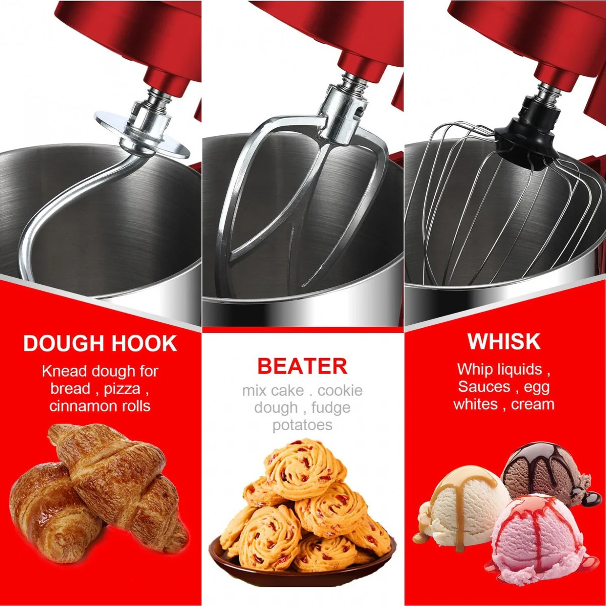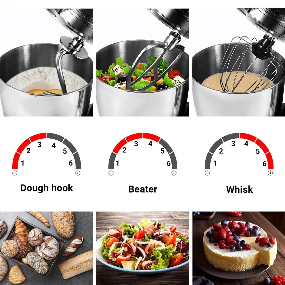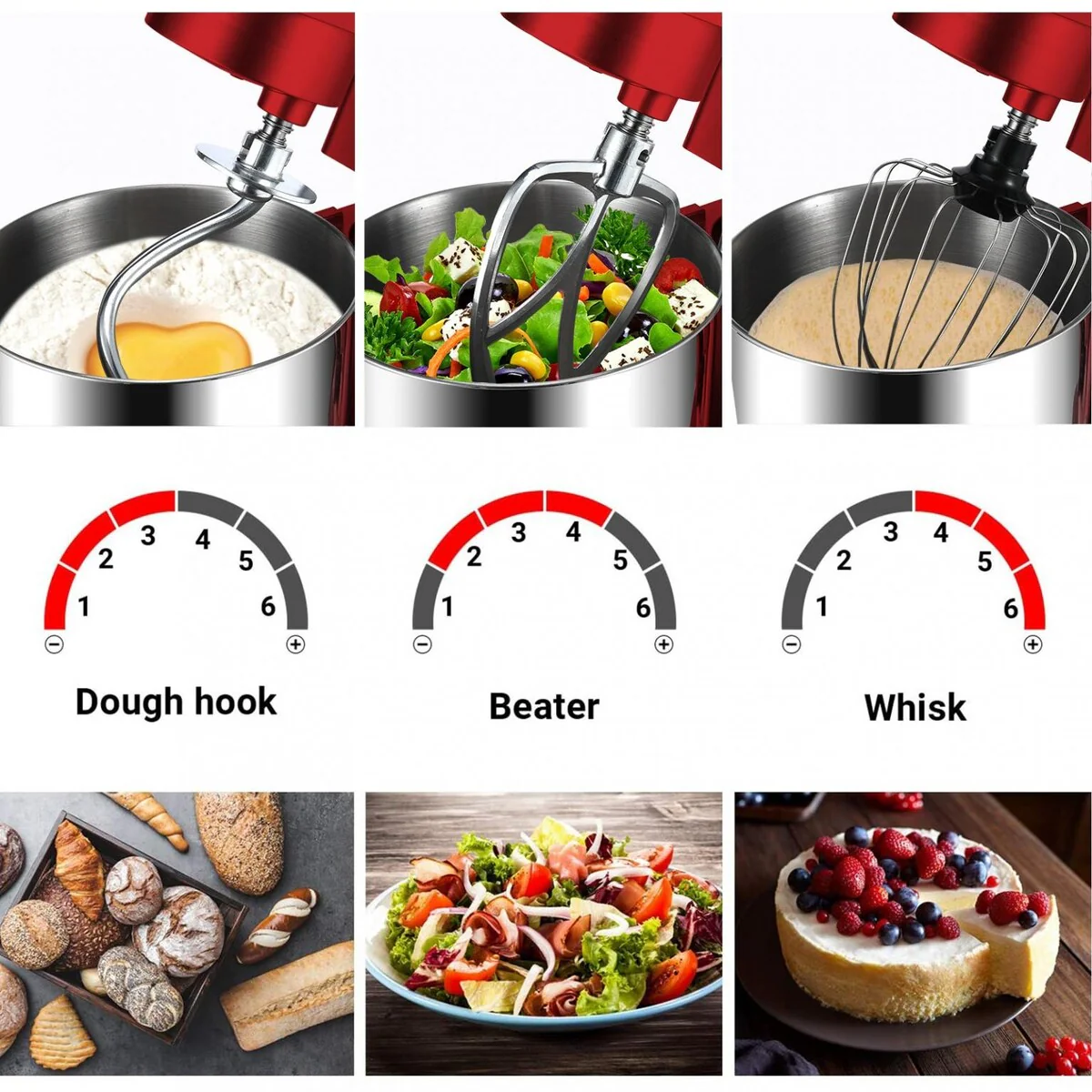 Powerful Motor & Variable Speed Control:380W high performance pure copper motor and 10 optimized speeds with pulse function, access to multipurpose and a variety of recipes. With LED indicator light on the speed knob which makes your kitchen more colorful. Tilt Head & Auto Power-off Design:The stand mixer tilt head design provides access to install or uninstall bowl and accessories easily. If the head is raised in operation, the mixer will automatically power off to prevent the rotating attachments from causing injury to you.
