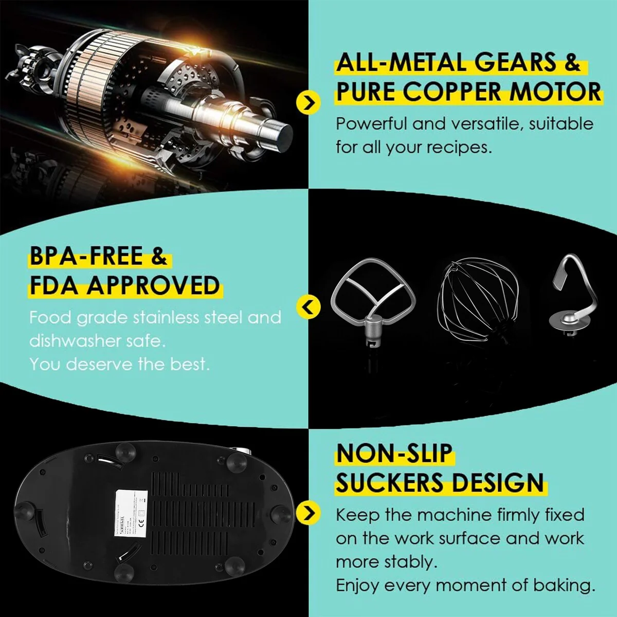 - All-METAL STAND MIXER: The stable die-cast aluminum housing offers durability and ensures lasting use. The sturdy body and 4 anti-skid pads on the bottom firmly fix the mixer on the platform, it will not shake even under the powerful motor.