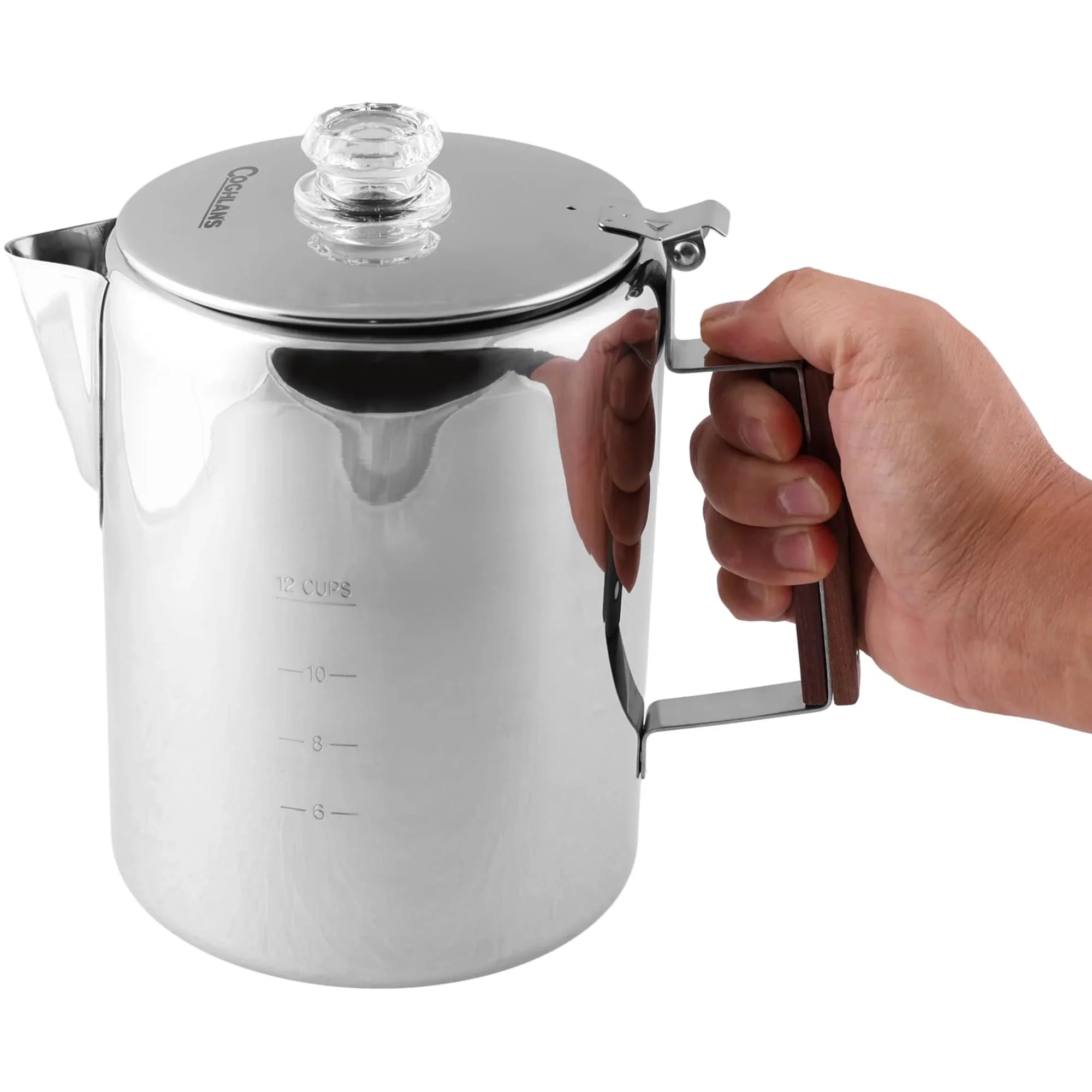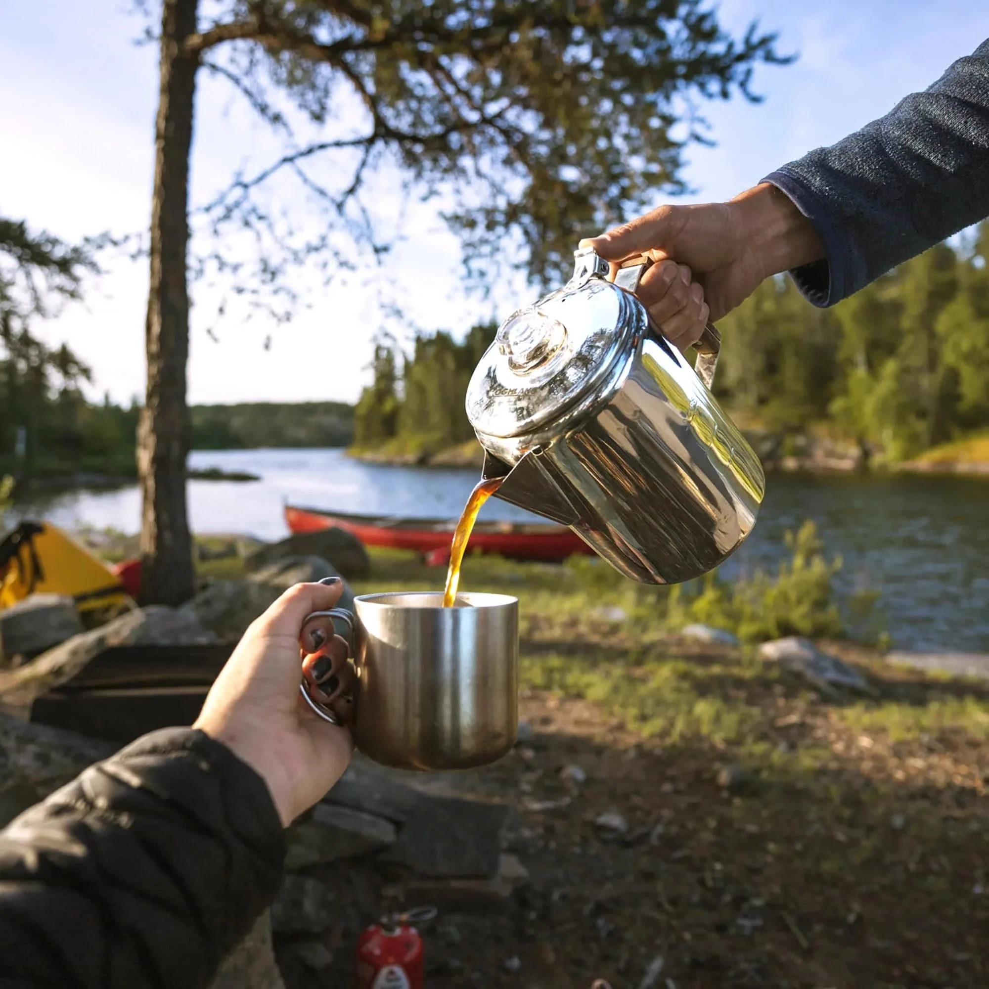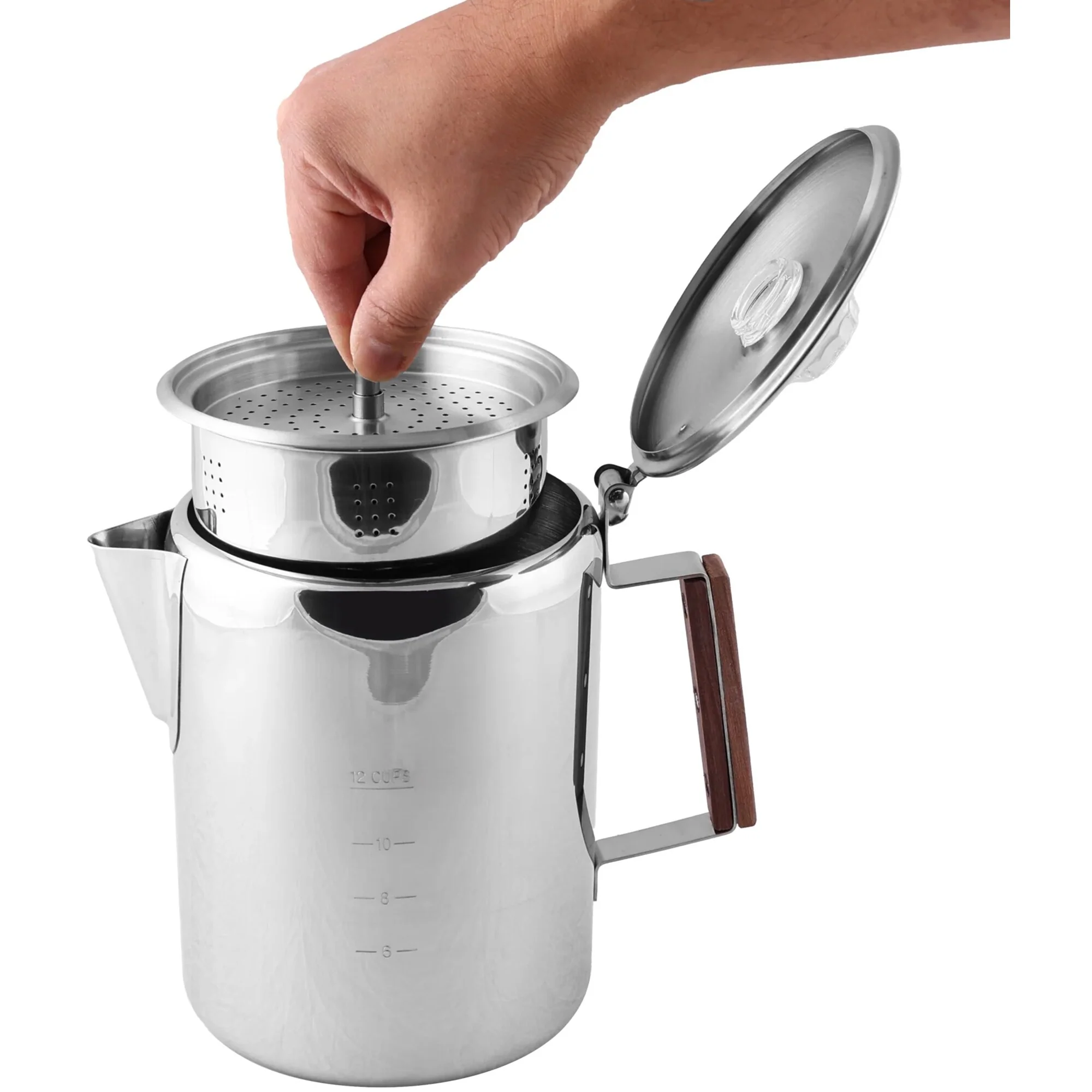 Looking for a reliable coffee pot to take on your camping trips? Look no further than the Coghlan's 12-Cup Stainless Steel Coffee Pot! This 3-piece stainless steel percolator system is built with precision and can brew up to 12 cups of your favorite coffee. The hinged lid with a wooden handle and clear percolator dome makes it easy to use, while the heavy-duty 18/8 stainless steel construction ensures that it will last for years. And the best part? It is dishwasher safe for easy cleaning. Next time you're waking up in the wilderness, make Coghlan's Coffee Pot part of your morning routine.