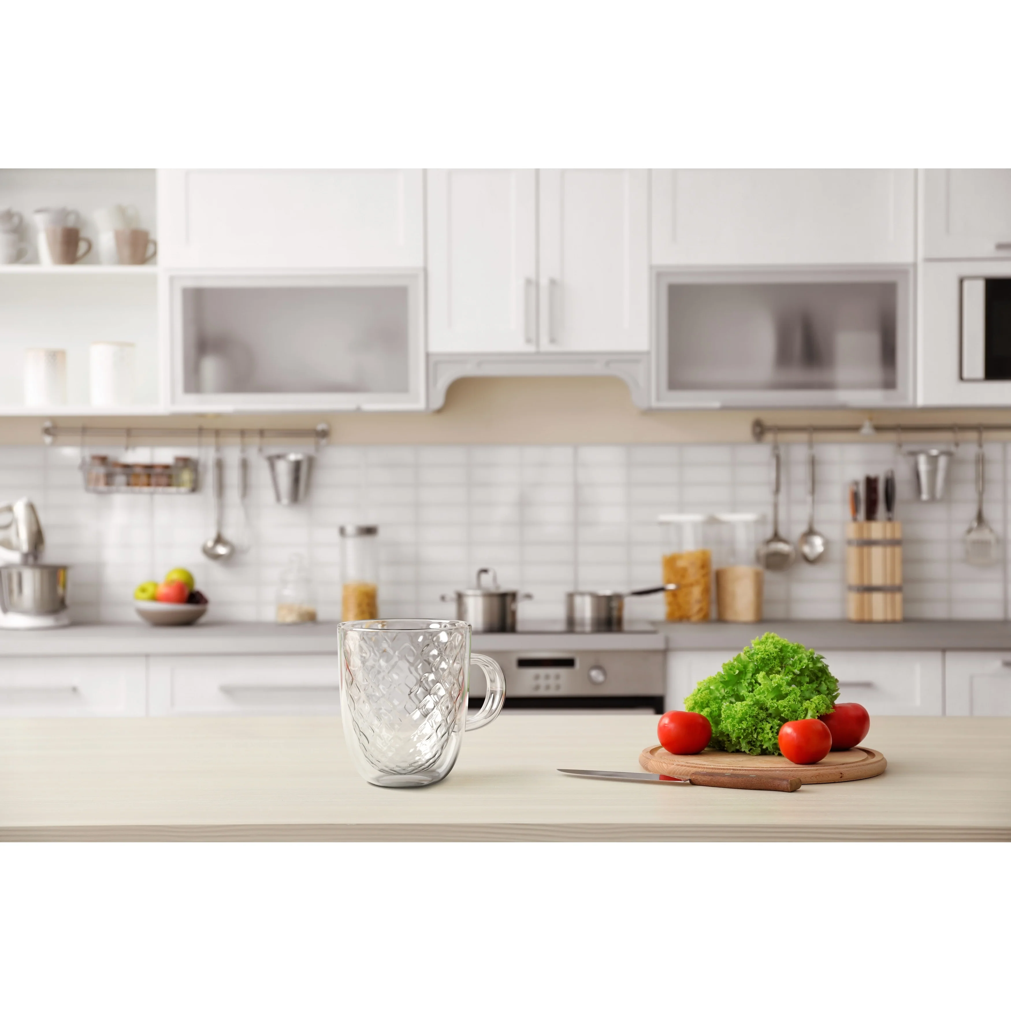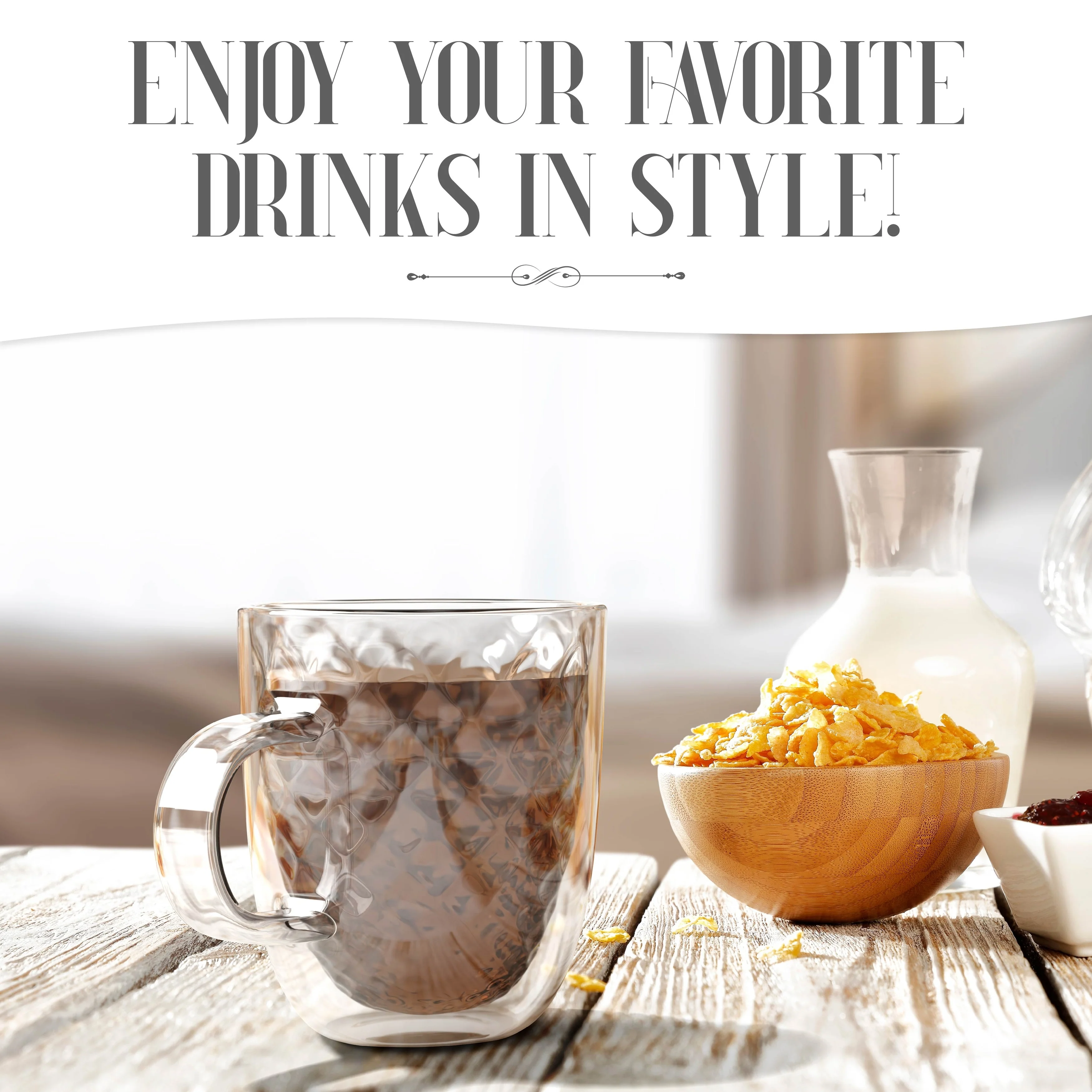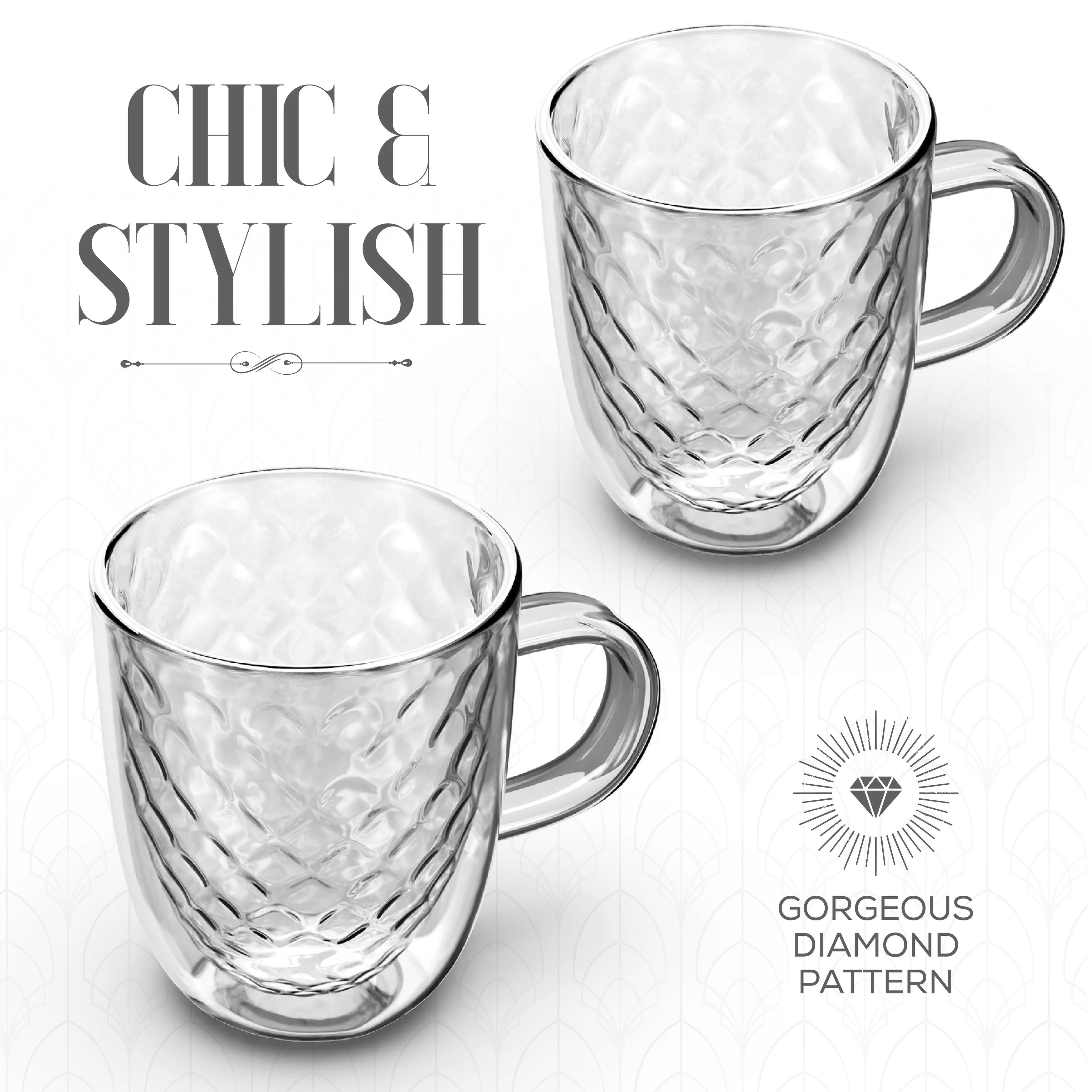 - Versatile and Stylish: Enjoy a wide range of hot and cold beverages, such as coffee, tea, lattes, and smoothies, in these elegant elle décor Diamond Coffee Mugs. The double-wall design made from scratch-resistant borosilicate glass keeps your drinks at the perfect temperature for longer.