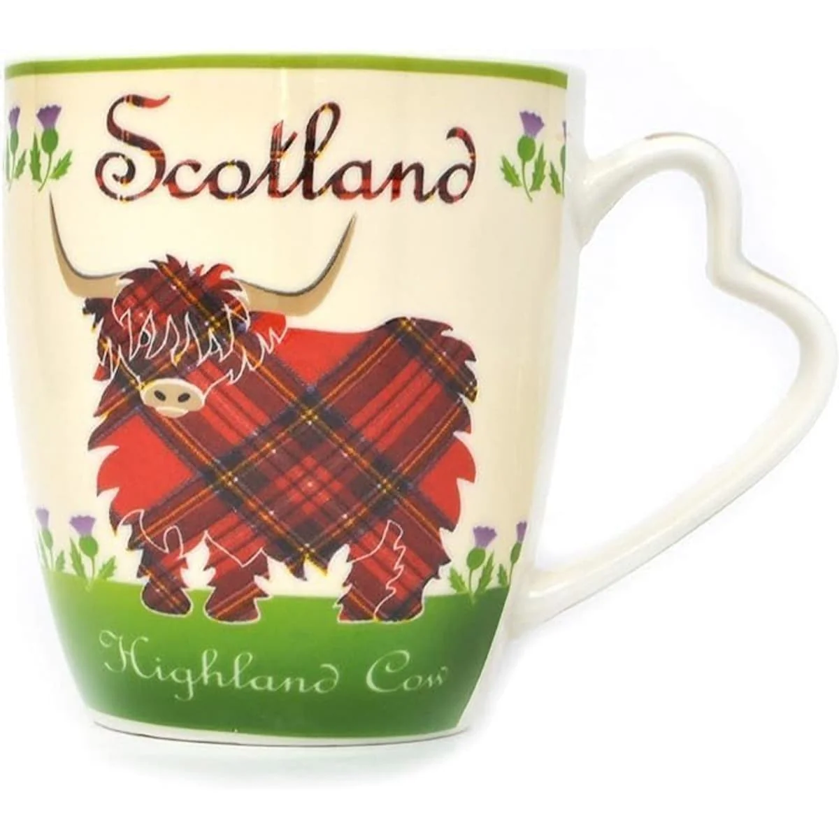 The mugs feature a vivid and detailed Highland Cow design, adorned in traditional Scottish tartan hues of red, yellow, and black. Set against a serene green field and surrounded by delicate Scottish thistles, the artwork captures the rugged beauty of Scotland’s countryside. The Highland Cow, the world’s oldest registered cattle breed, is celebrated for its resilience, with its long horns and thick, oiled coat perfectly suited to harsh winters.