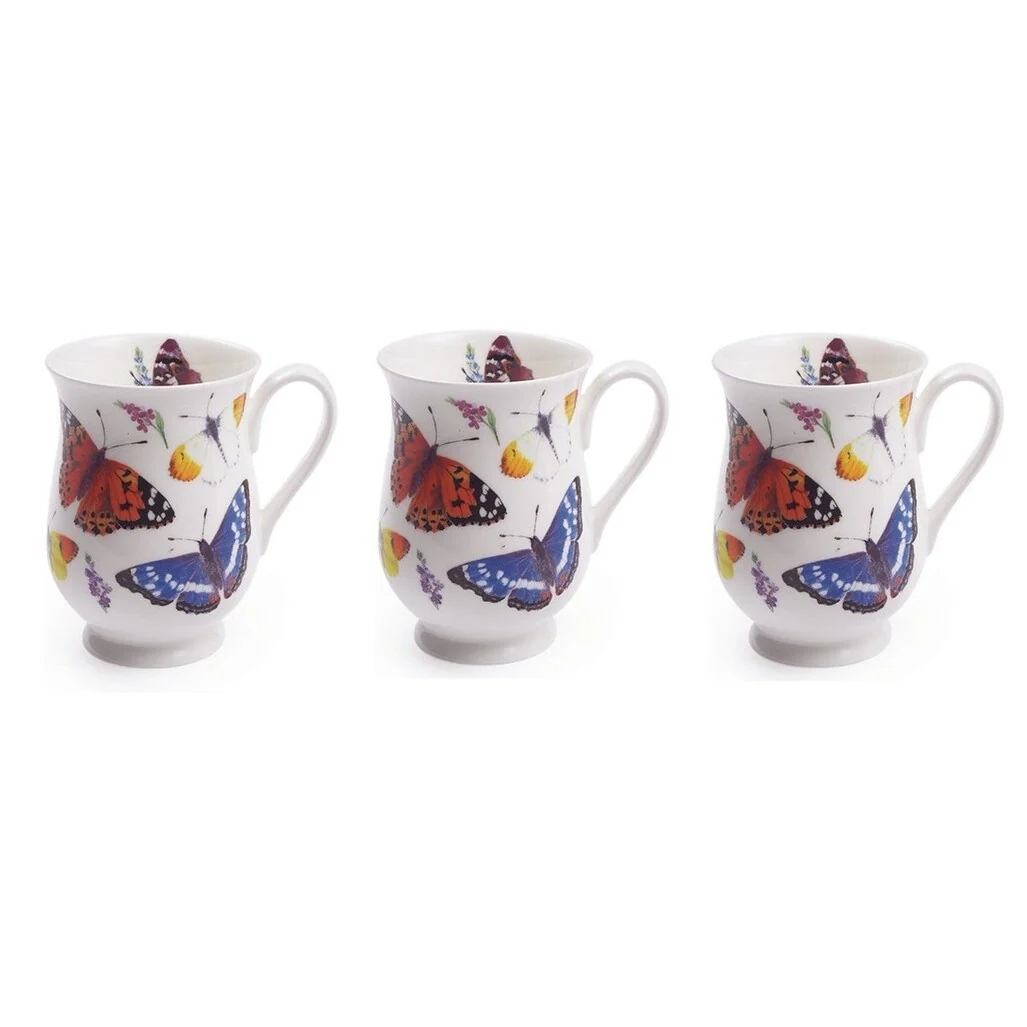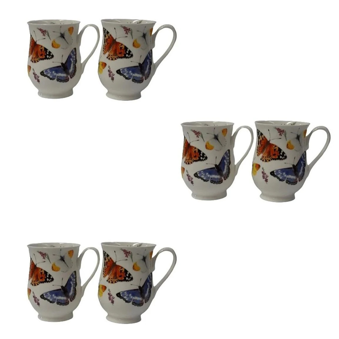 Butterfly Garden Set of Six Eleanor Mugs in Fine Bone China. Featuring an array of brightly colored butterfles flitting around this elegantly contoured mug shape. Capacity 320 ml. This set of 6 mugs are in one design.