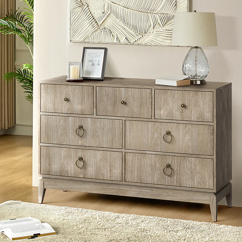Elegant pieces don't have to be flamboyant or over the top. This contemporary dresser proves that even the simplest designs can be sophisticated and charming. It's right for almost any occasion and makes any space look amazing, especially the bedroom. This is a wood 7-drawer dresser with storage for clothing, bedding, accessories, and more. Large ring decorative hardware pulls on the four standard drawers and small knobs for the three center drawers all in a champagne brass finish. The sleek dark walnut finish accentuates the wood craftsmanship and ensures long-lasting use for this darling piece. Its tapered legs with an acacia solid wood base are very sturdy and can be used for a long time. This 7-drawer dresser designs detail and contemporary styling would be an essential piece in that ultimate classic bedroom.