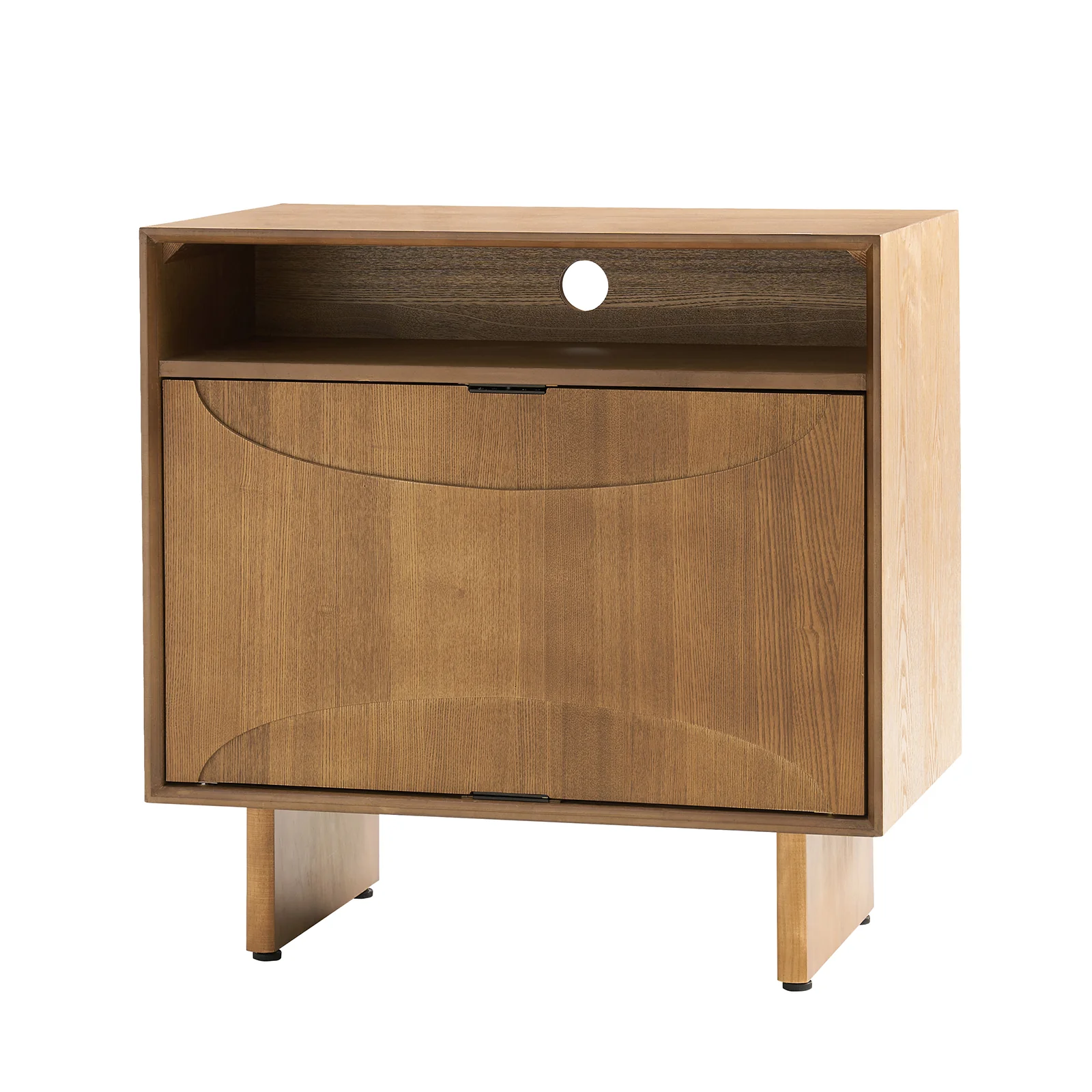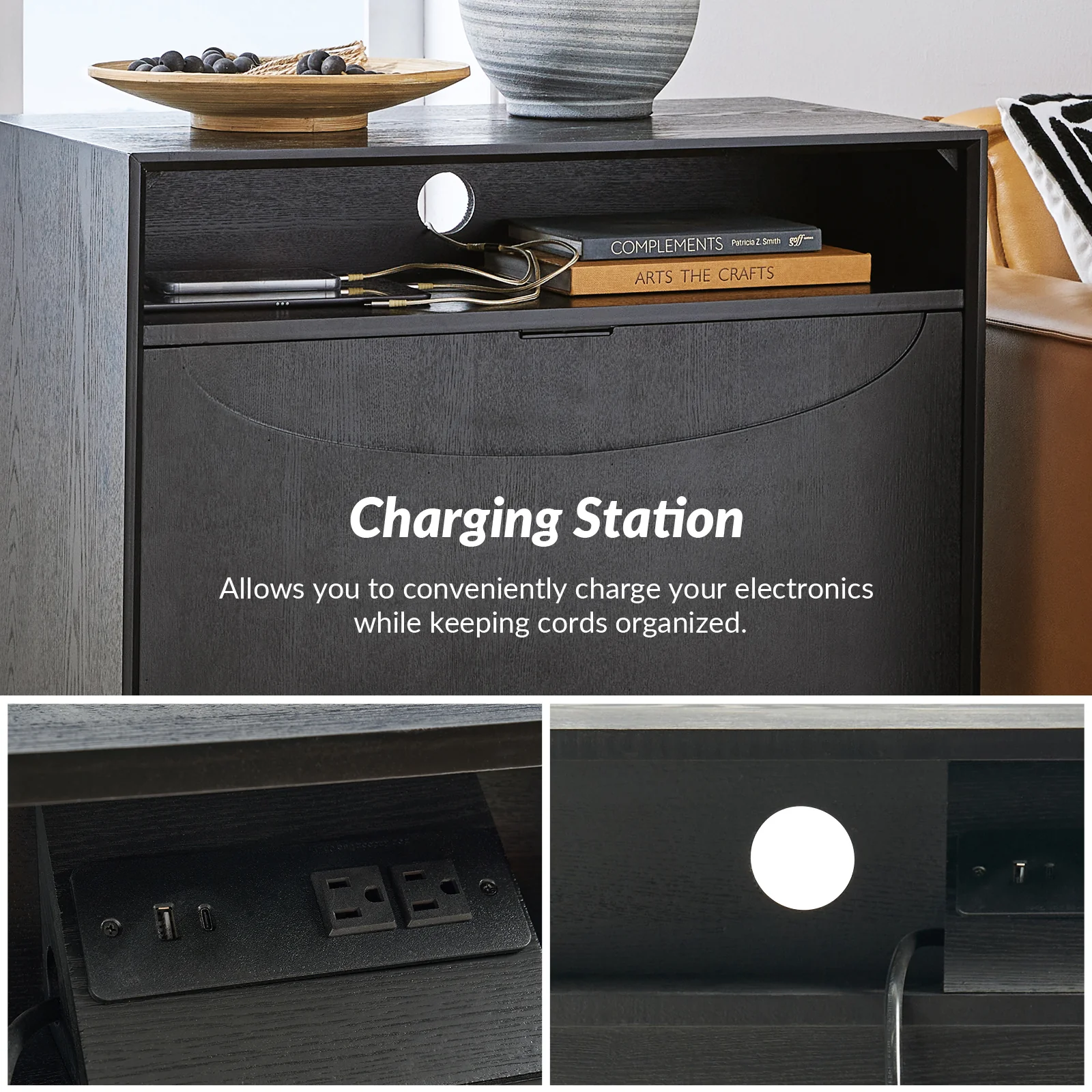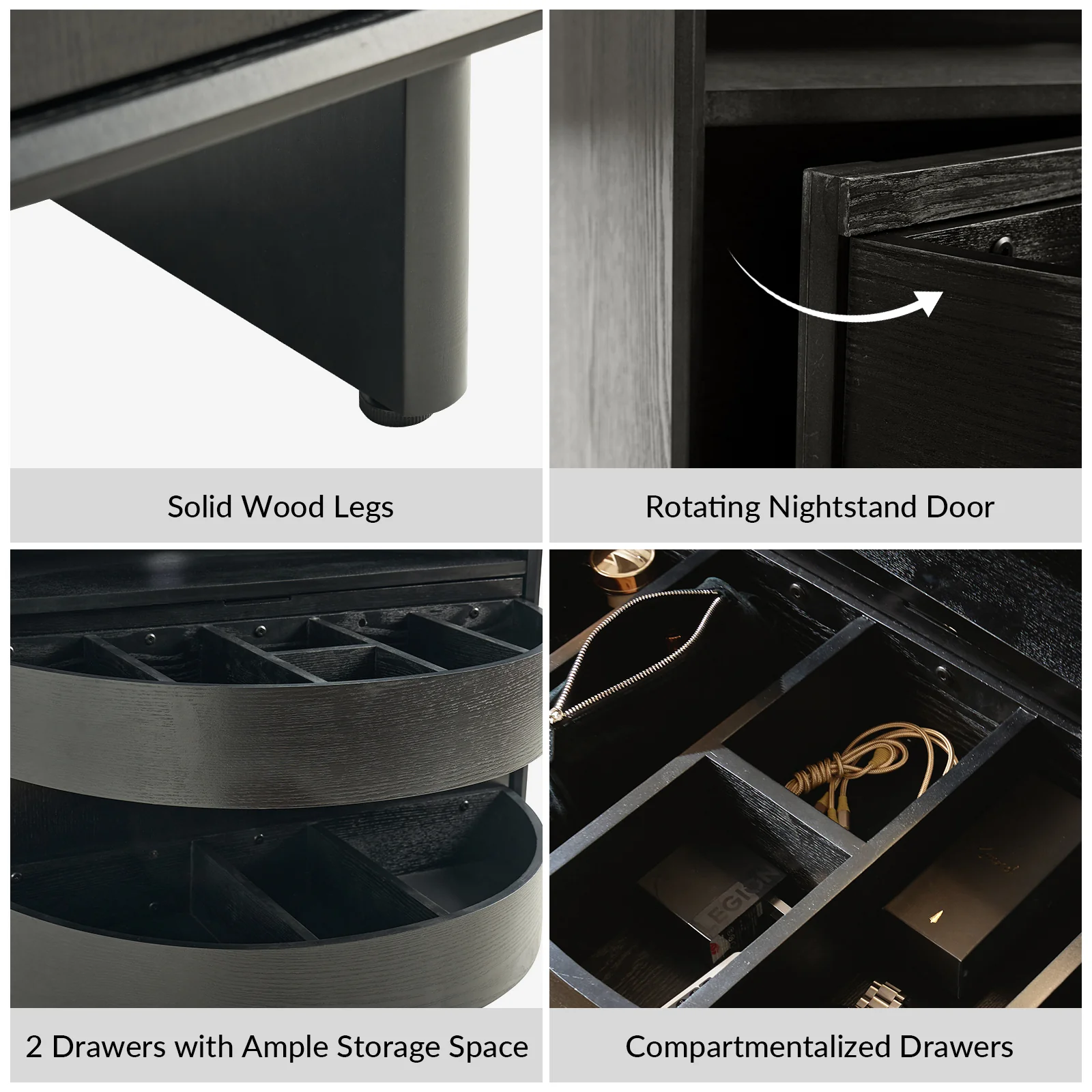 The tall nightstand embodies modern style with its sleek design and practical features. Crafted with solid wood legs, it exudes a sense of durability and sophistication. The rotating nightstand door offers easy access to storage while maintaining a clean aesthetic. Inside, compartmentalized drawers provide organization for various items. Equipped with built-in ports, it conveniently charges devices without cluttering the surface. Wire routing holes ensure tidy cable management, enhancing its functionality. Adjustable feet ensure stability on any surface, allowing for effortless installation. This nightstand seamlessly combines contemporary aesthetics with functional elements, making it a versatile addition to any modern bedroom space.