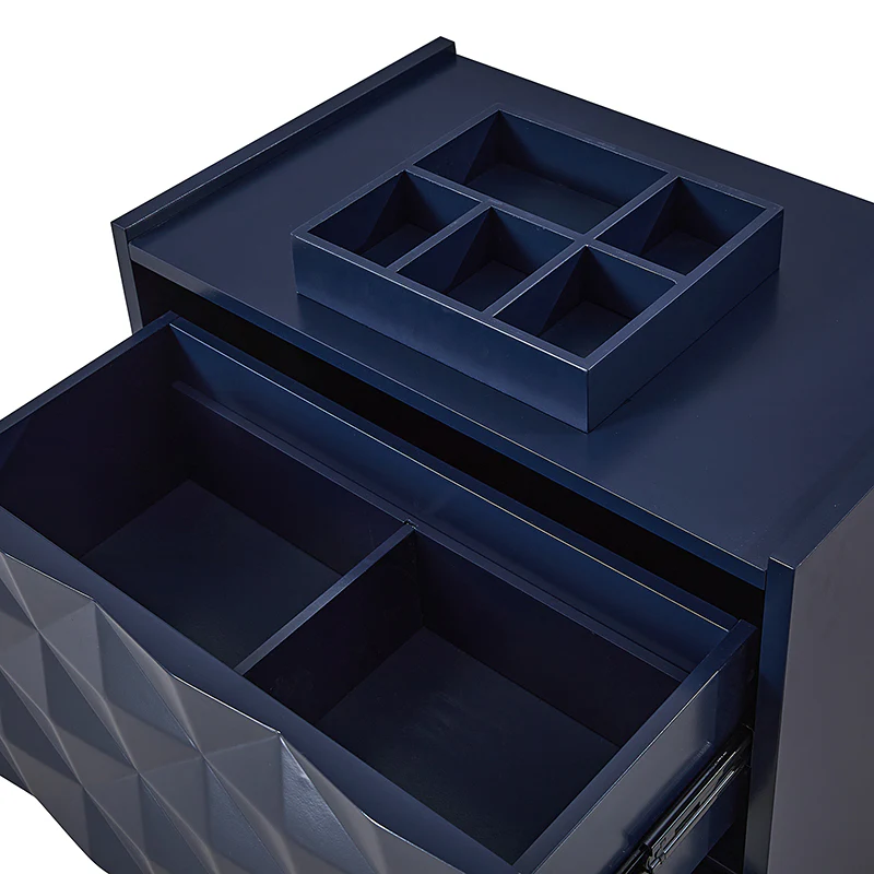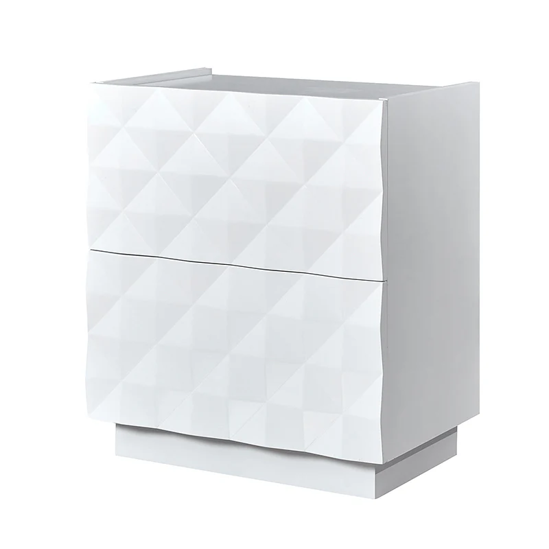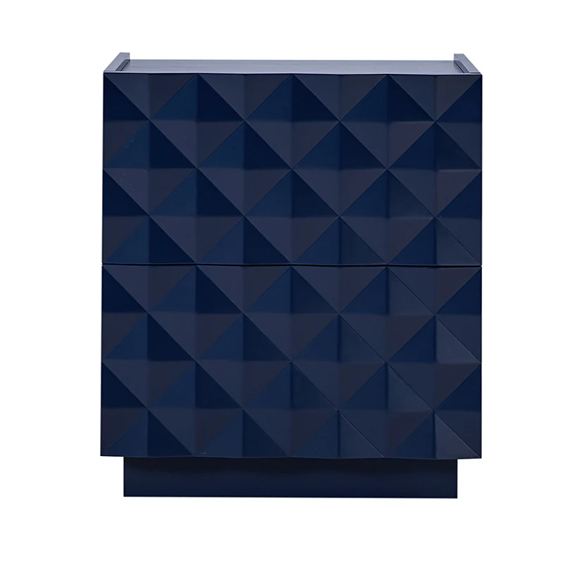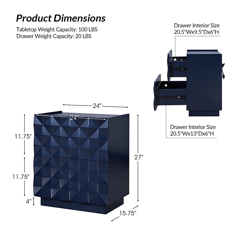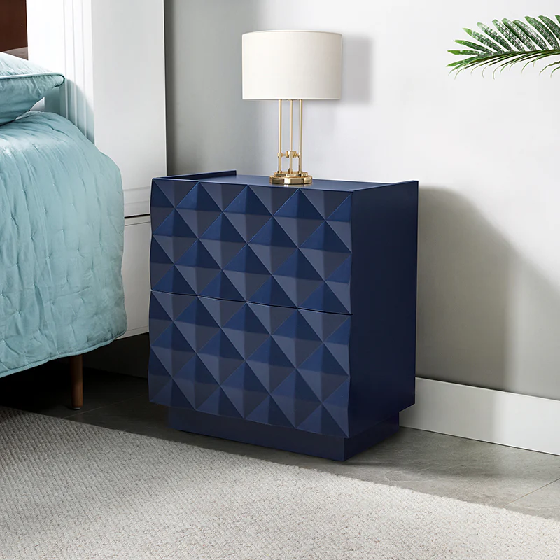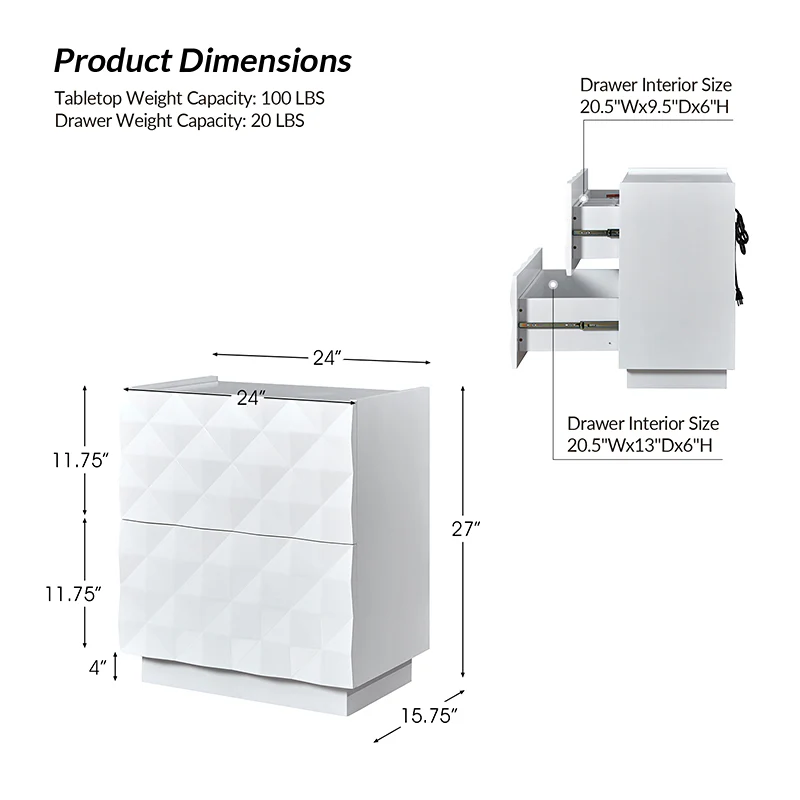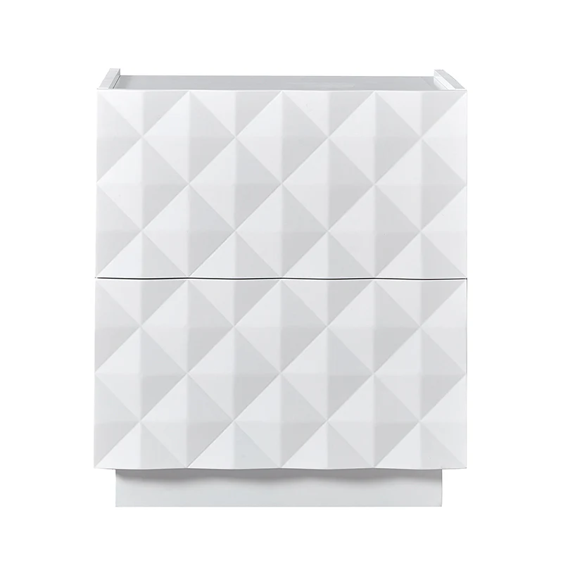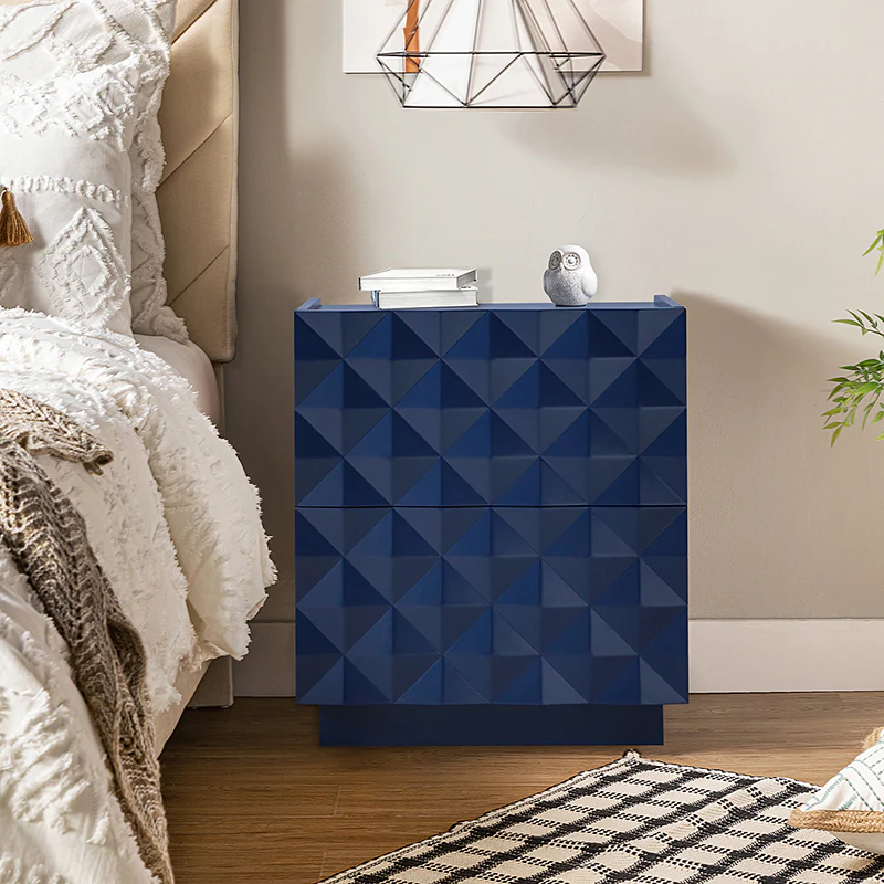 Introducing a modern 2-drawer nightstand, seamlessly blending functionality with contemporary design for both bedroom and living room. The exterior boasts raised geometric patterns while the innovative elevated surface prevents items from accidentally falling, ensuring a secure storage solution. This nightstand goes beyond the ordinary, featuring a built-in charging station for your electronic devices. Keep your essentials organized with the drawer organizer, the first-tier drawer's interior is intelligently designed with a removable tray and versatile compartments for added convenience. For the right placement and stability, the nightstand is equipped with adjustable legs. Elevate your room decor with this practical nightstand, combining form and function effortlessly.