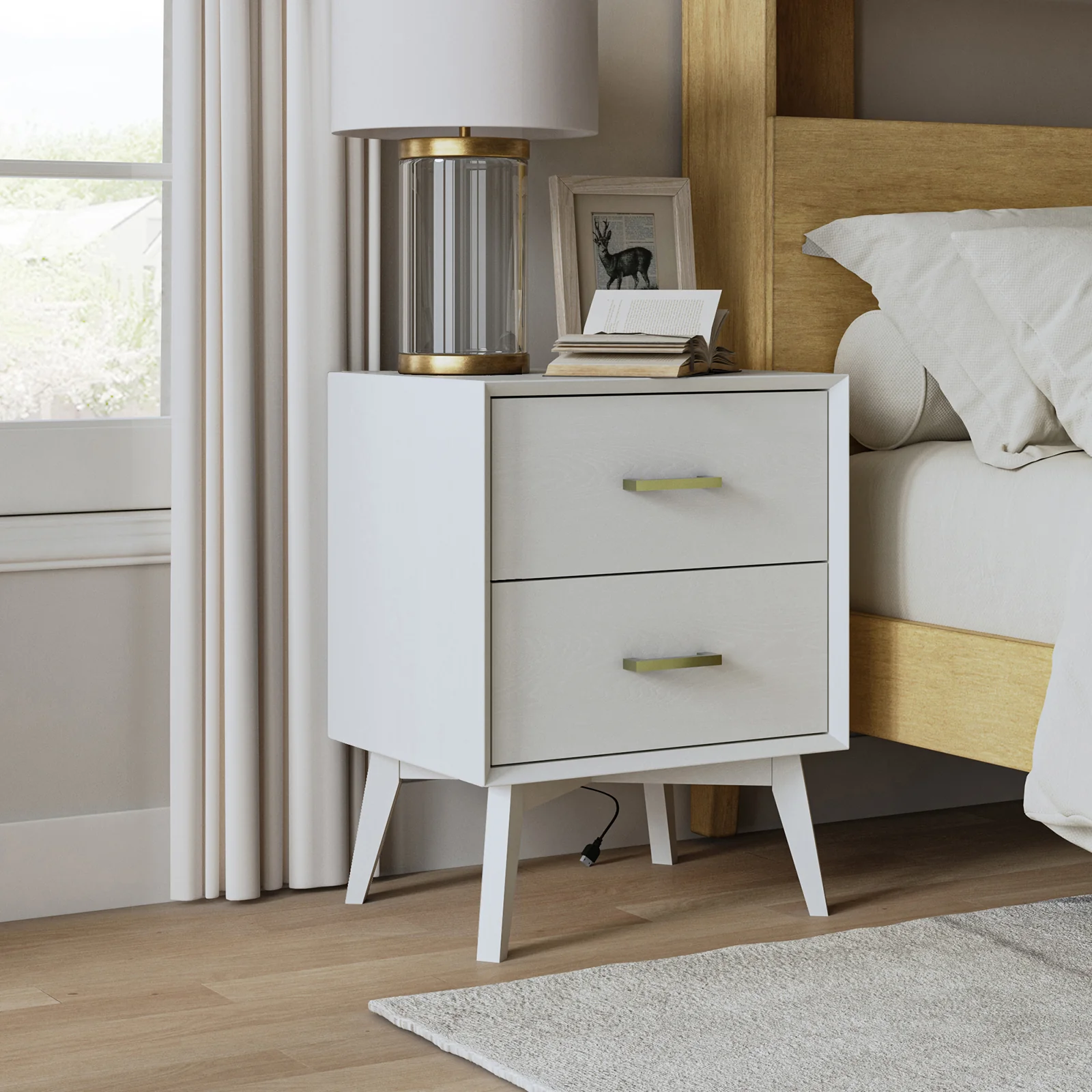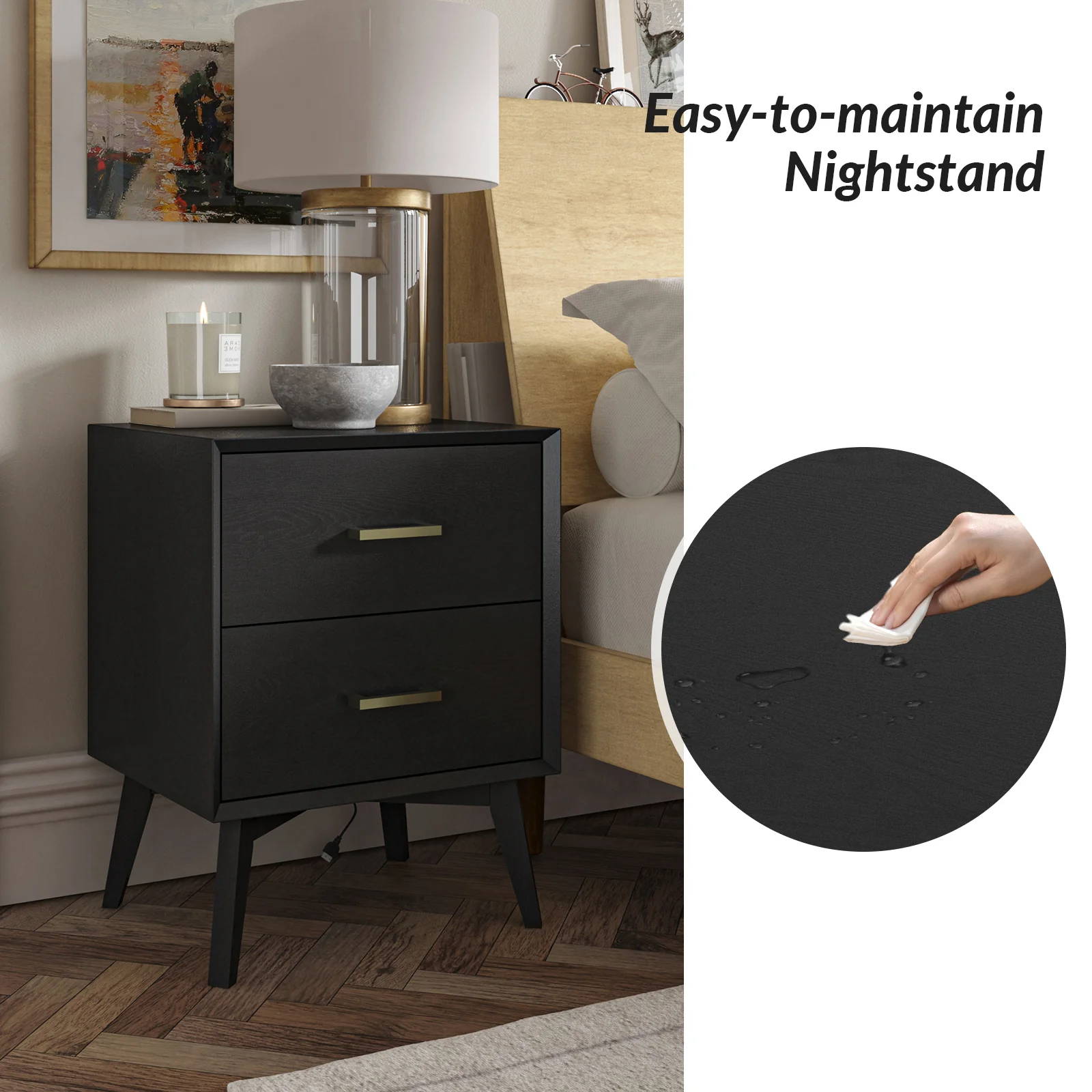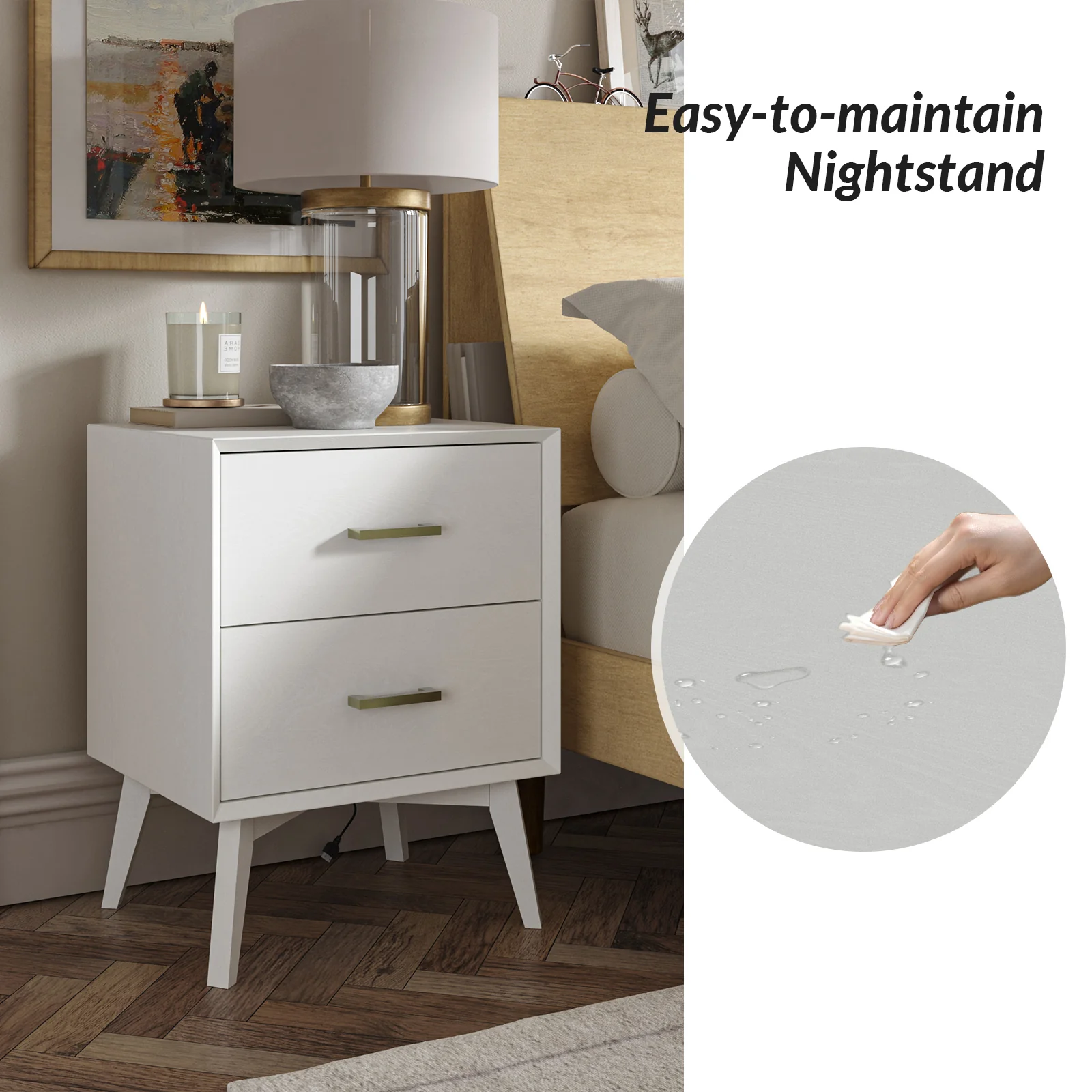 Enhance your home with this modern nightstand, combining practicality and elegance.� The surface is waterproof, scratch-resistant, and stain-resistant, providing durability and easy maintenance for everyday use. The drawers glide effortlessly on ball bearing glides, offering seamless and reliable operation. Stylish drawer handles add a touch of sophistication and offer easy access to items inside. The nightstands are supported by flared legs, providing stability and a contemporary aesthetic. Suitable for keeping your nighttime essentials organized and within reach, this nightstand set is a chic and functional addition to your bedroom.