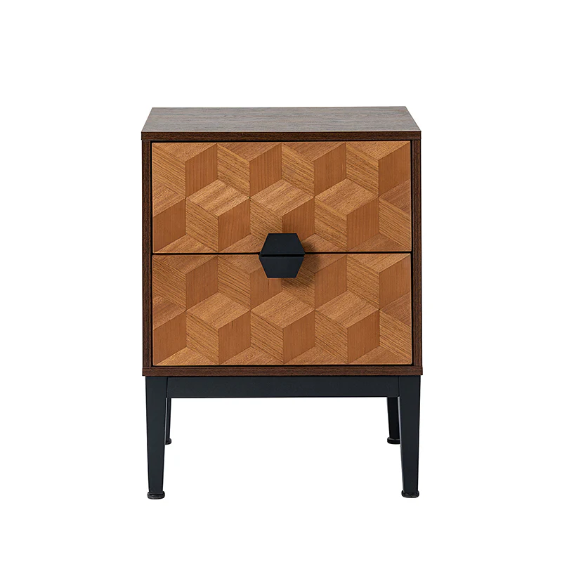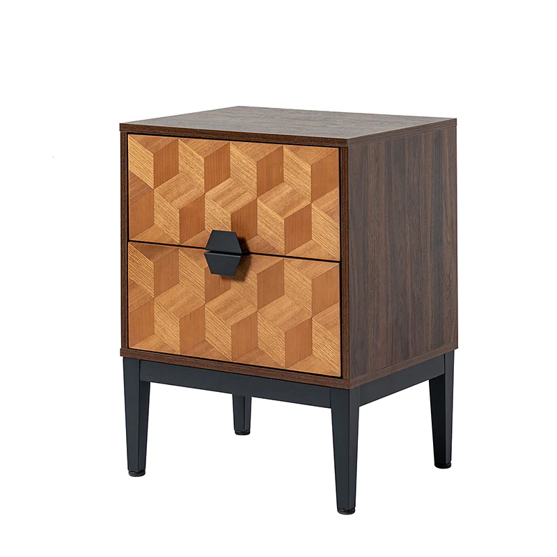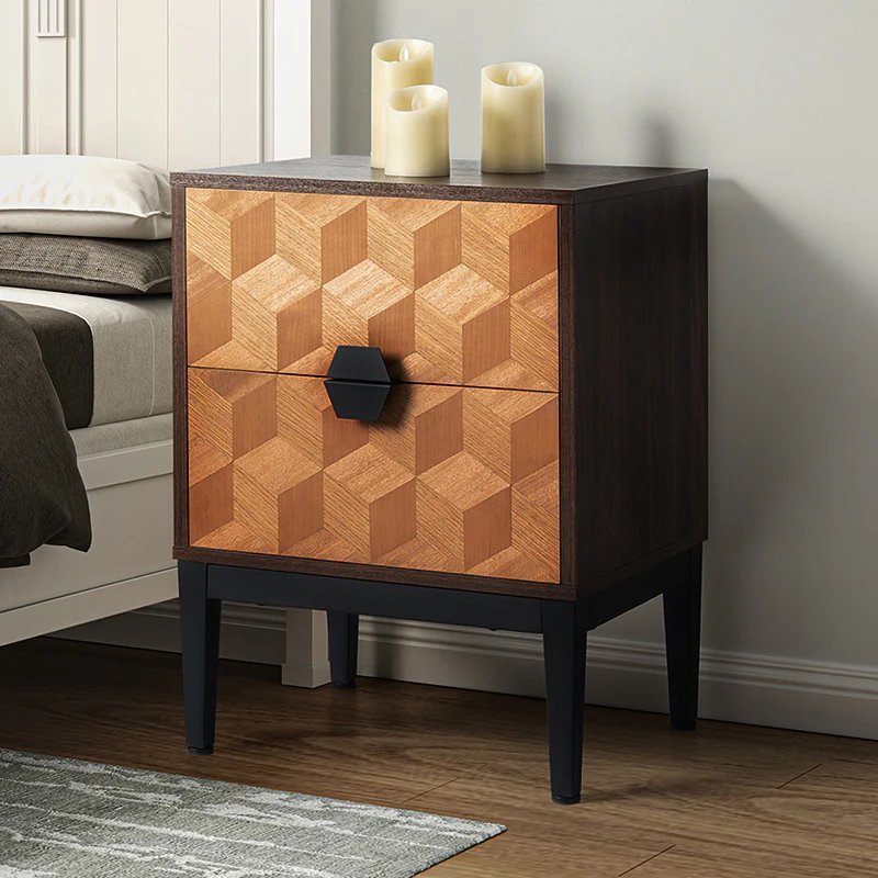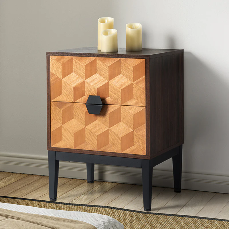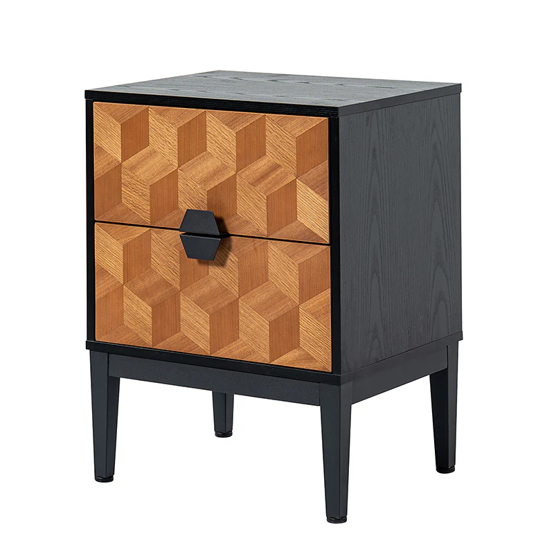 Experience modern sophistication with the contemporary geometric wood veneer parquet nightstand. Its sleek design is complemented by the exquisite wood veneer parquet pattern, exuding elegance. Equipped with a convenient charging station, it seamlessly combines functionality with style, allowing you to keep your devices powered throughout the night. The adjustable metal legs ensure stability on any surface while offering customizable height options. This nightstand perfectly balances form and function, making it a versatile addition to any bedroom. Elevate your space with its harmonious blend of contemporary aesthetics and practical features, enhancing both your d篓娄cor and daily life.