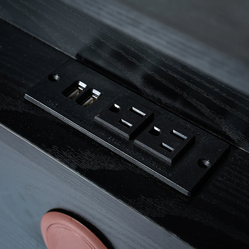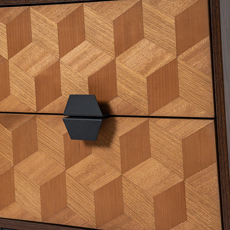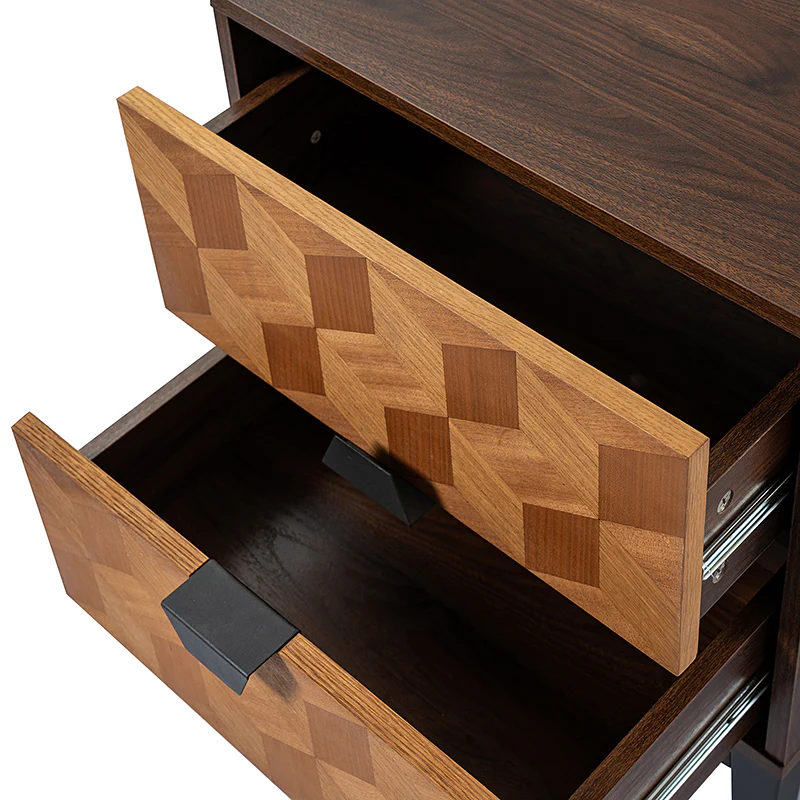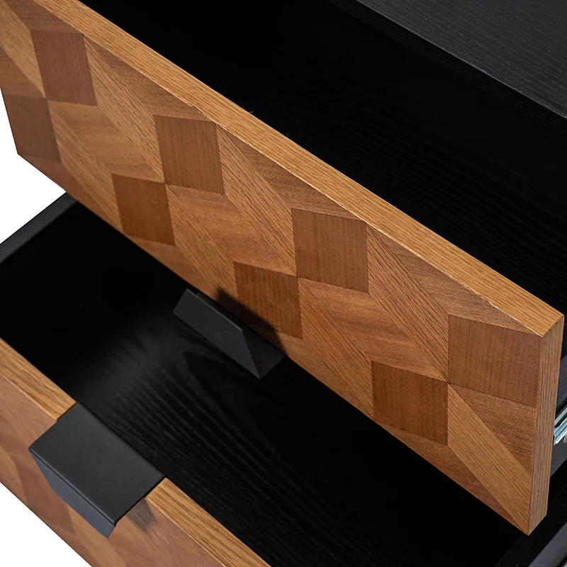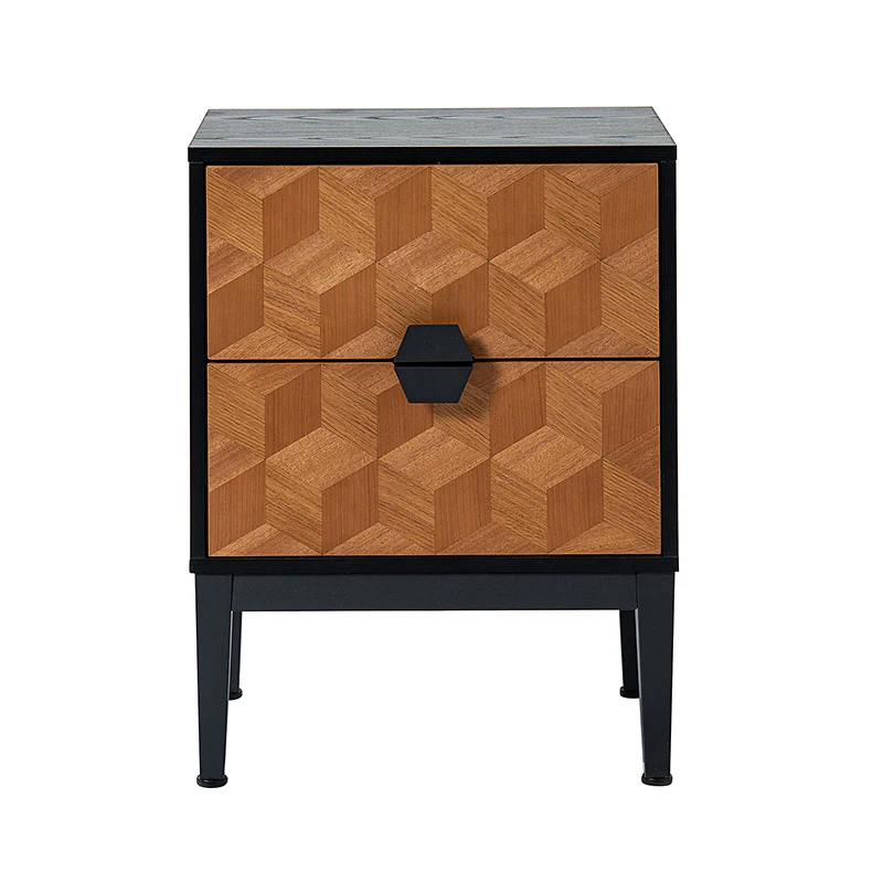 Experience modern sophistication with the contemporary geometric wood veneer parquet nightstand. Its sleek design is complemented by the exquisite wood veneer parquet pattern, exuding elegance. Equipped with a convenient charging station, it seamlessly combines functionality with style, allowing you to keep your devices powered throughout the night. The adjustable metal legs ensure stability on any surface while offering customizable height options. This nightstand perfectly balances form and function, making it a versatile addition to any bedroom. Elevate your space with its harmonious blend of contemporary aesthetics and practical features, enhancing both your d篓娄cor and daily life.