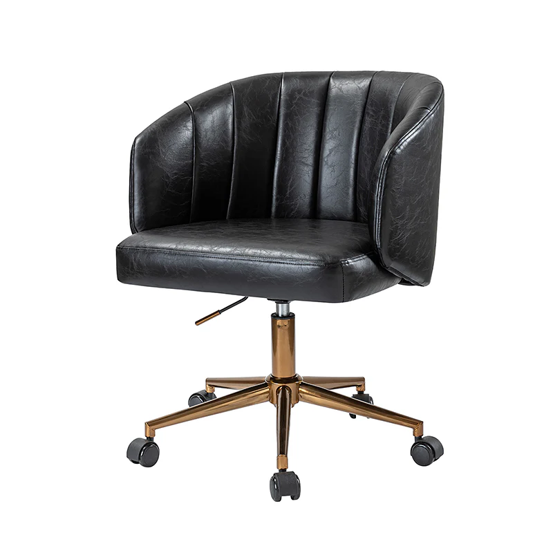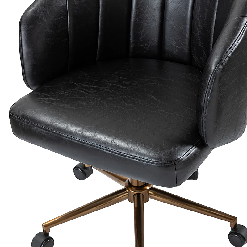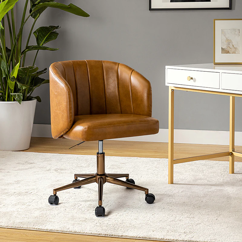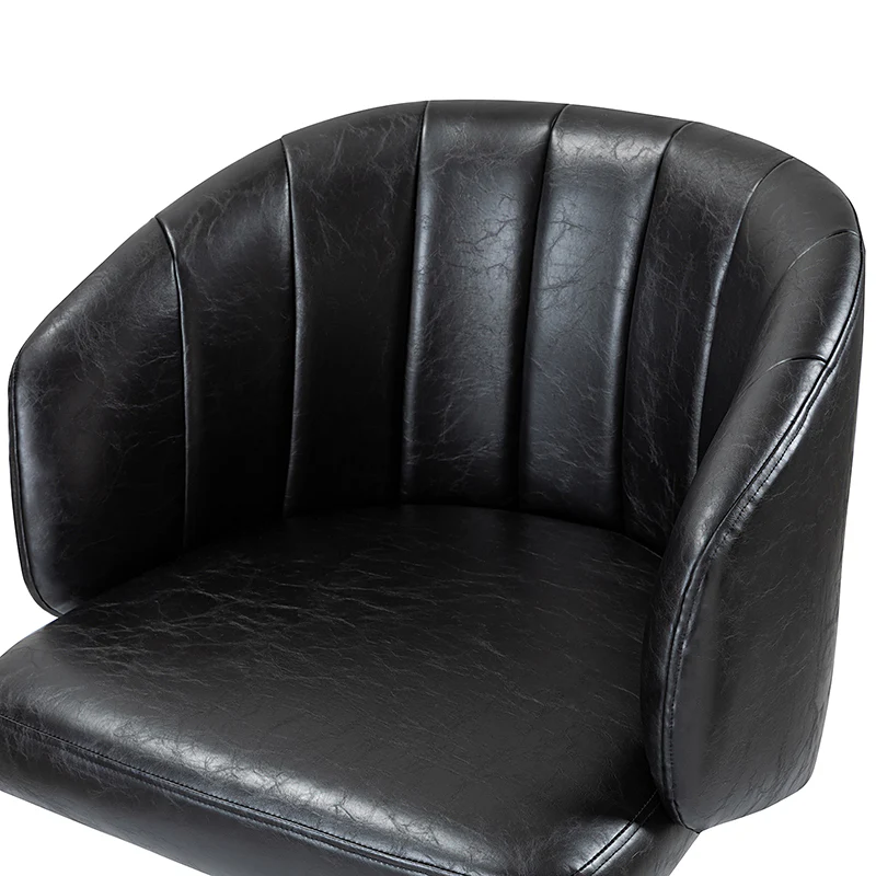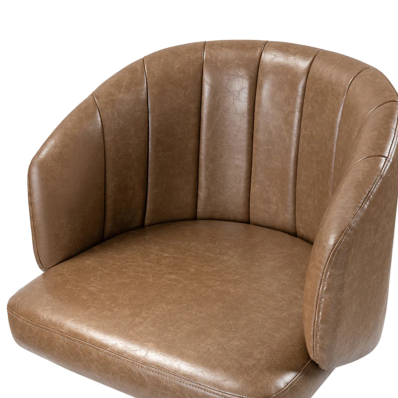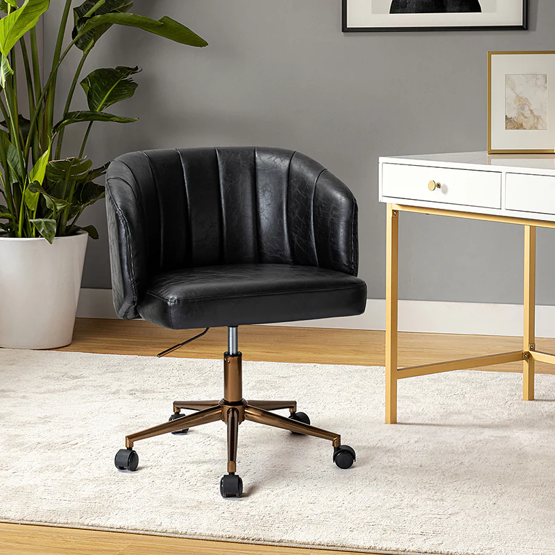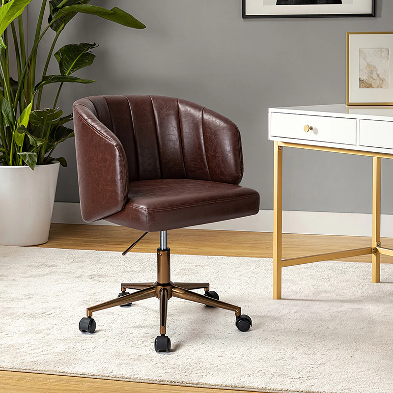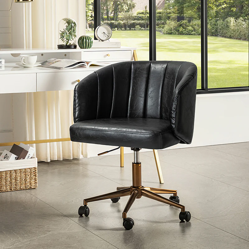 The vegan leather office chair with a mid-century design features a sleek and sophisticated aesthetic that adds a touch of elegance to any workspace. Its key feature is the channel barrel back, which provides excellent support and comfort for long hours of sitting. The chair is equipped with wheels, allowing for easy mobility and seamless movement across different areas of the office. Additionally, it offers the convenience of adjustable height, enabling users to customize the position of the chair to their preferred level of comfort. The combination of vegan leather upholstery, mid-century design, channel barrel back, wheels, and adjustable height makes this office chair a stylish and practical choice for any professional environment.