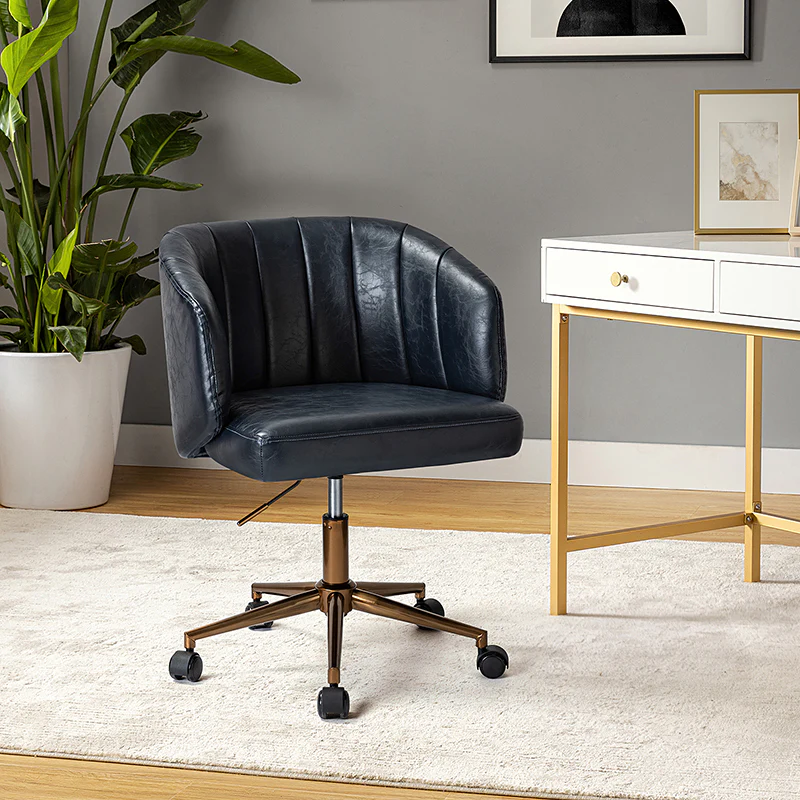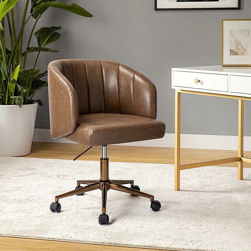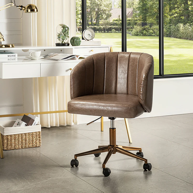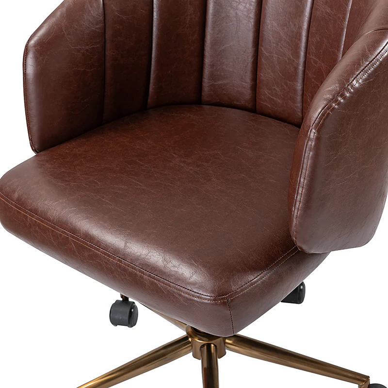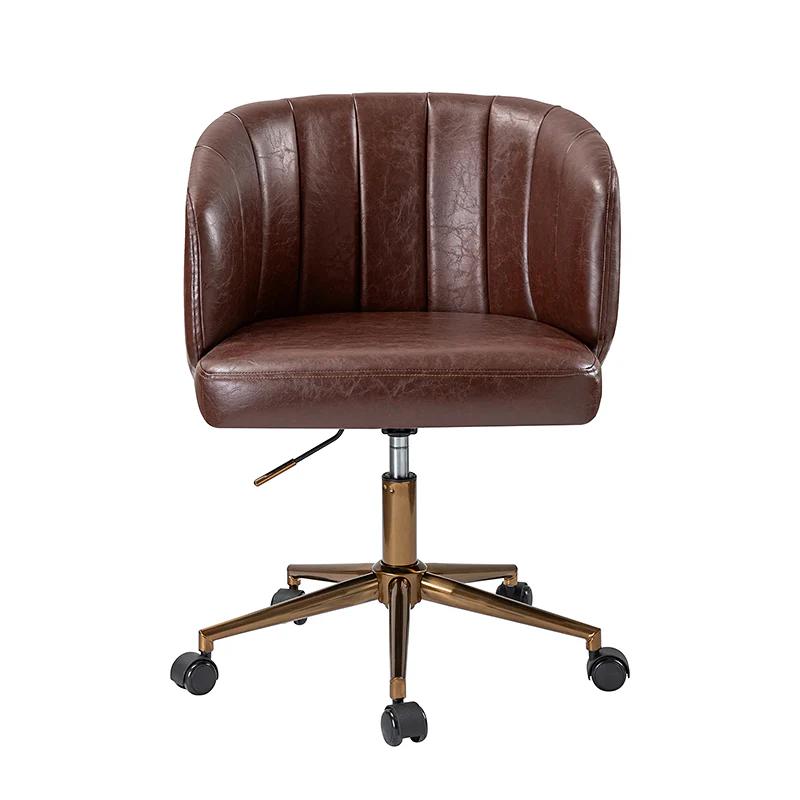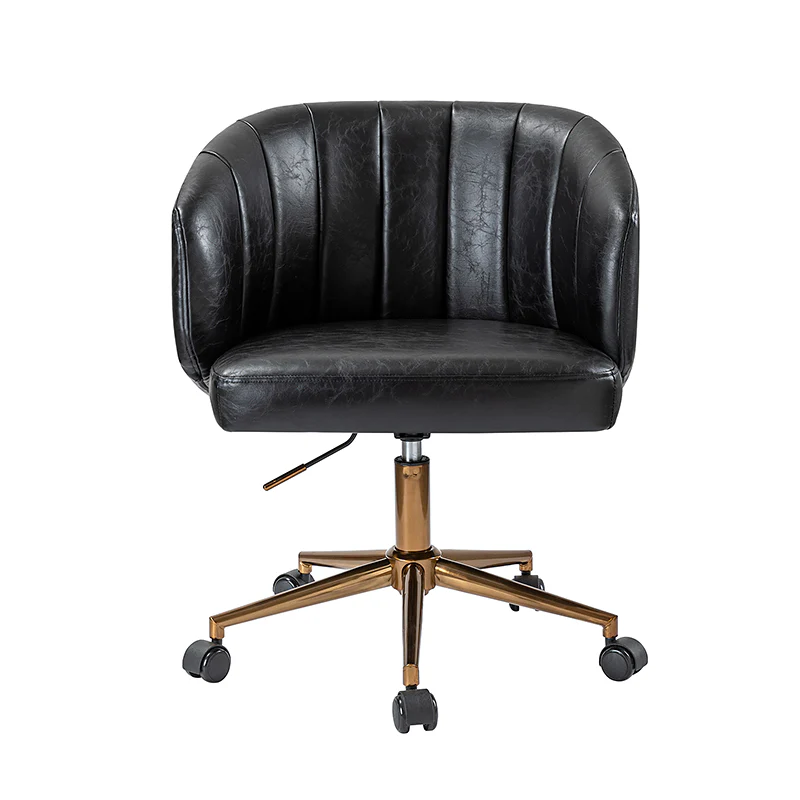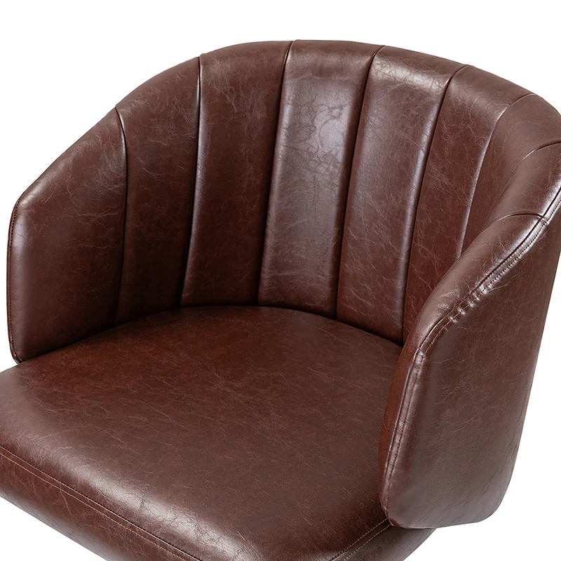 The vegan leather office chair with a mid-century design features a sleek and sophisticated aesthetic that adds a touch of elegance to any workspace. Its key feature is the channel barrel back, which provides excellent support and comfort for long hours of sitting. The chair is equipped with wheels, allowing for easy mobility and seamless movement across different areas of the office. Additionally, it offers the convenience of adjustable height, enabling users to customize the position of the chair to their preferred level of comfort. The combination of vegan leather upholstery, mid-century design, channel barrel back, wheels, and adjustable height makes this office chair a stylish and practical choice for any professional environment.