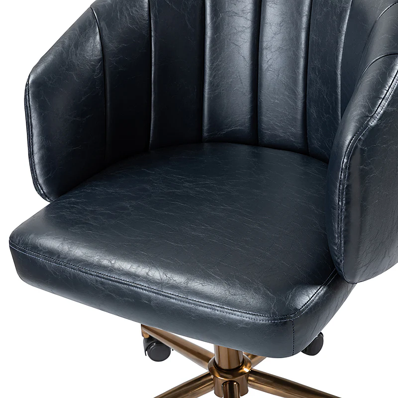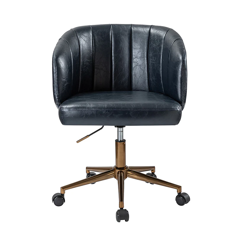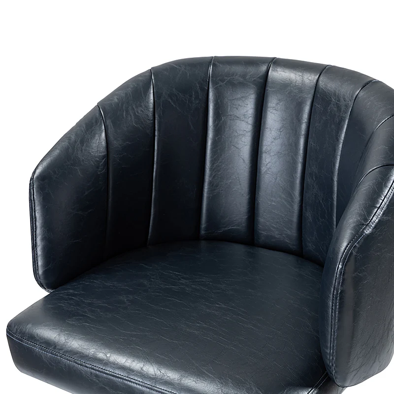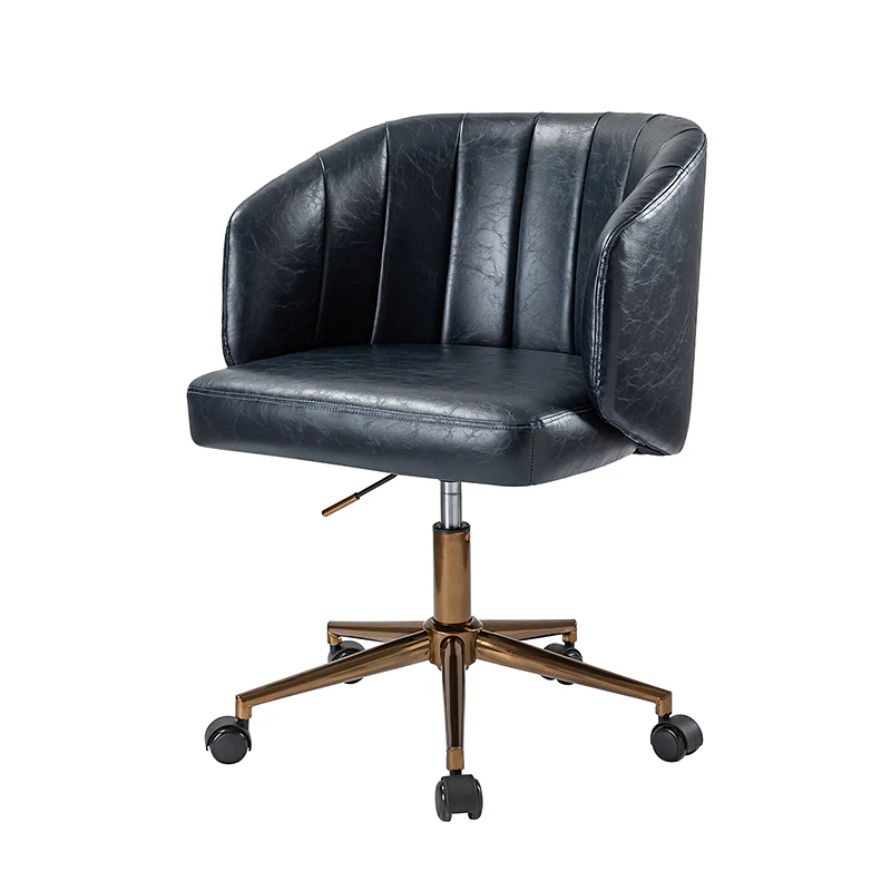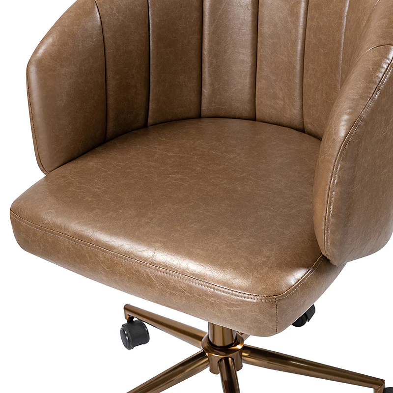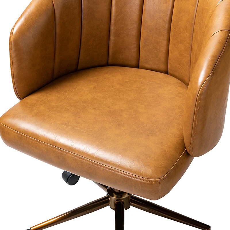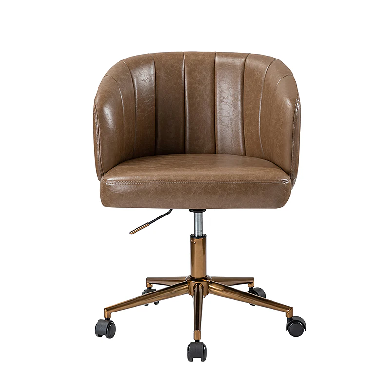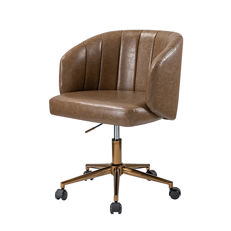 The vegan leather office chair with a mid-century design features a sleek and sophisticated aesthetic that adds a touch of elegance to any workspace. Its key feature is the channel barrel back, which provides excellent support and comfort for long hours of sitting. The chair is equipped with wheels, allowing for easy mobility and seamless movement across different areas of the office. Additionally, it offers the convenience of adjustable height, enabling users to customize the position of the chair to their preferred level of comfort. The combination of vegan leather upholstery, mid-century design, channel barrel back, wheels, and adjustable height makes this office chair a stylish and practical choice for any professional environment.