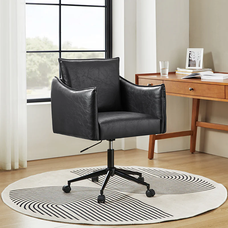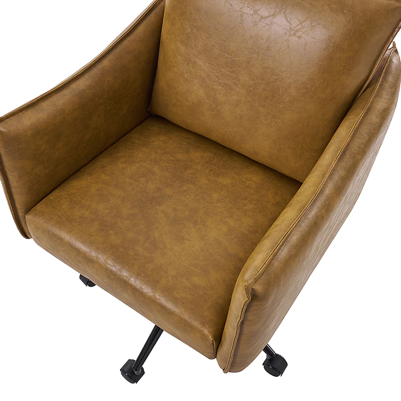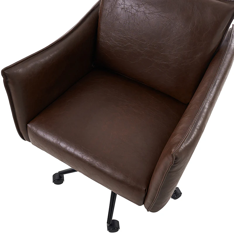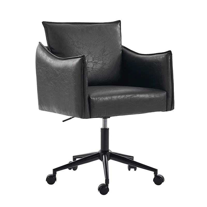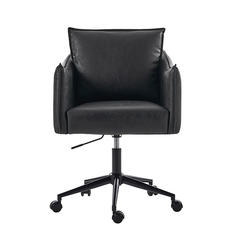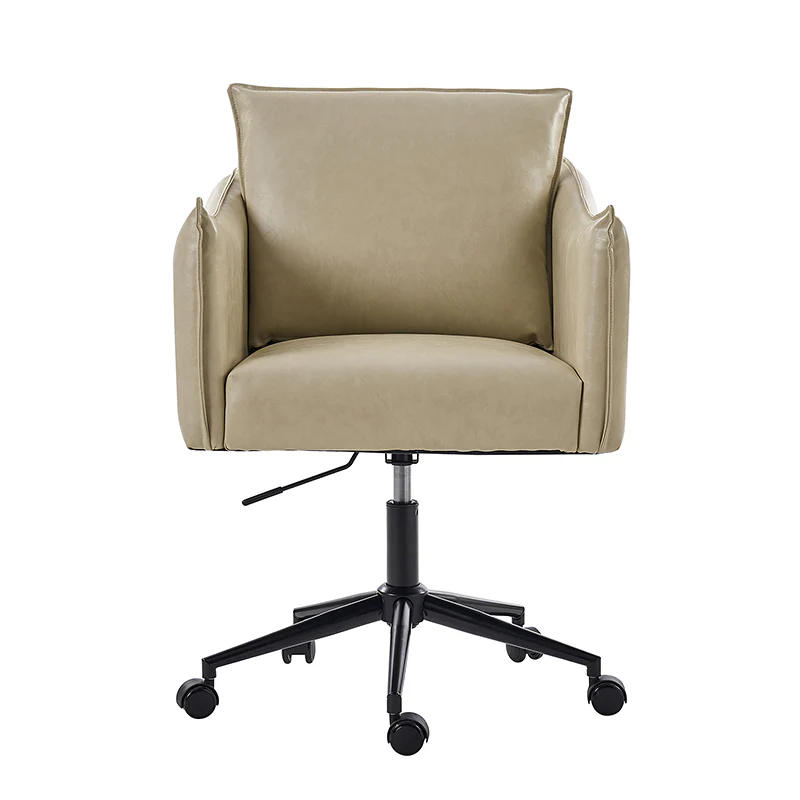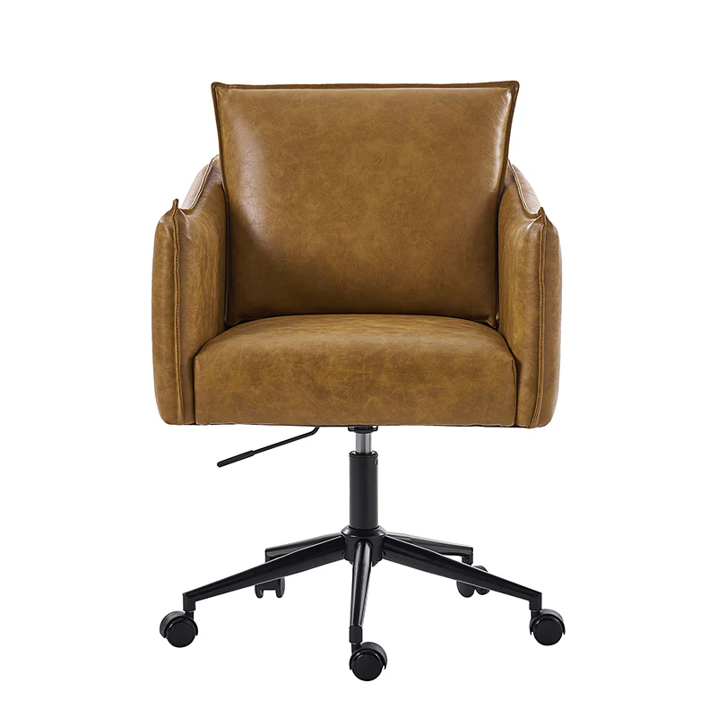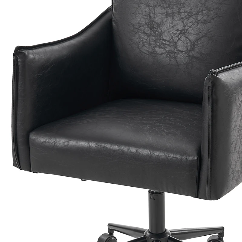 Upgrade your workspace with the modern, industrial-style office chair. Wrapped in sleek quality PU leather with folded edges, it exudes contemporary appeal. Designed for versatility, the office chair features a 360-degree swivel and comes equipped with five smooth-rolling wheels for effortless mobility. Tailor your seating experience with easy up-and-down adjustment, allowing you to find a suitable height for your desk. The chair is equipped with a stainless steel gas spring holding the SGS certificate, ensuring durability and stability. Elevate your home office with this stylish and functional chair, striking the balance between comfort and cutting-edge design.