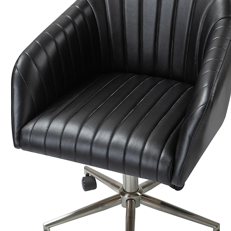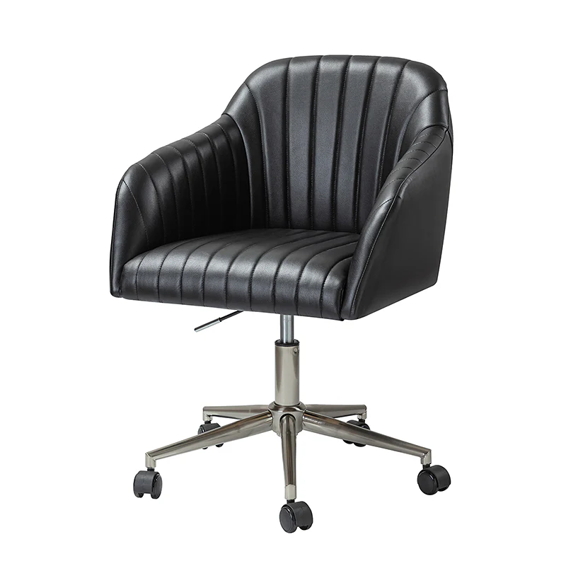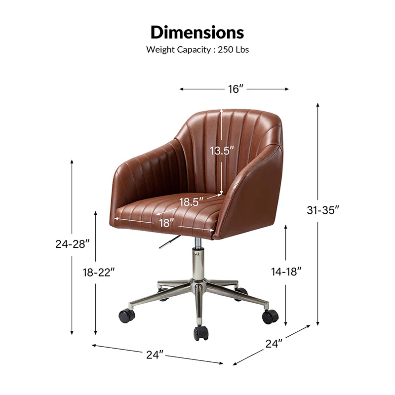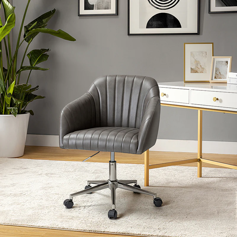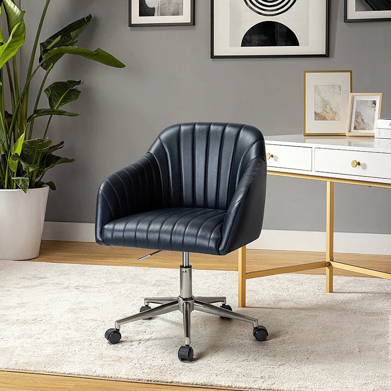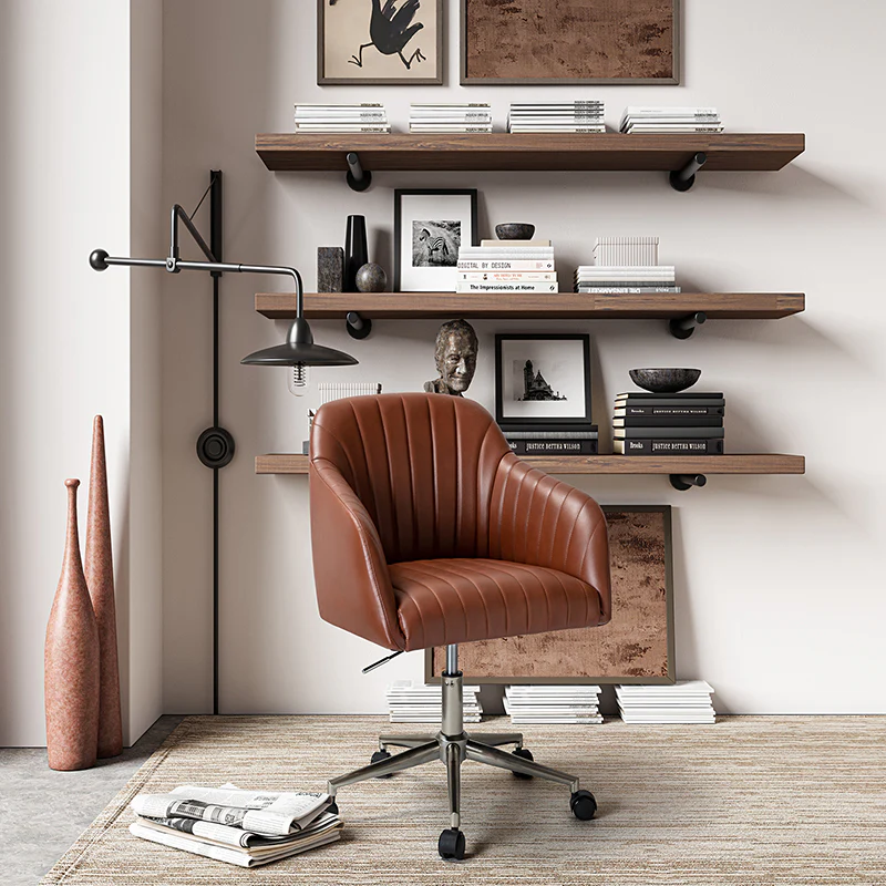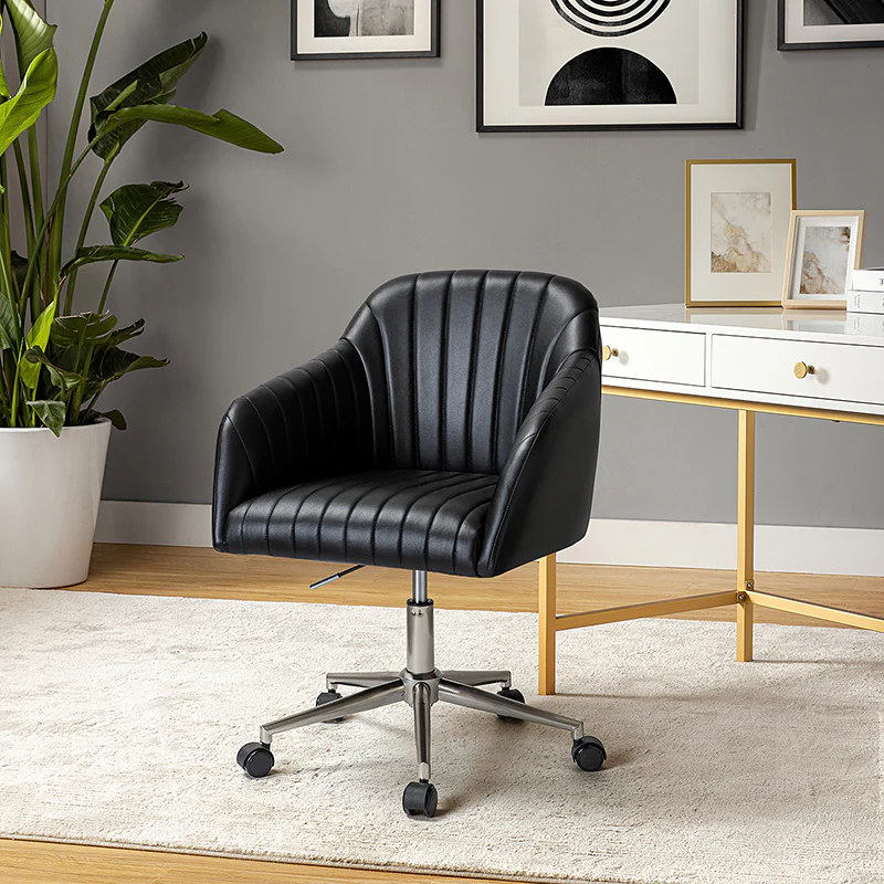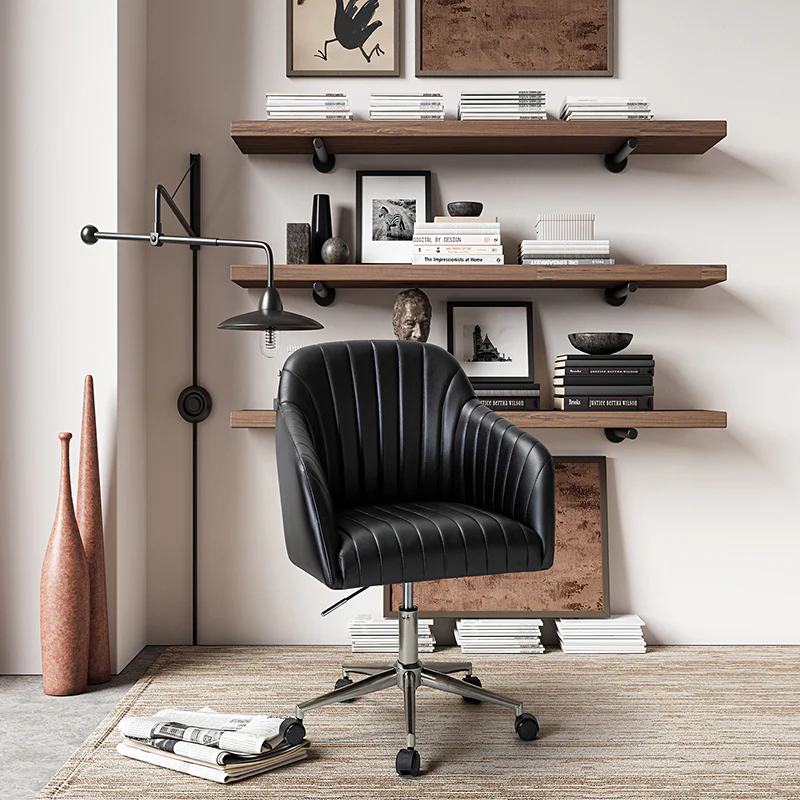 This contemporary ergonomic office chair with a quilted design, is an ideal pick, whether you're completing your home office or office conference room. Offering the appeal of mid-century-inspired decor to your abode, it features round arms and a solid back with a vertical channel running the length. Plus, you can change the height of the seat, and swivel a full 360-degree. The vegan leather is waterproof and resistant to oil stains, and offers ample support and a stylish touch that complements traditional, transitional, vintage, and classic home styles.