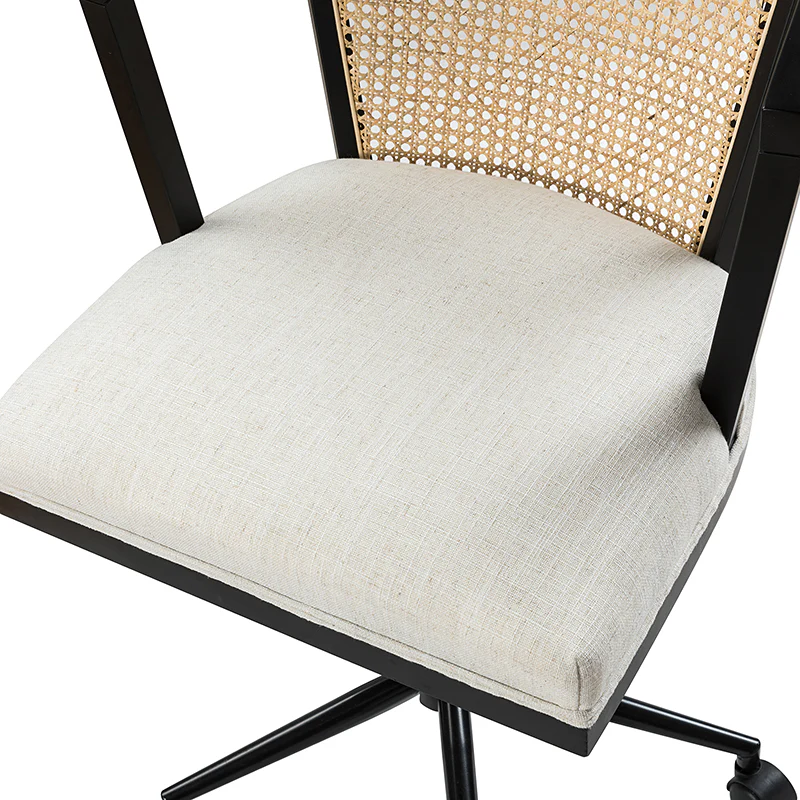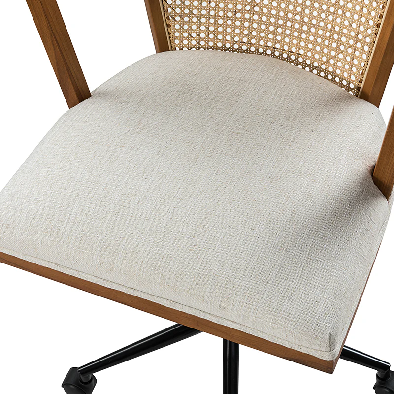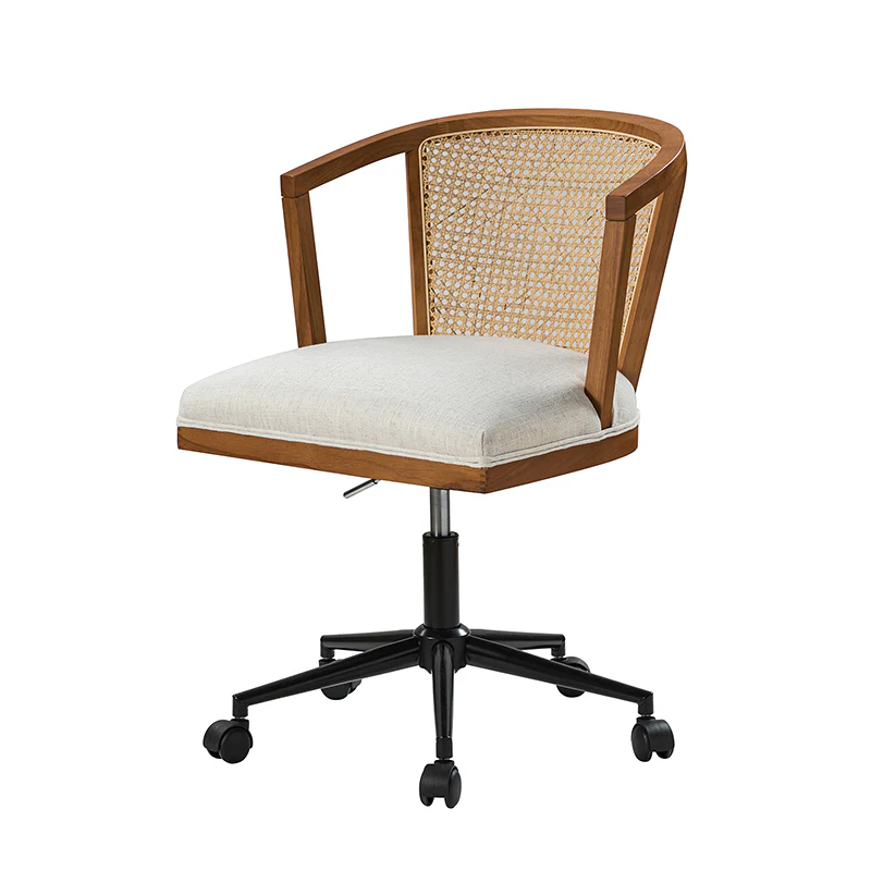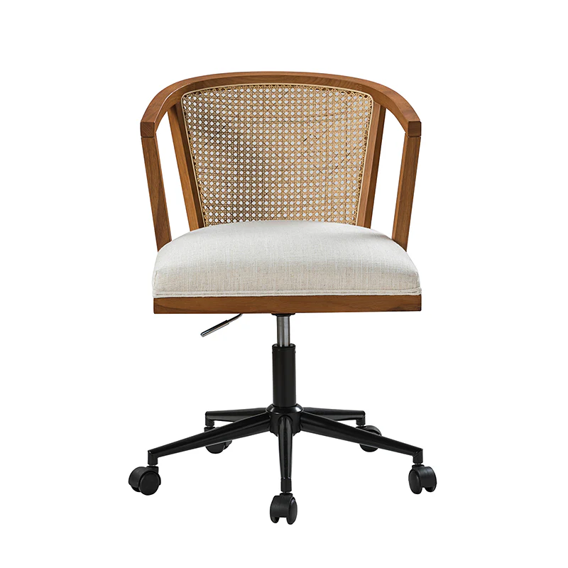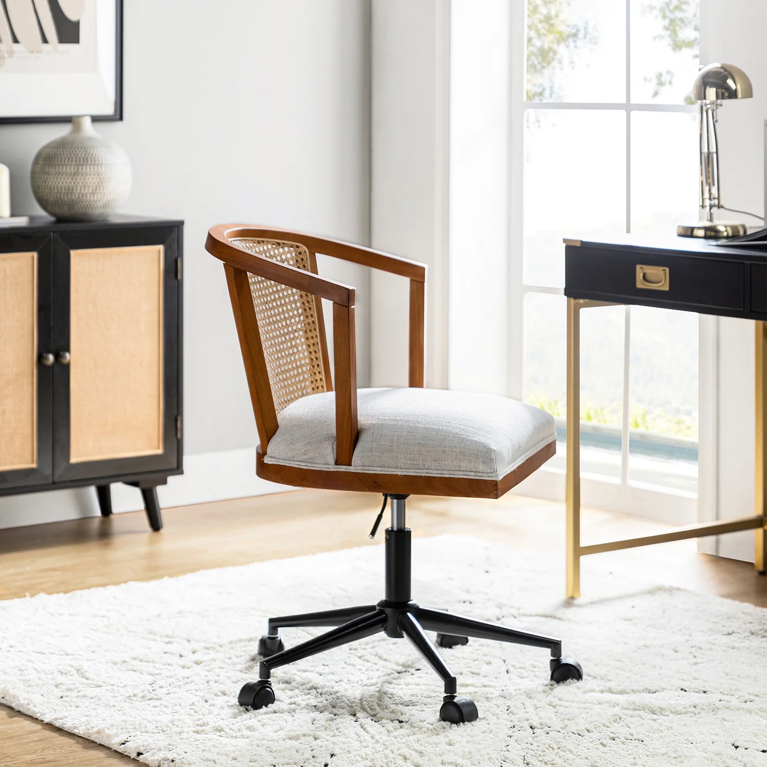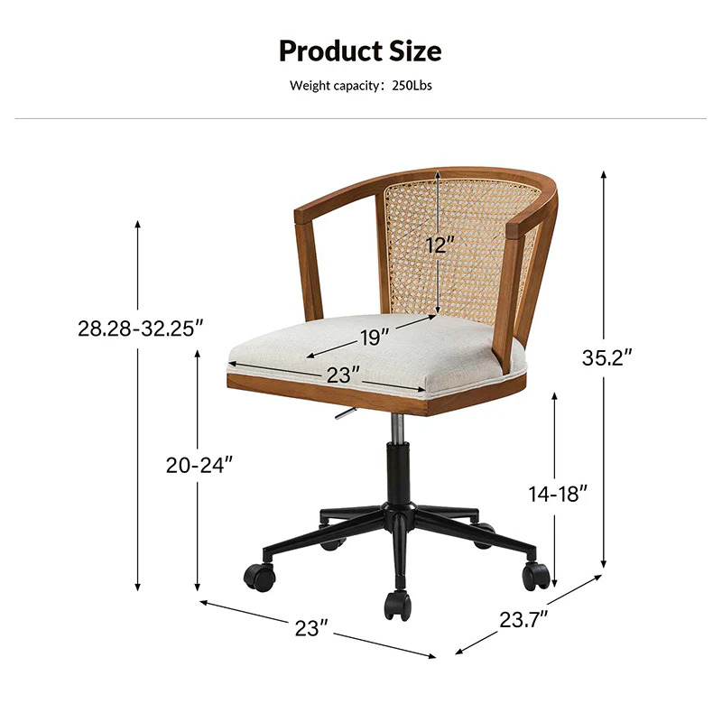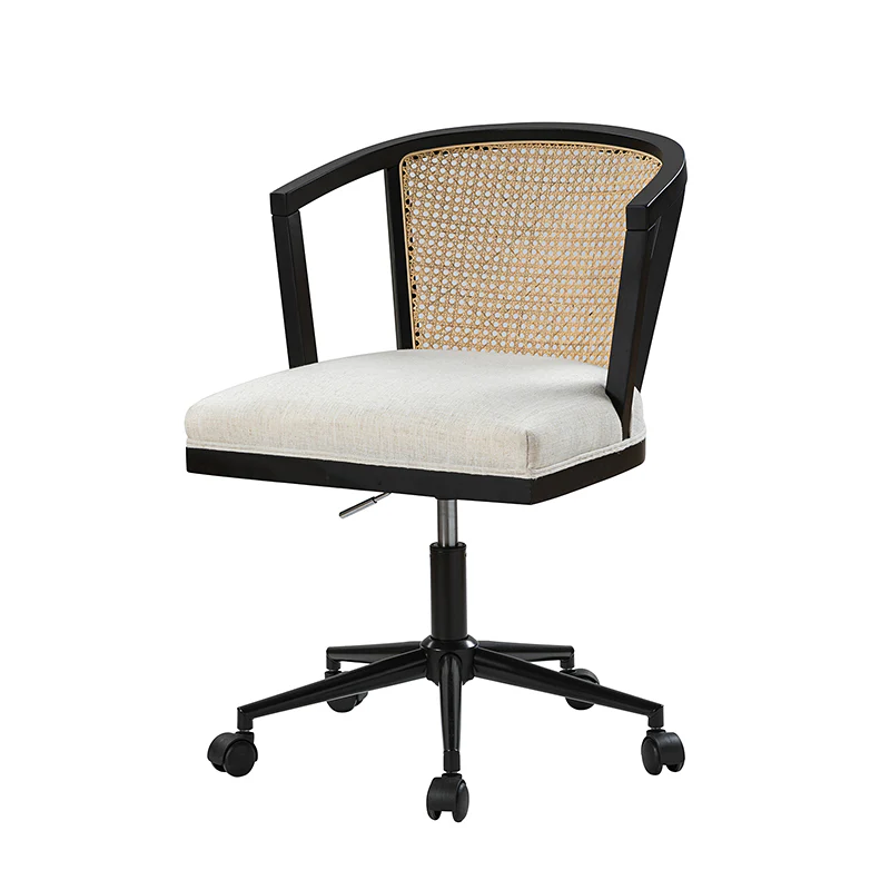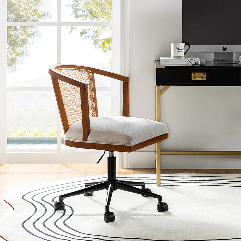Immerse yourself in this contemporary office chair with solid wood construction, as the rattan backrest with a curved profile creates a captivating visual feast. Meticulously crafted, the five-caster design enables seamless gliding across your space, providing effortless movement and unwavering stability. Embrace the versatility, as it complements a range of styles, from the Boho and farmhouse aesthetics to the sleek modern vibe. Indulge in maximum comfort with its high-density foam filling, it provides plush support during extended work hours. Plus, the 360-degree swivel and height adjustment function allows for customizable positioning. Transform your home office with the flawless fusion of comfort and stability, as this task chair elevates your productivity and imbues your workspace with a heightened sense of sophistication.