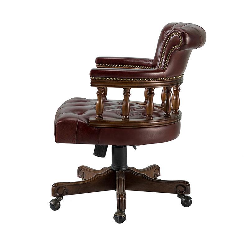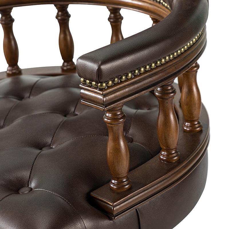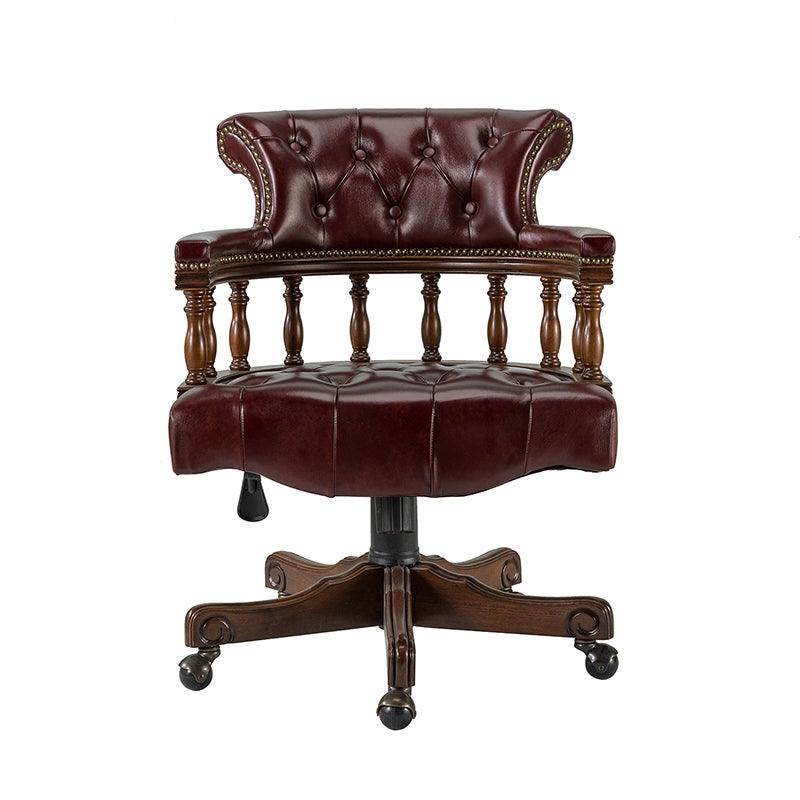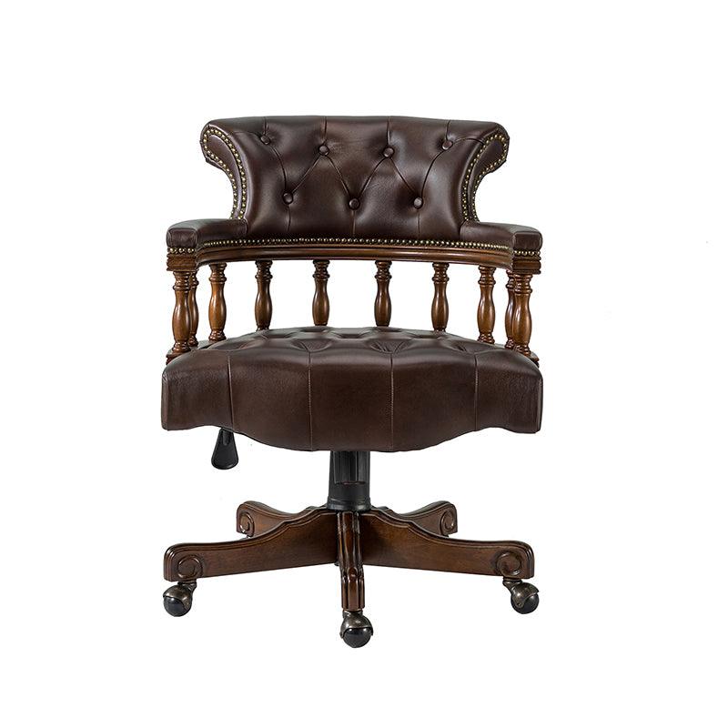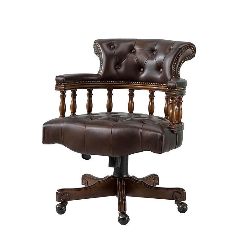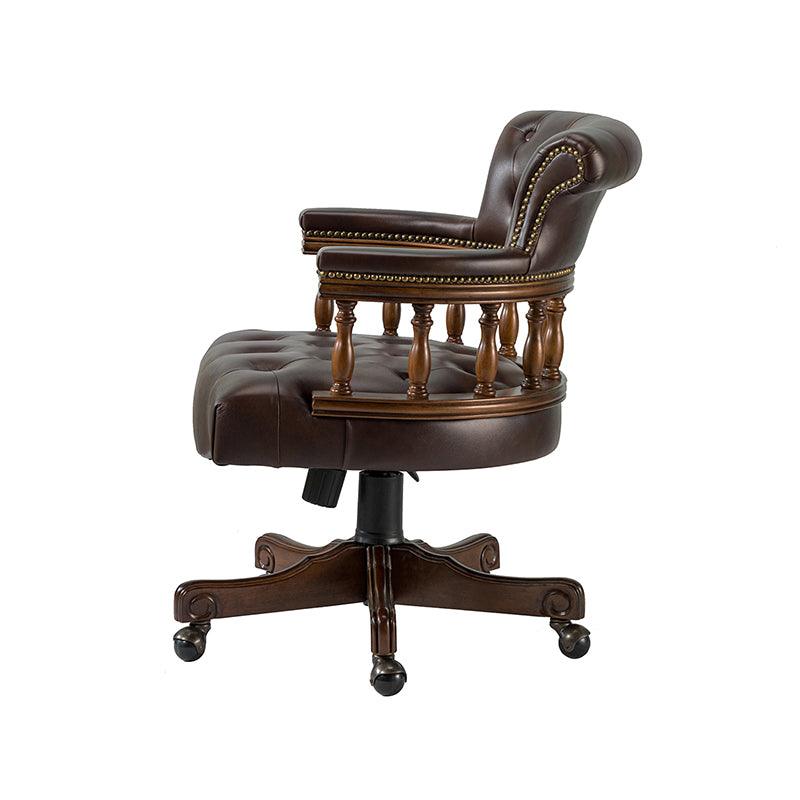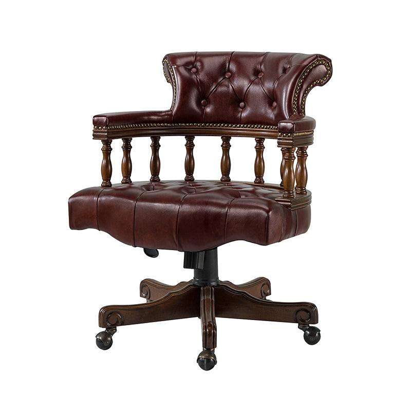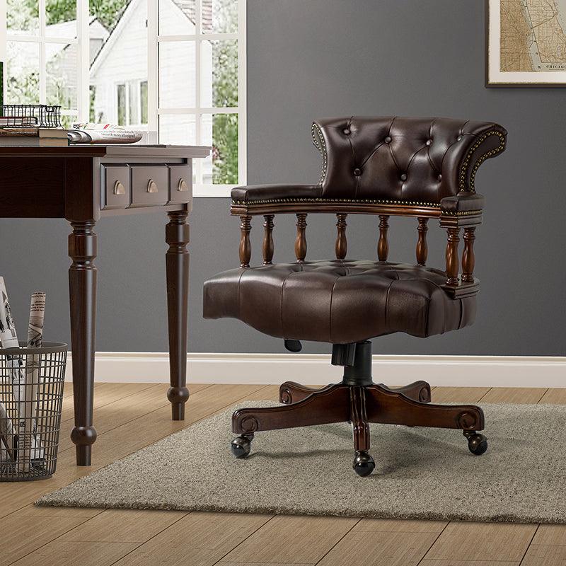 This traditional office chair is the perfect addition to your home or office. It is made of genuine leather and features a beautiful button-tufted design to give your office area a luxurious look. The nail-head trims on the body of the Chesterfield office chair with a swivel base give it a regal feel. It is adjustable in height and complemented by the hand-carved wood on the back of the chair, adding elegance to this chair. The upholstered cushion and padded armrests provide added comfort when sitting for long periods of time, working in style and comfort. Beautiful to look at, well made, and comfortable to sit in, this traditional executive chair is a great collector's item for those looking for a classic office environment. Come and buy it now!
