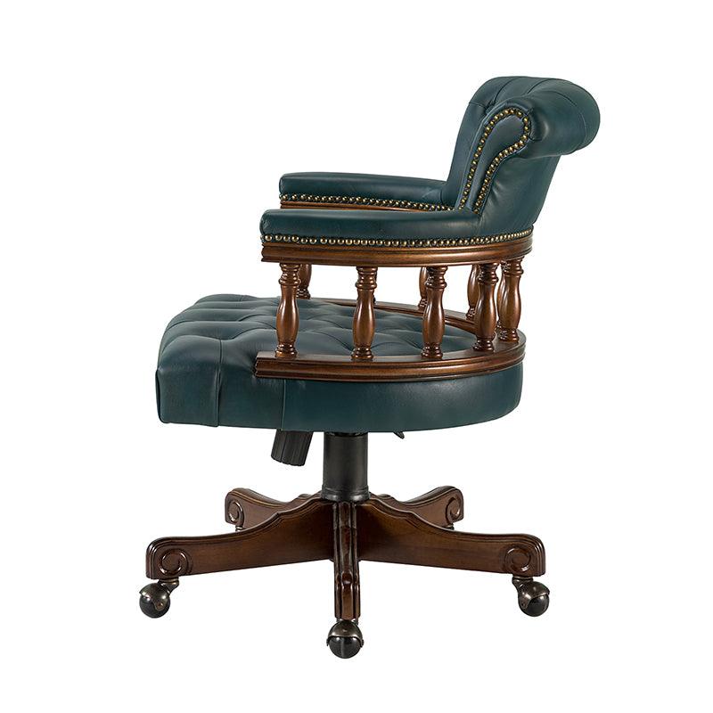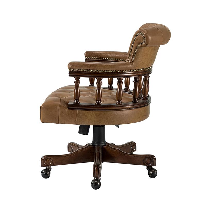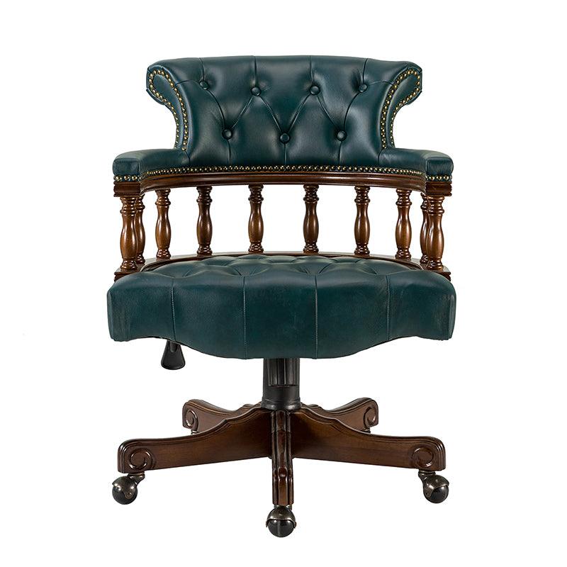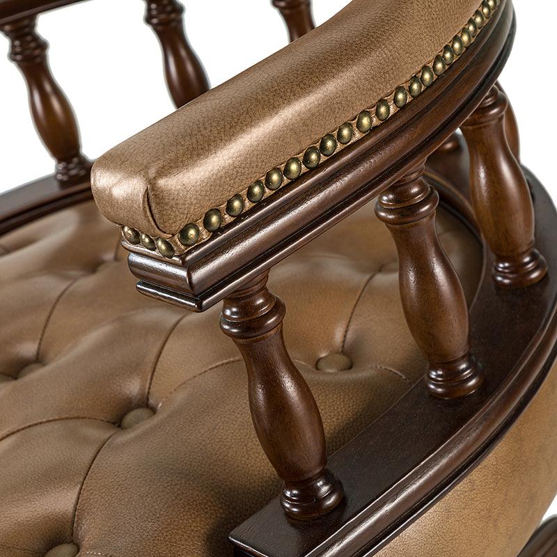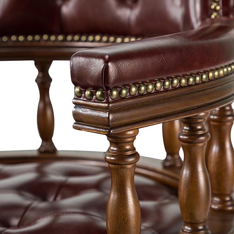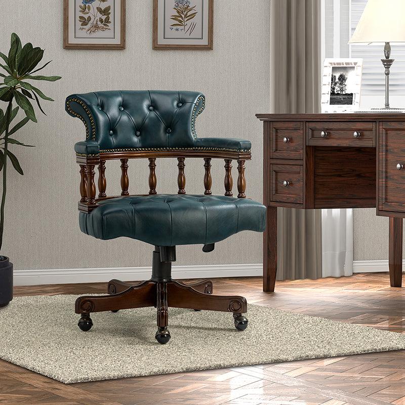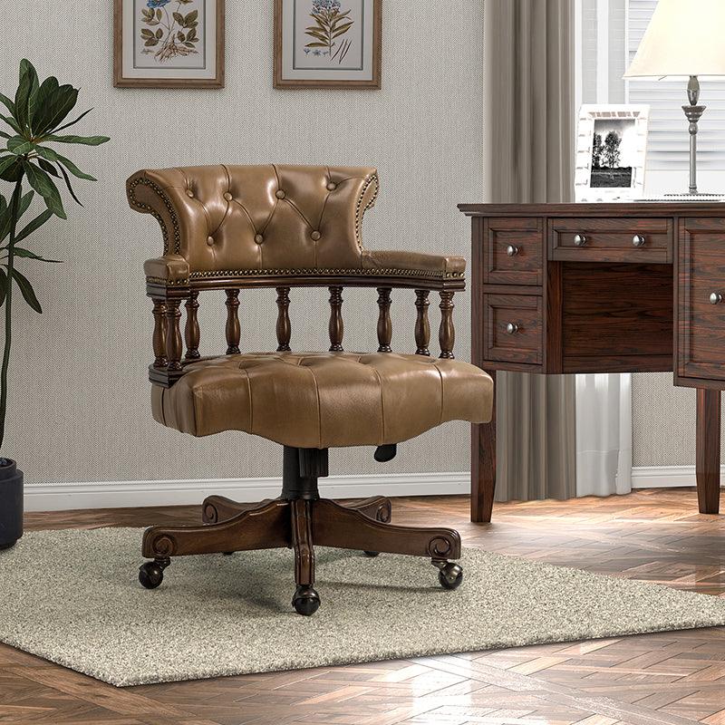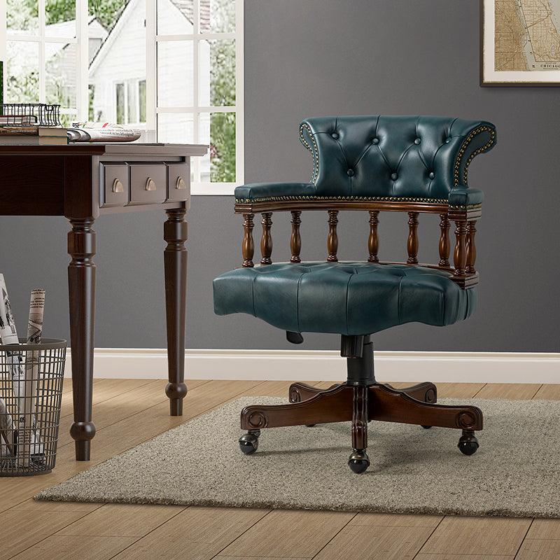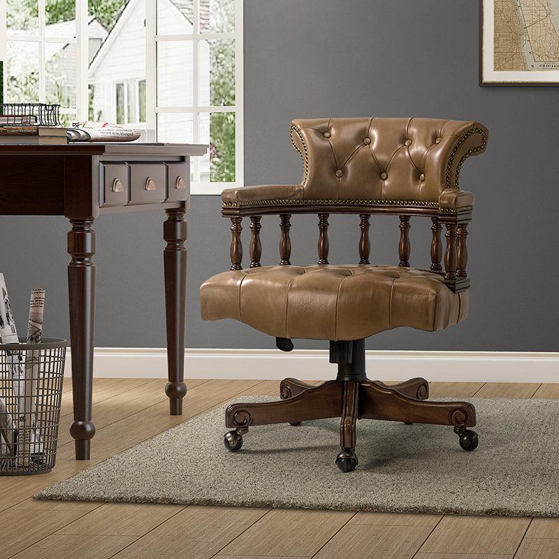 This traditional office chair is the perfect addition to your home or office. It is made of genuine leather and features a beautiful button-tufted design to give your office area a luxurious look. The nail-head trims on the body of the Chesterfield office chair with a swivel base give it a regal feel. It is adjustable in height and complemented by the hand-carved wood on the back of the chair, adding elegance to this chair. The upholstered cushion and padded armrests provide added comfort when sitting for long periods of time, working in style and comfort. Beautiful to look at, well made, and comfortable to sit in, this traditional executive chair is a great collector's item for those looking for a classic office environment. Come and buy it now!