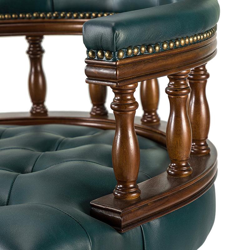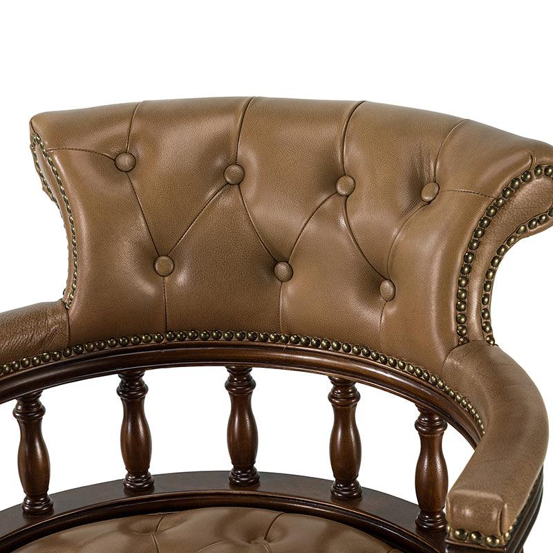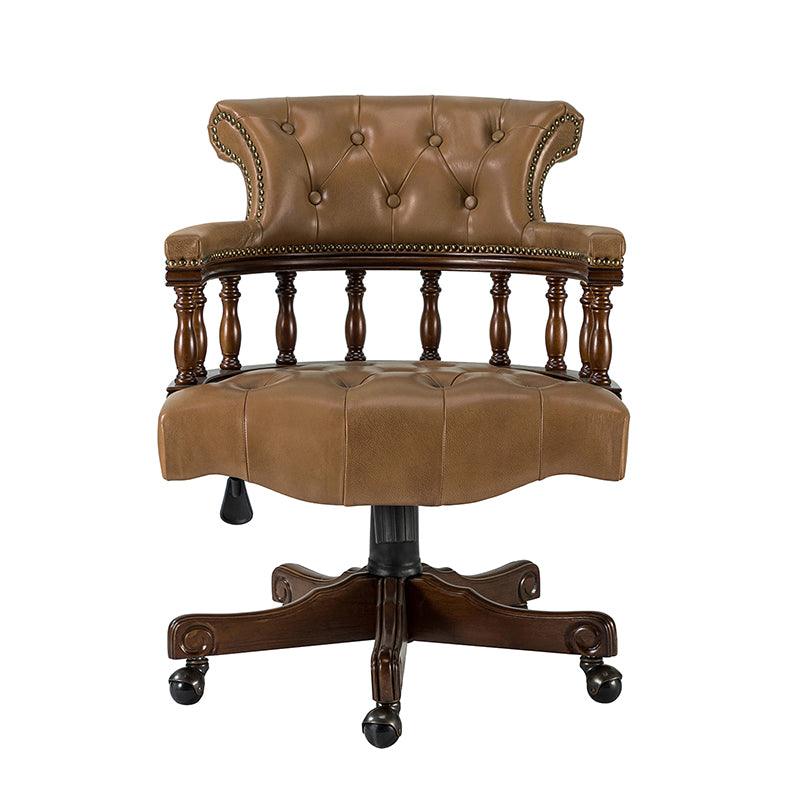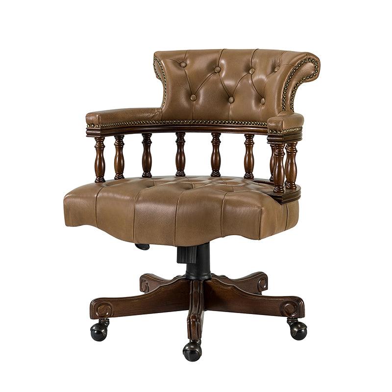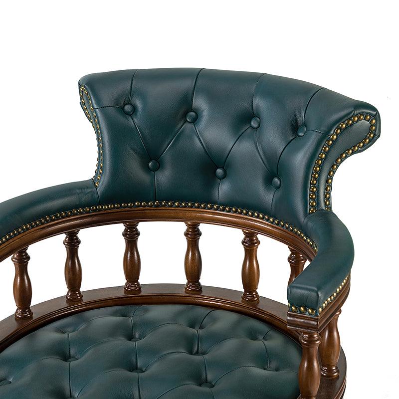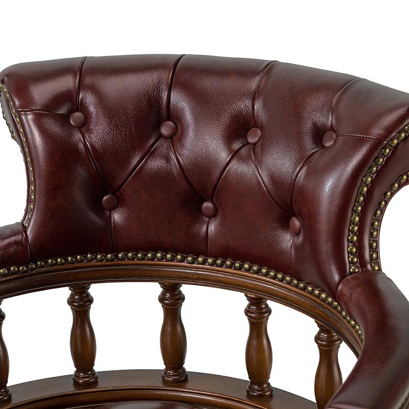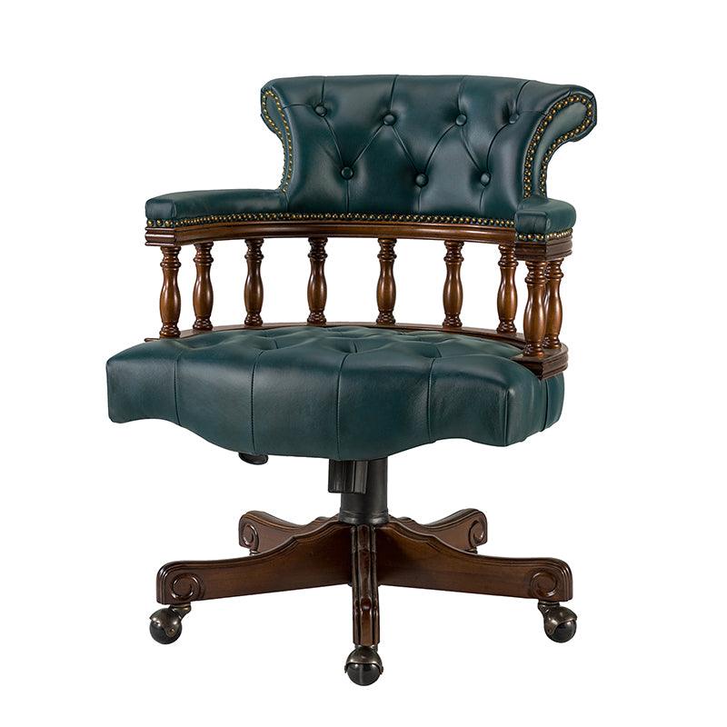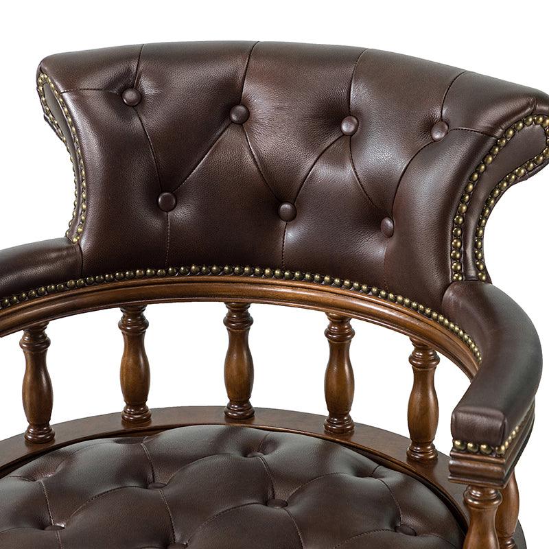 This traditional office chair is the perfect addition to your home or office. It is made of genuine leather and features a beautiful button-tufted design to give your office area a luxurious look. The nail-head trims on the body of the Chesterfield office chair with a swivel base give it a regal feel. It is adjustable in height and complemented by the hand-carved wood on the back of the chair, adding elegance to this chair. The upholstered cushion and padded armrests provide added comfort when sitting for long periods of time, working in style and comfort. Beautiful to look at, well made, and comfortable to sit in, this traditional executive chair is a great collector's item for those looking for a classic office environment. Come and buy it now!