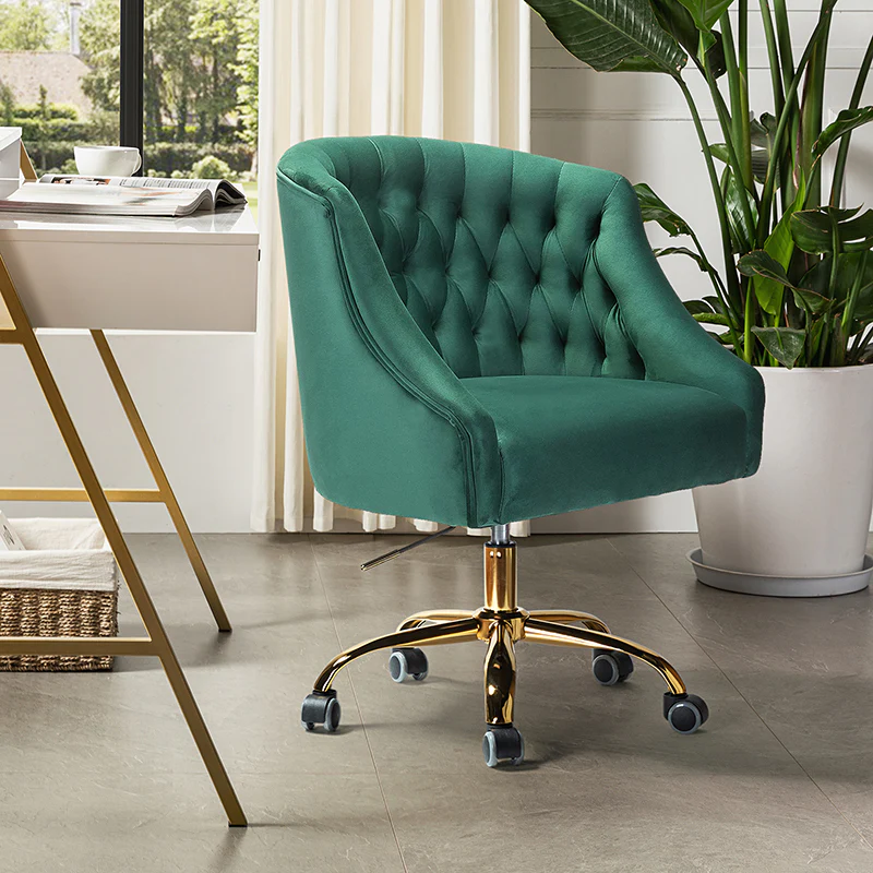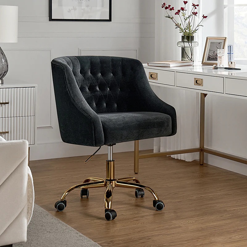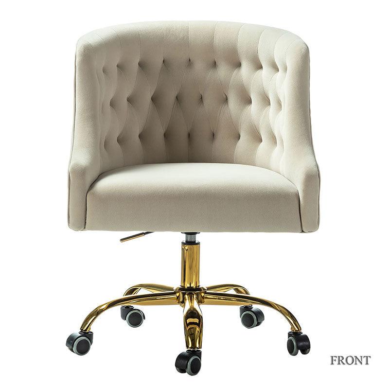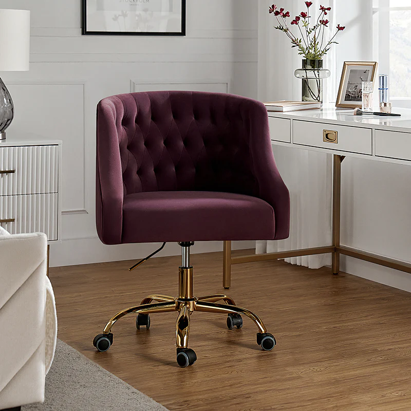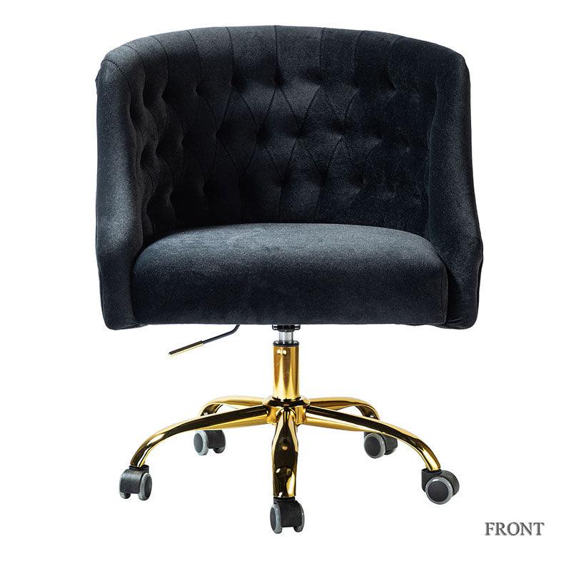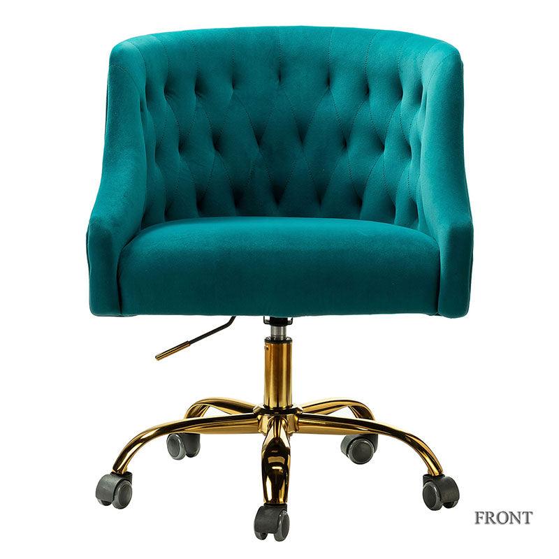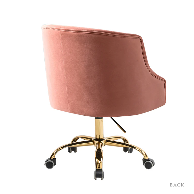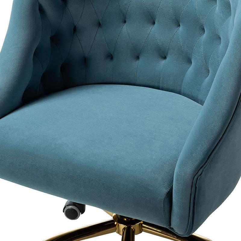 Start tab labels This isn't your standard office chair but you didn't want standard anyway, did you? It showcases a modified wingback design with a rounded back and sloped, recessed arms for an elegant look. Button-tufted details dot the back for a touch of texture. This office chair is upholstered in velvet fabric with a solid hue that adds a glam, modern touch to your home office. Down below, it features gold-finish metal legs and five casters that allow smooth movement across your carpet or floor.