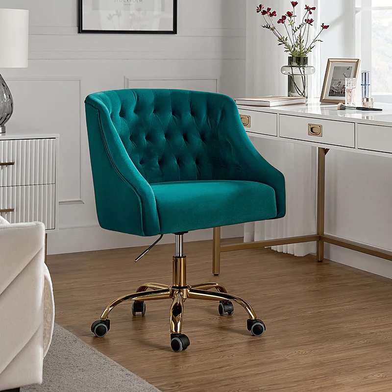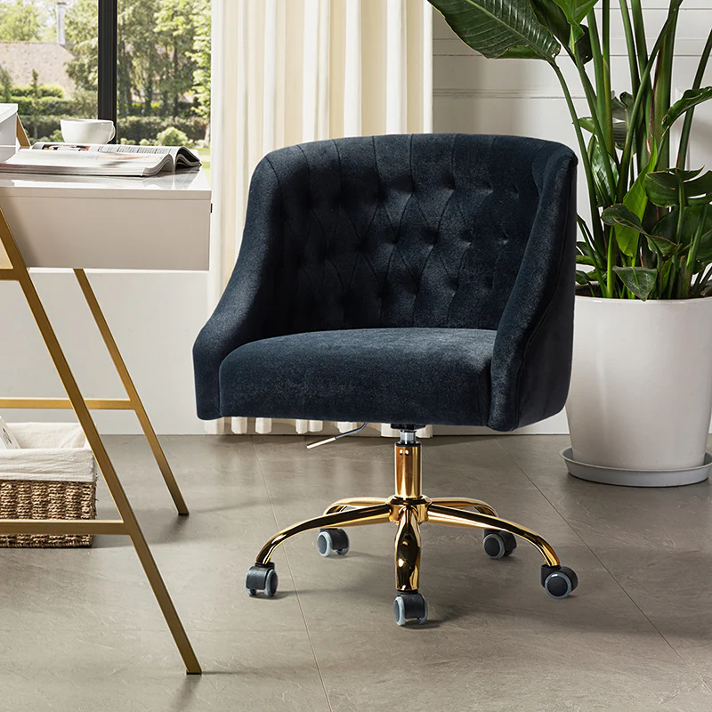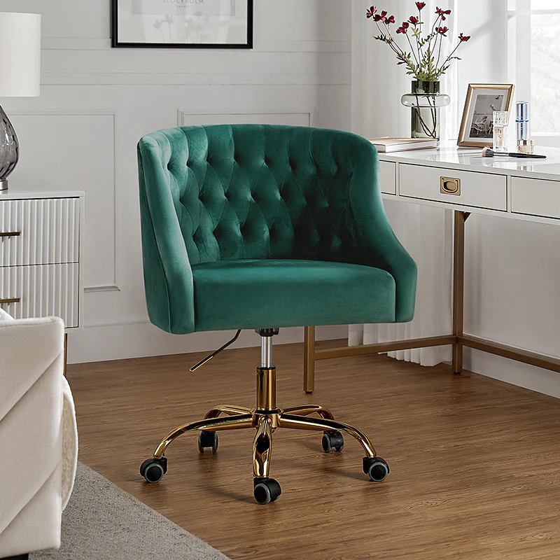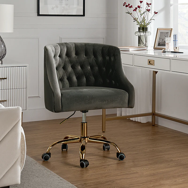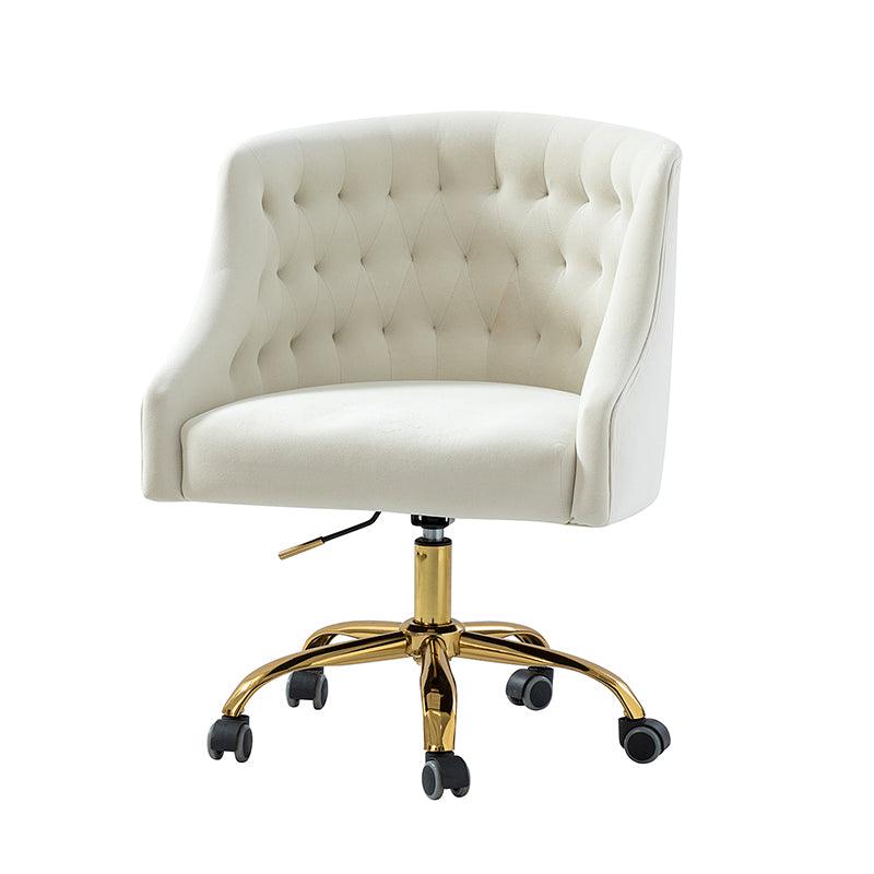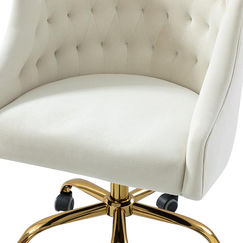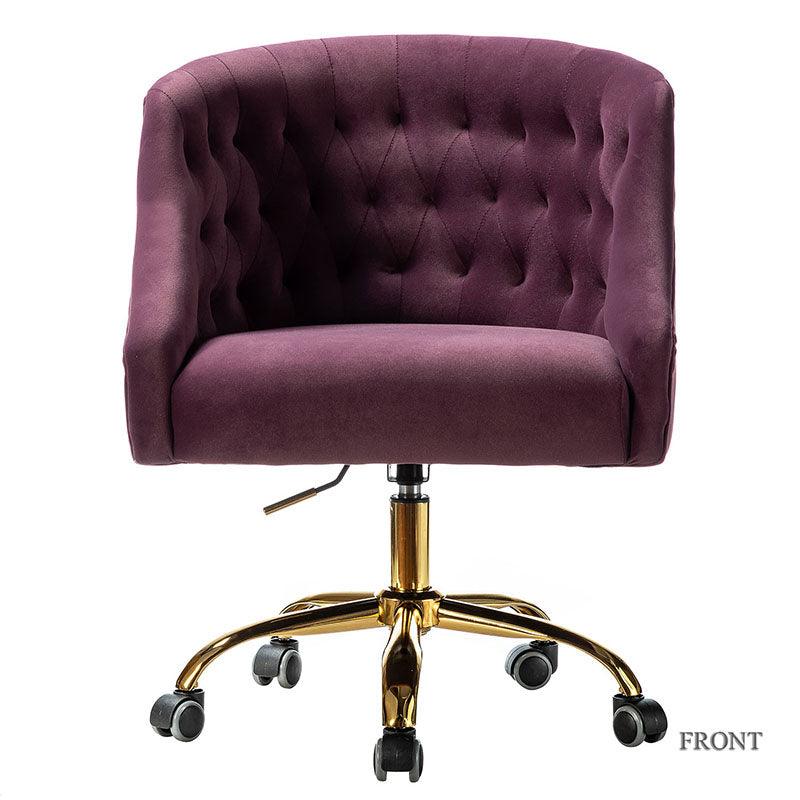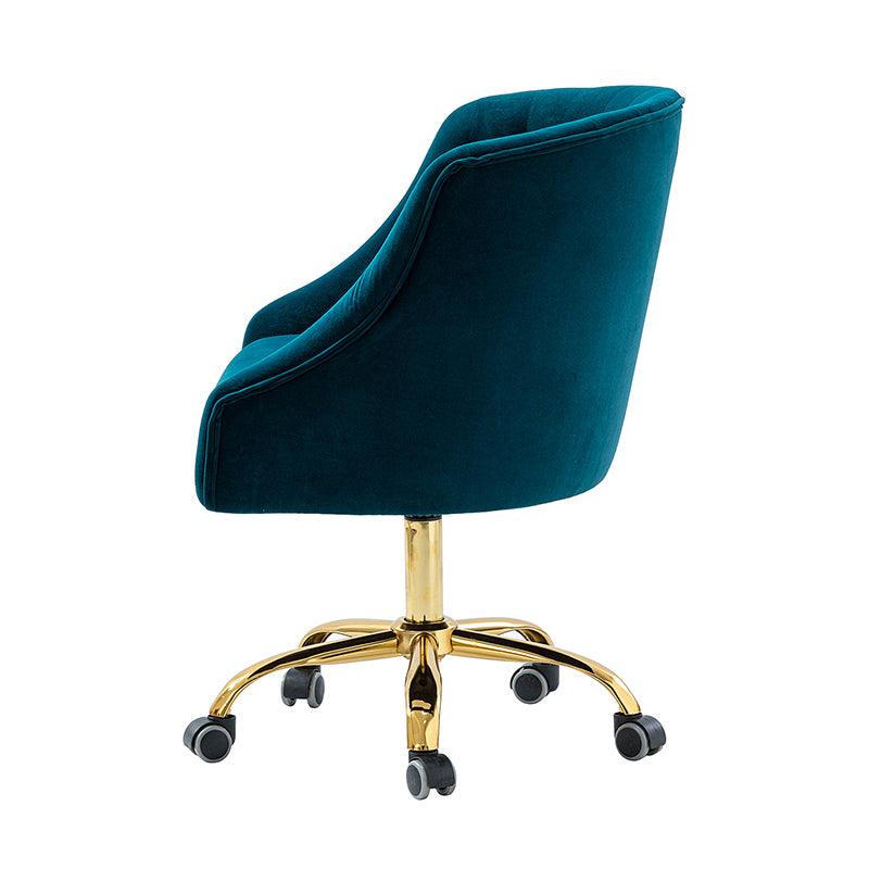 Start tab labels This isn't your standard office chair but you didn't want standard anyway, did you? It showcases a modified wingback design with a rounded back and sloped, recessed arms for an elegant look. Button-tufted details dot the back for a touch of texture. This office chair is upholstered in velvet fabric with a solid hue that adds a glam, modern touch to your home office. Down below, it features gold-finish metal legs and five casters that allow smooth movement across your carpet or floor.