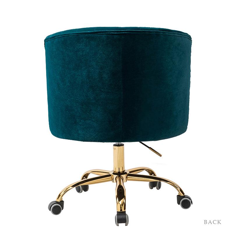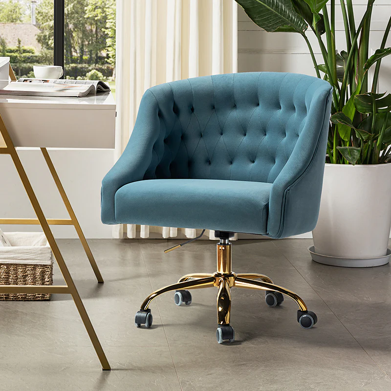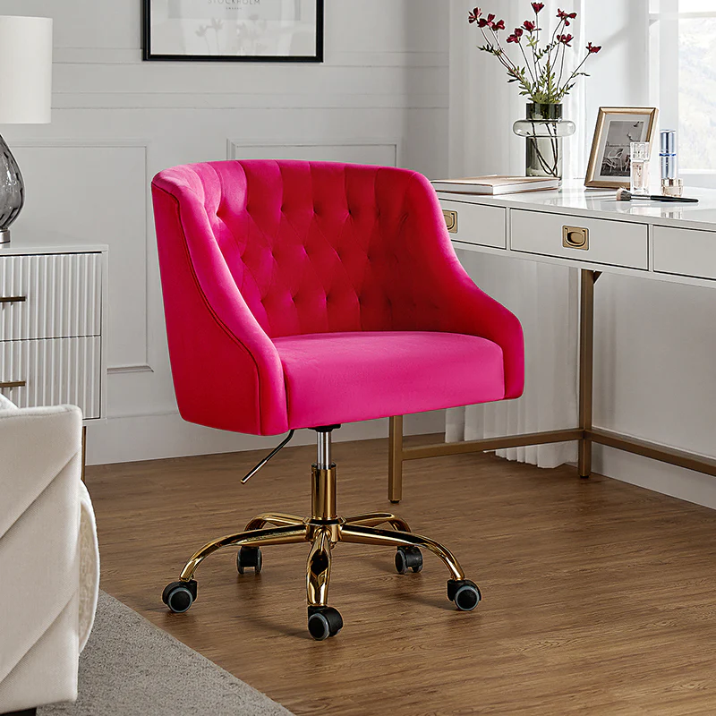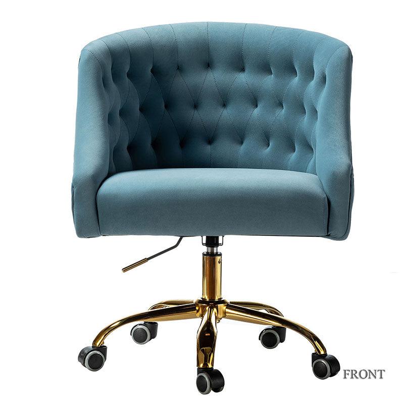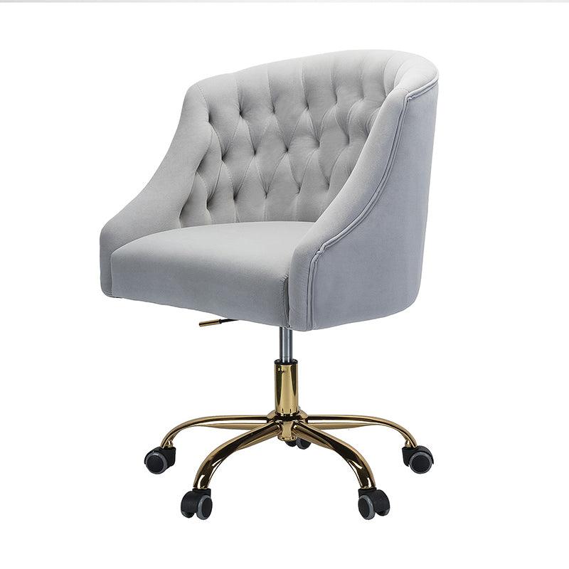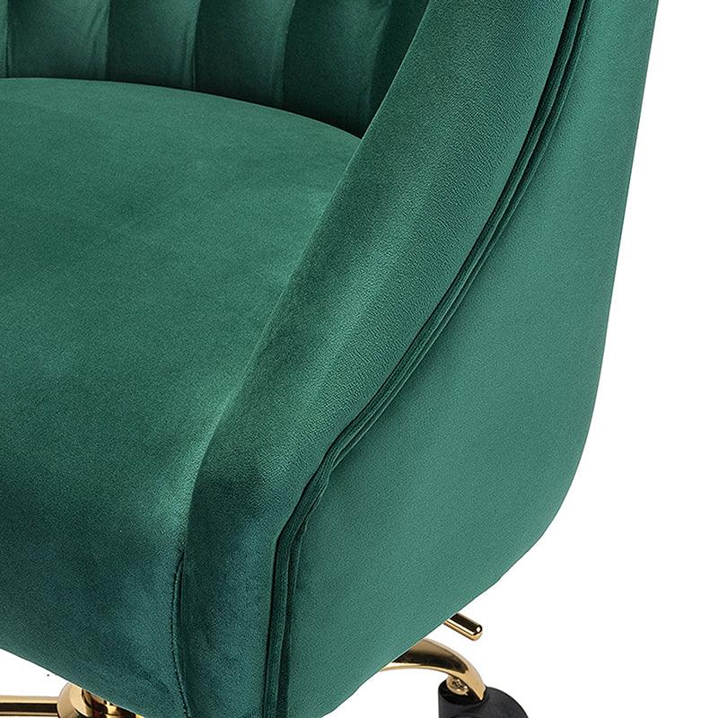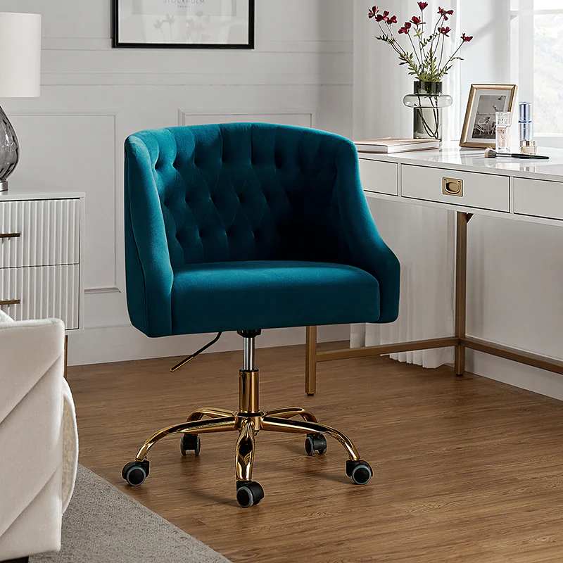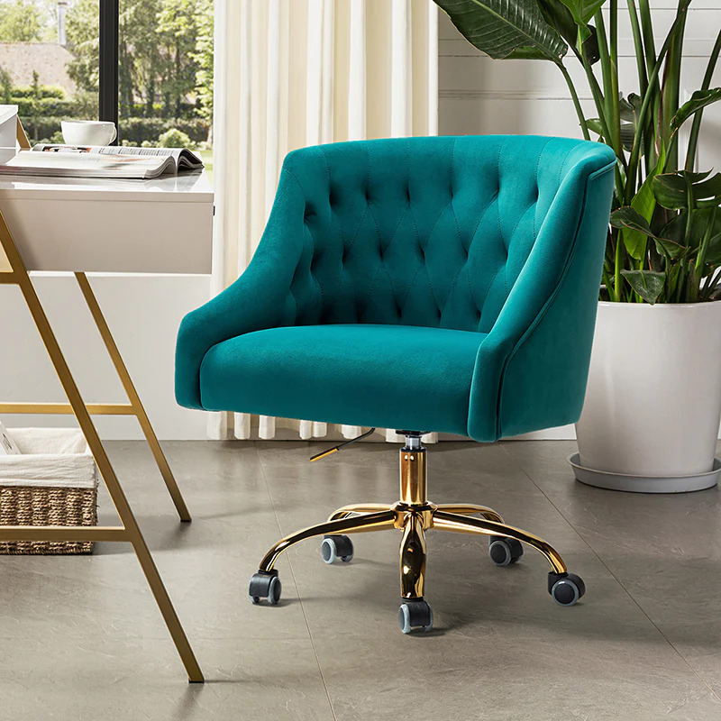 Start tab labels This isn't your standard office chair but you didn't want standard anyway, did you? It showcases a modified wingback design with a rounded back and sloped, recessed arms for an elegant look. Button-tufted details dot the back for a touch of texture. This office chair is upholstered in velvet fabric with a solid hue that adds a glam, modern touch to your home office. Down below, it features gold-finish metal legs and five casters that allow smooth movement across your carpet or floor.