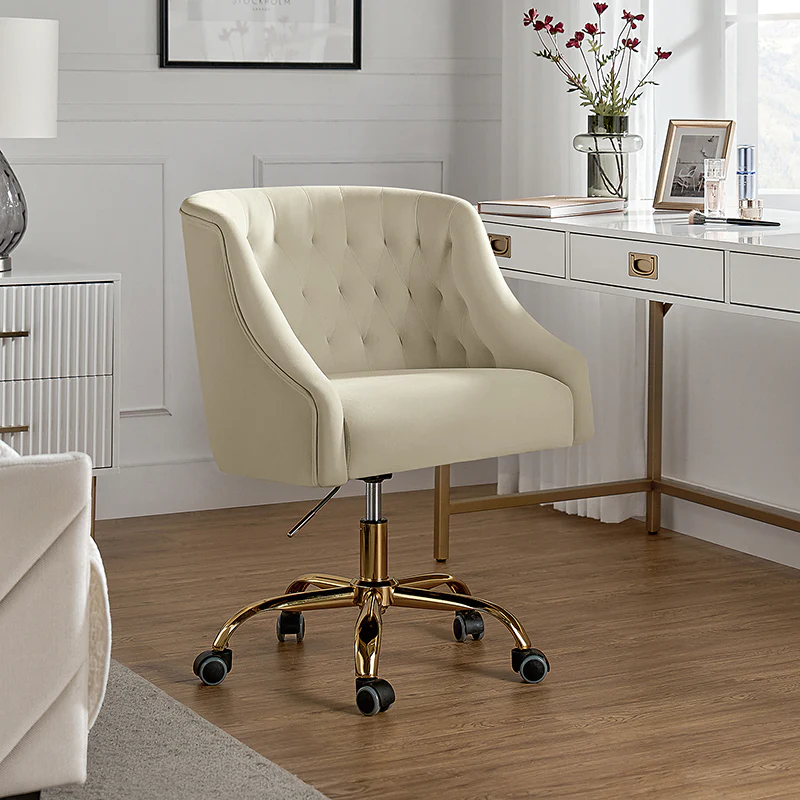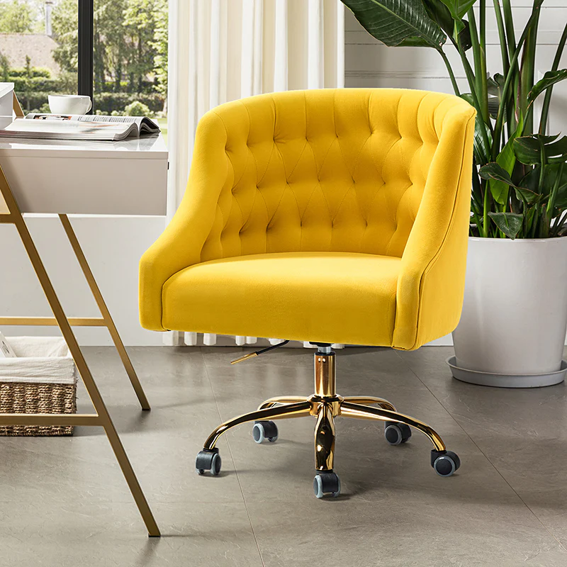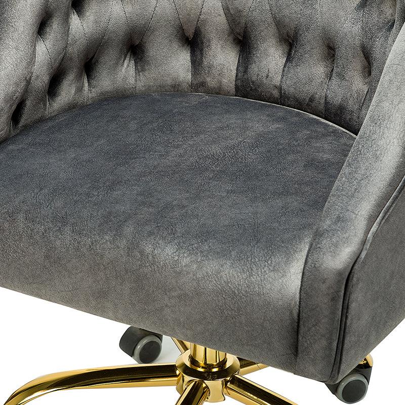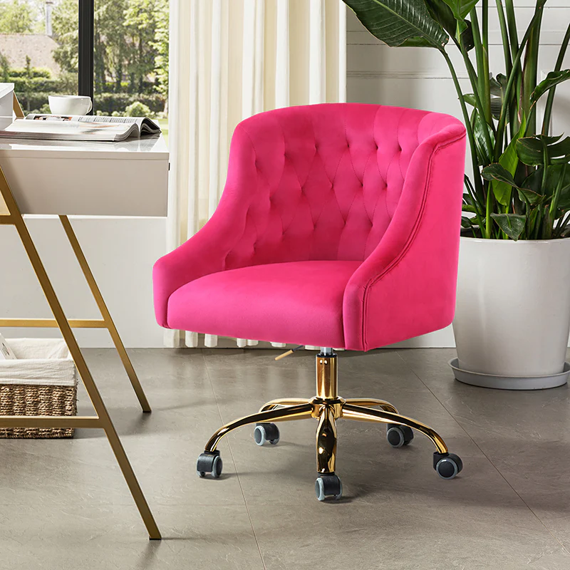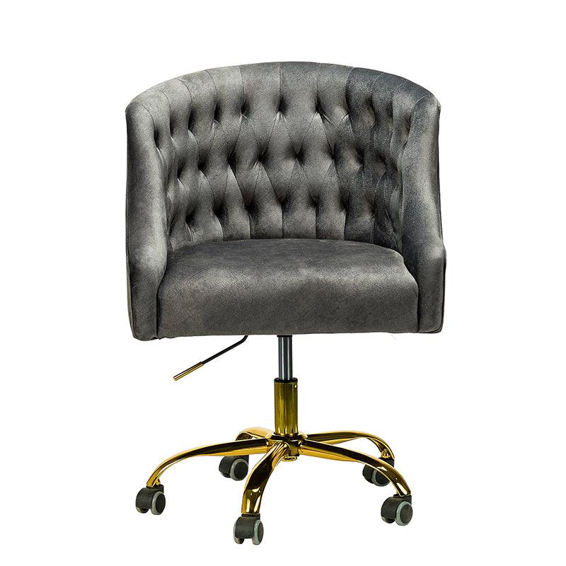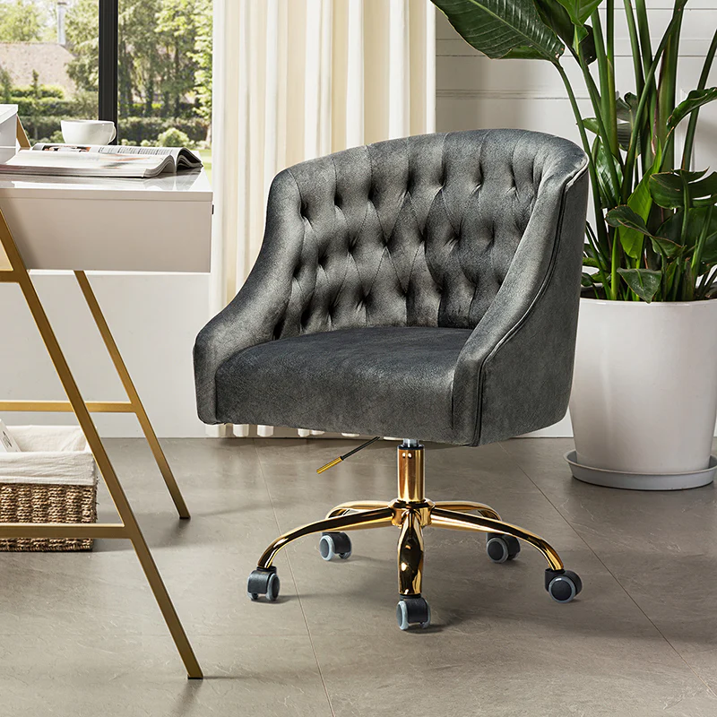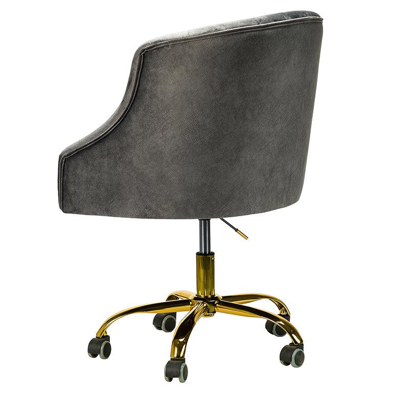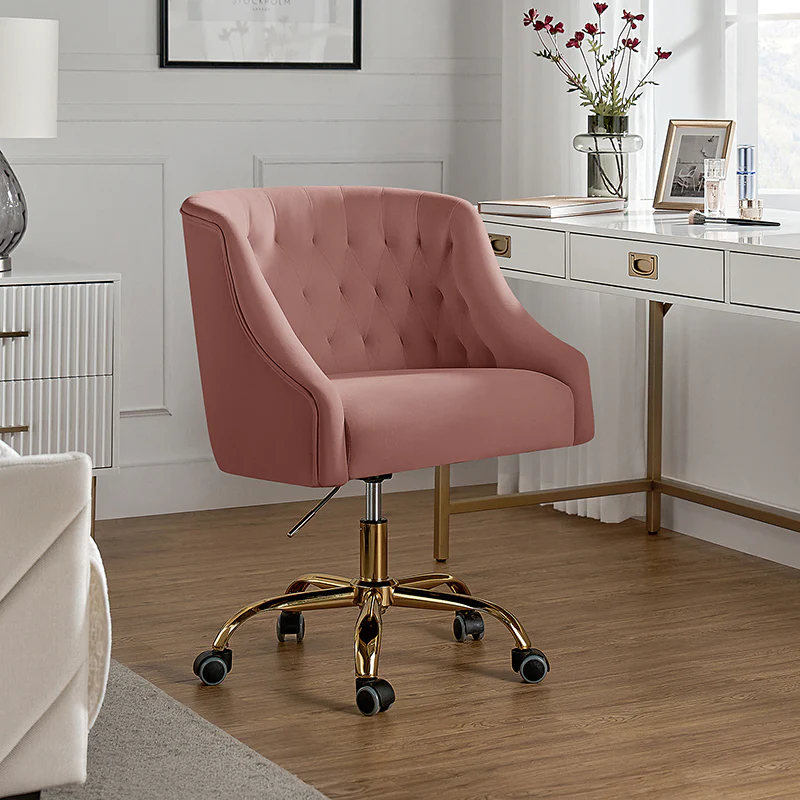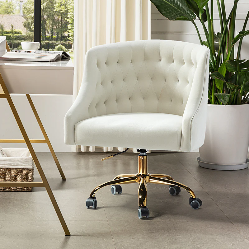 Start tab labels This isn't your standard office chair but you didn't want standard anyway, did you? It showcases a modified wingback design with a rounded back and sloped, recessed arms for an elegant look. Button-tufted details dot the back for a touch of texture. This office chair is upholstered in velvet fabric with a solid hue that adds a glam, modern touch to your home office. Down below, it features gold-finish metal legs and five casters that allow smooth movement across your carpet or floor.