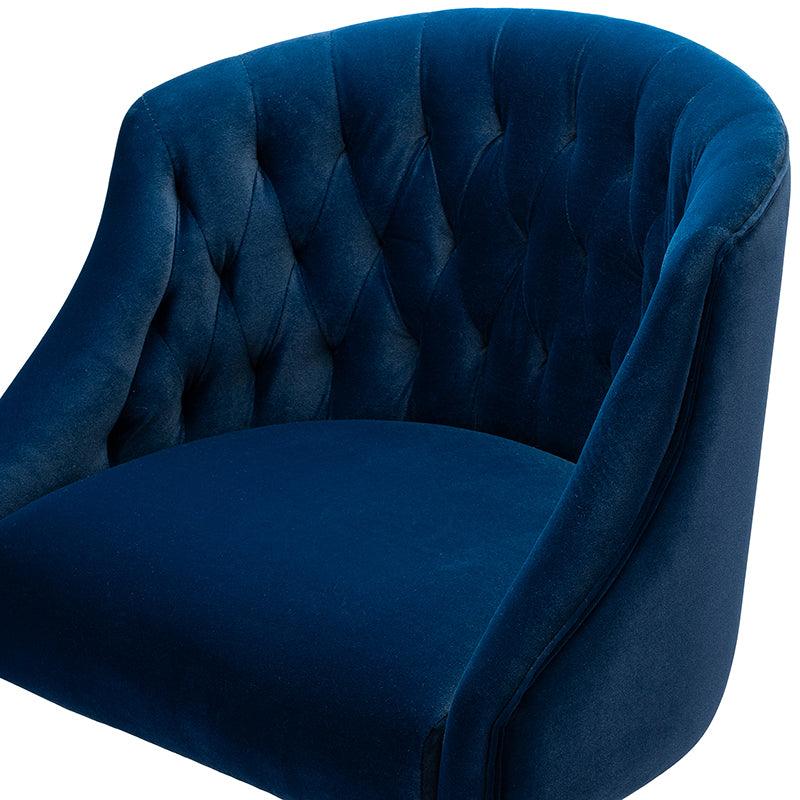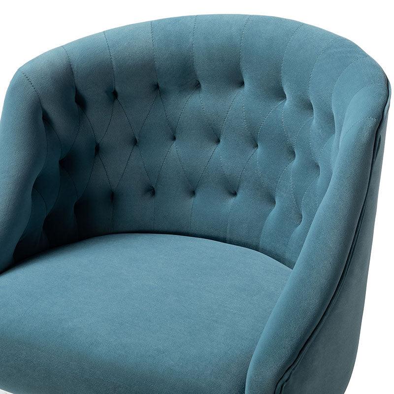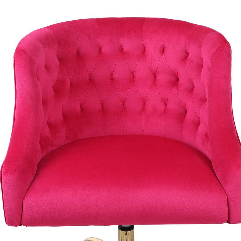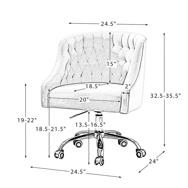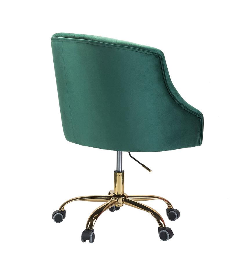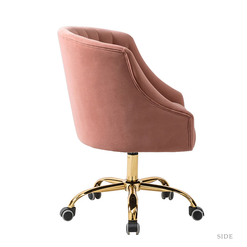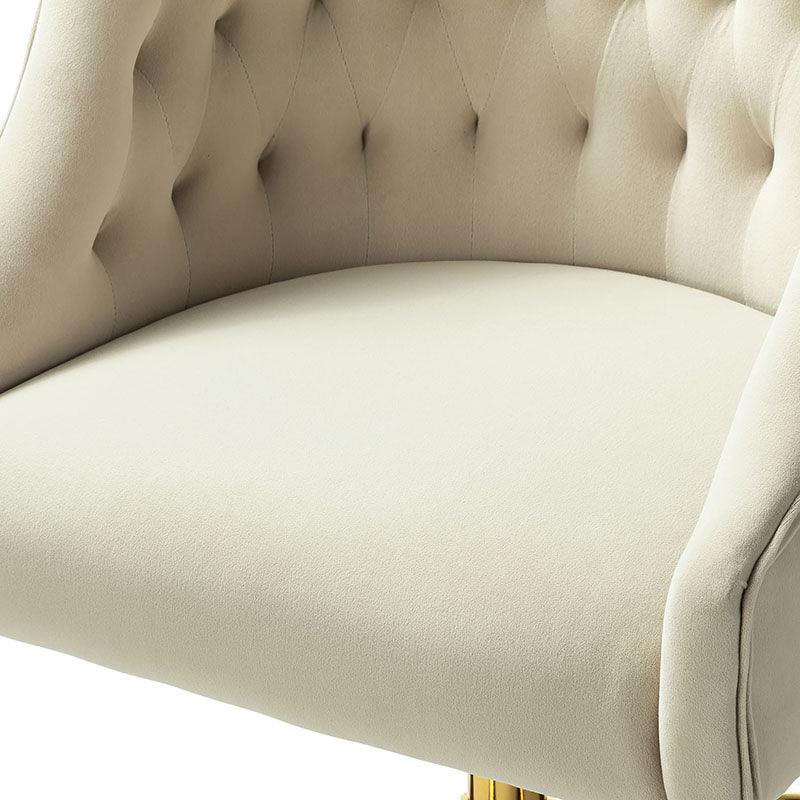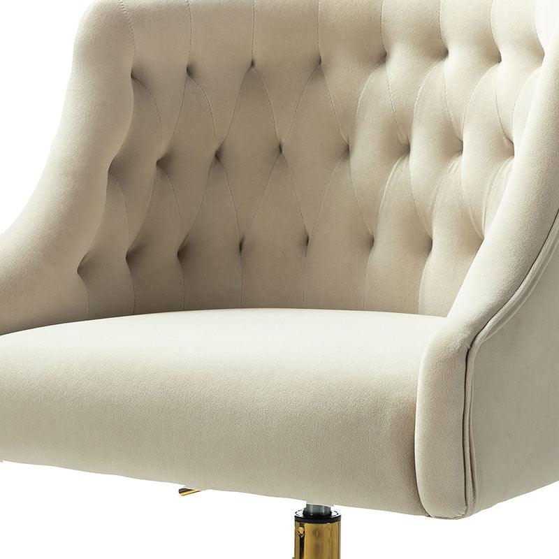 Start tab labels This isn't your standard office chair but you didn't want standard anyway, did you? It showcases a modified wingback design with a rounded back and sloped, recessed arms for an elegant look. Button-tufted details dot the back for a touch of texture. This office chair is upholstered in velvet fabric with a solid hue that adds a glam, modern touch to your home office. Down below, it features gold-finish metal legs and five casters that allow smooth movement across your carpet or floor.