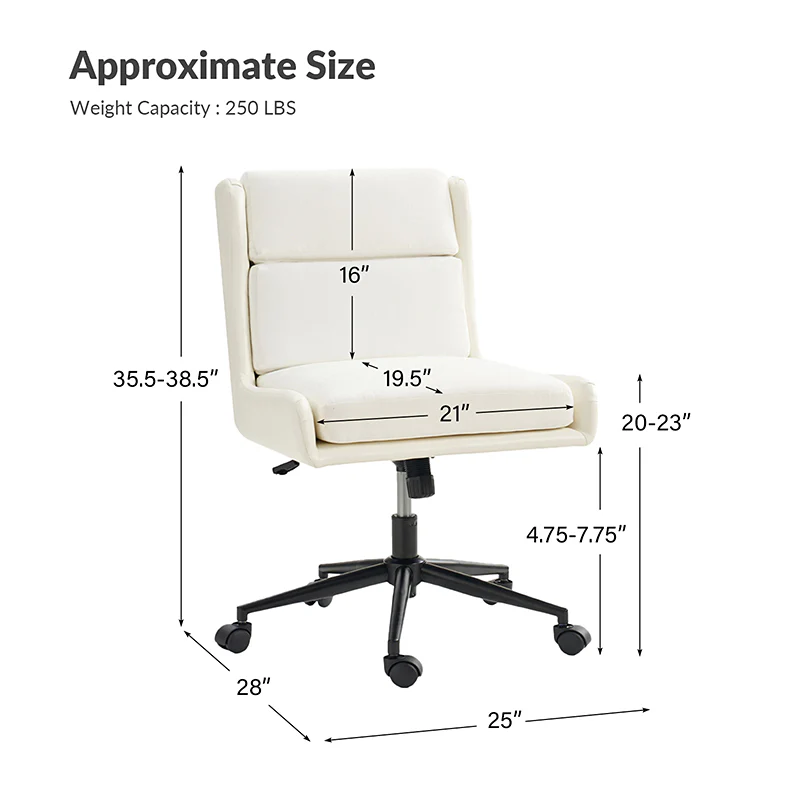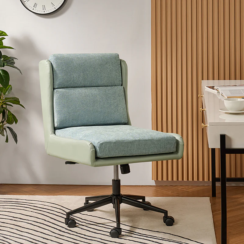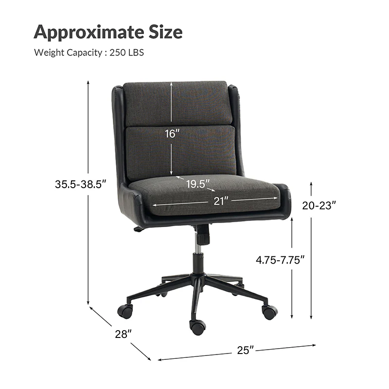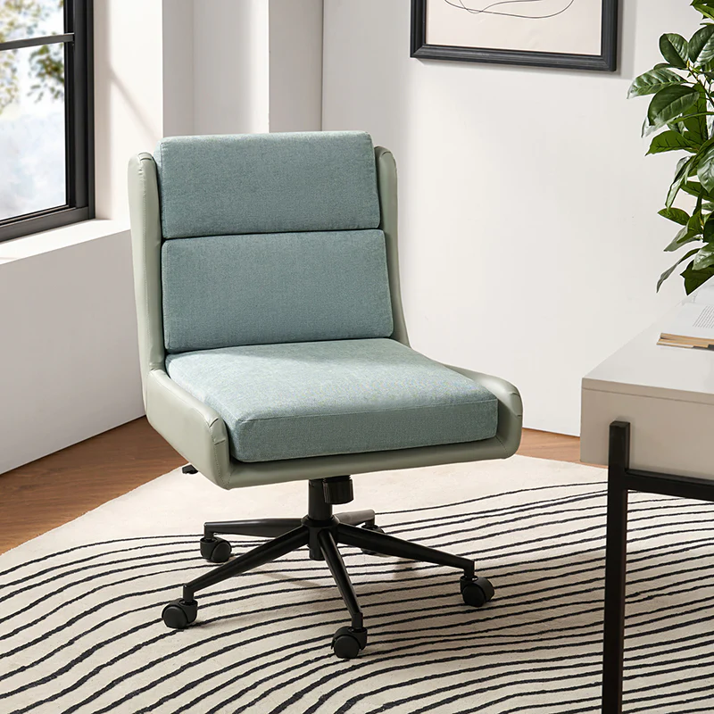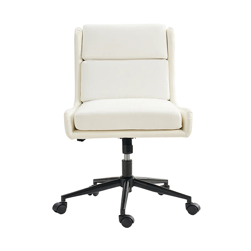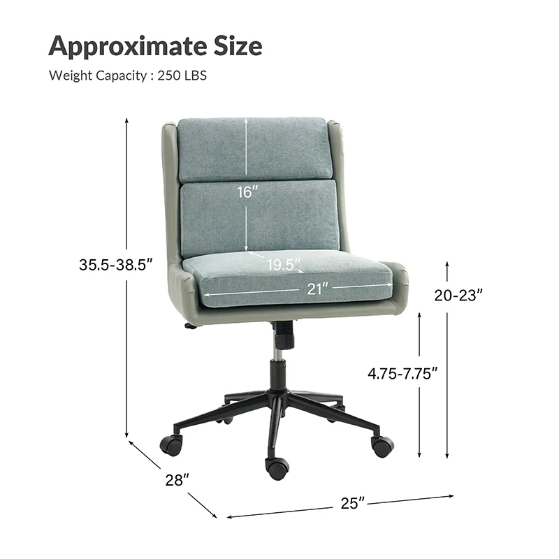 This modern home office chair blends sleek design with ergonomic functionality. Its SGS International Certified Stainless Steel Gas Spring guarantees durability and safety. The chair in camel color is made of vegan leather, and the chair in other colors is made of linen and vegan leather. Supported by sturdy metal legs and equipped with smooth casters, it offers mobility and stability. The swivel seat enhances flexibility, while the up-and-down adjustment feature caters to individual preferences. Additionally, its tilting capability allows for relaxed movement during long hours of work. With a removable line cushion upholstery, this chair effortlessly merges style with practicality, making it an ideal choice for any modern home office or workspace.