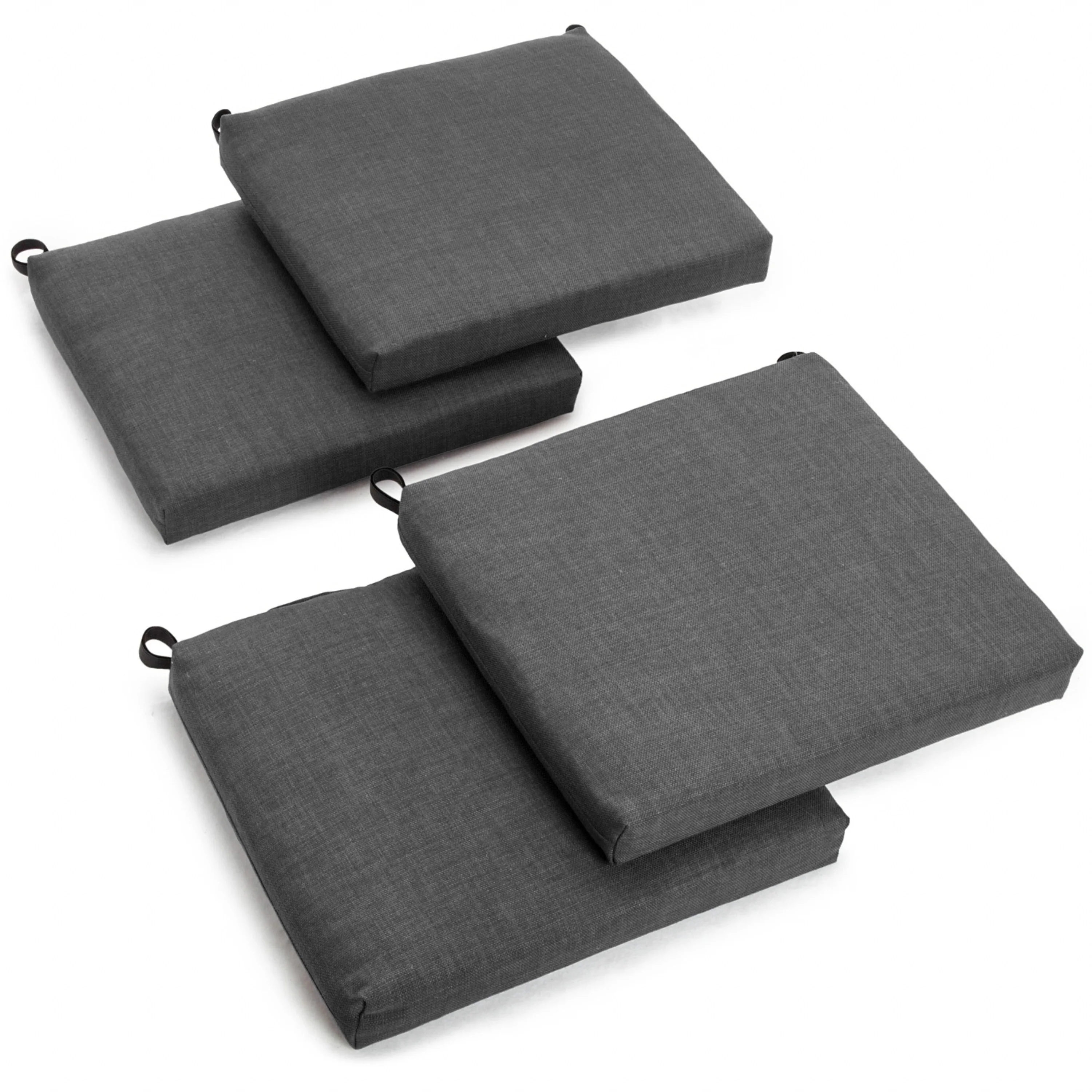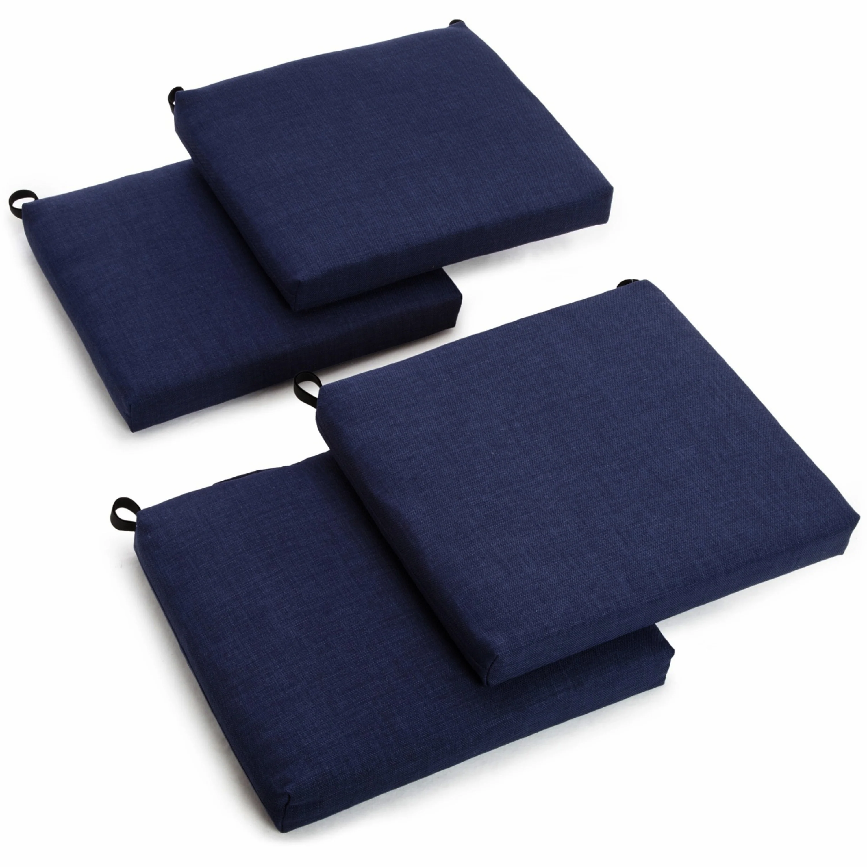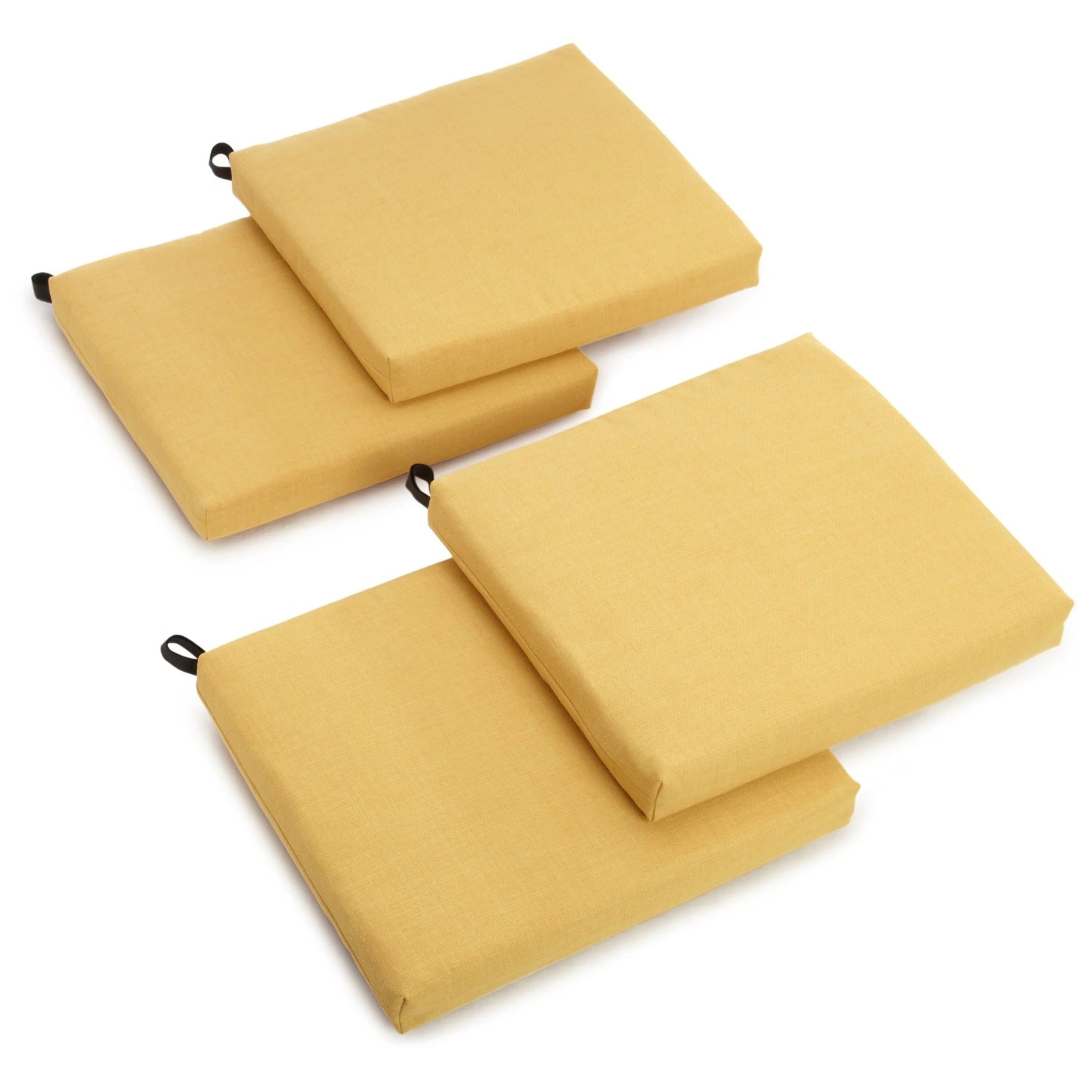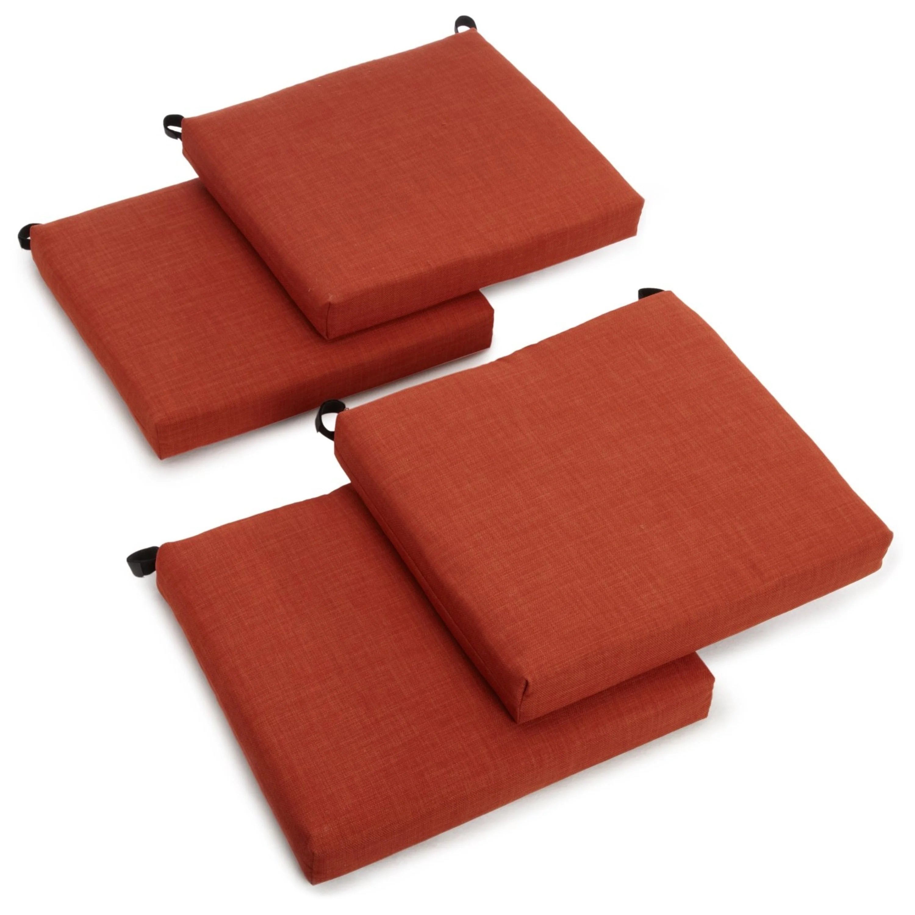 Bring comfort and style to your outdoor seating with the Blazing Needles 20-inch Outdoor Chair Cushions Set. Crafted from durable spun polyester fabric, these cushions are UV-, fade-, and weather-resistant for long-lasting use. The classic design features a bonded polyester pad for extra cushioning while the hook and loop ties allow for easy attachment to your chairs. Suitable for both indoor and outdoor use, this set of four cushions is available in various solid colors to match your decor. Measuring 20 inches by 19 inches by 3 inches each, these cushions are easy to clean and maintain, making them a great addition to your outdoor relaxation space.