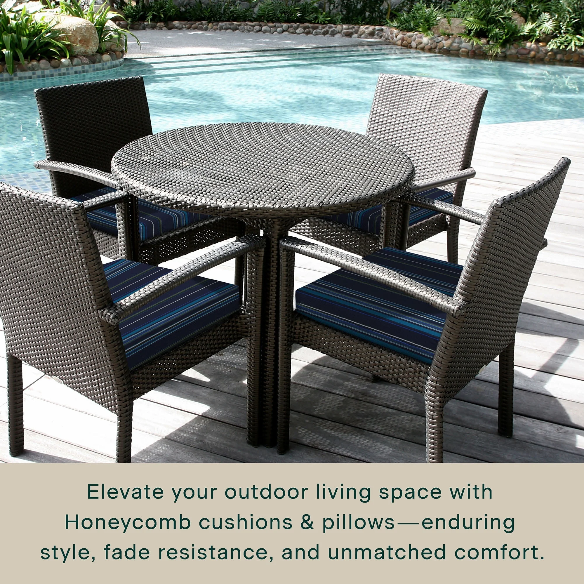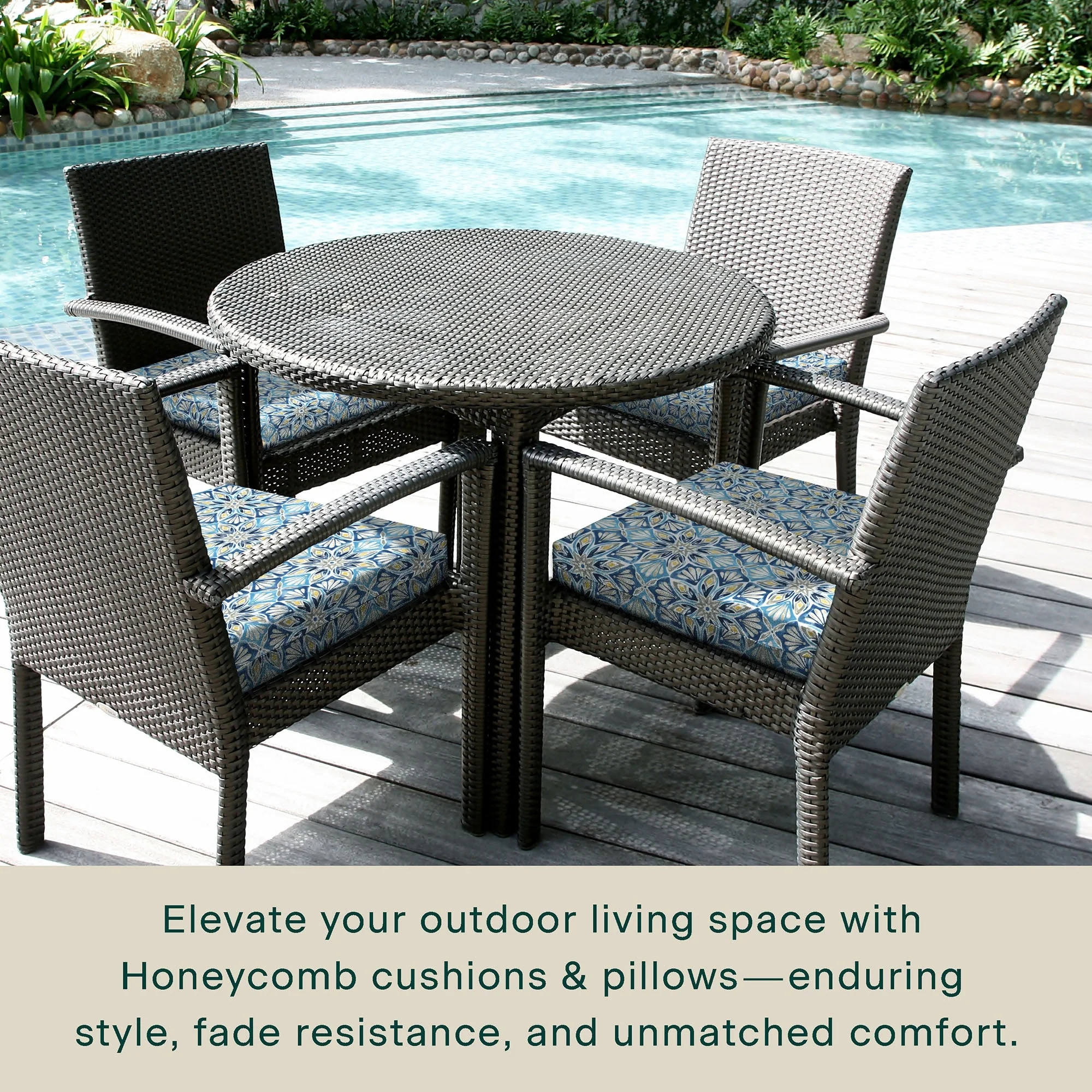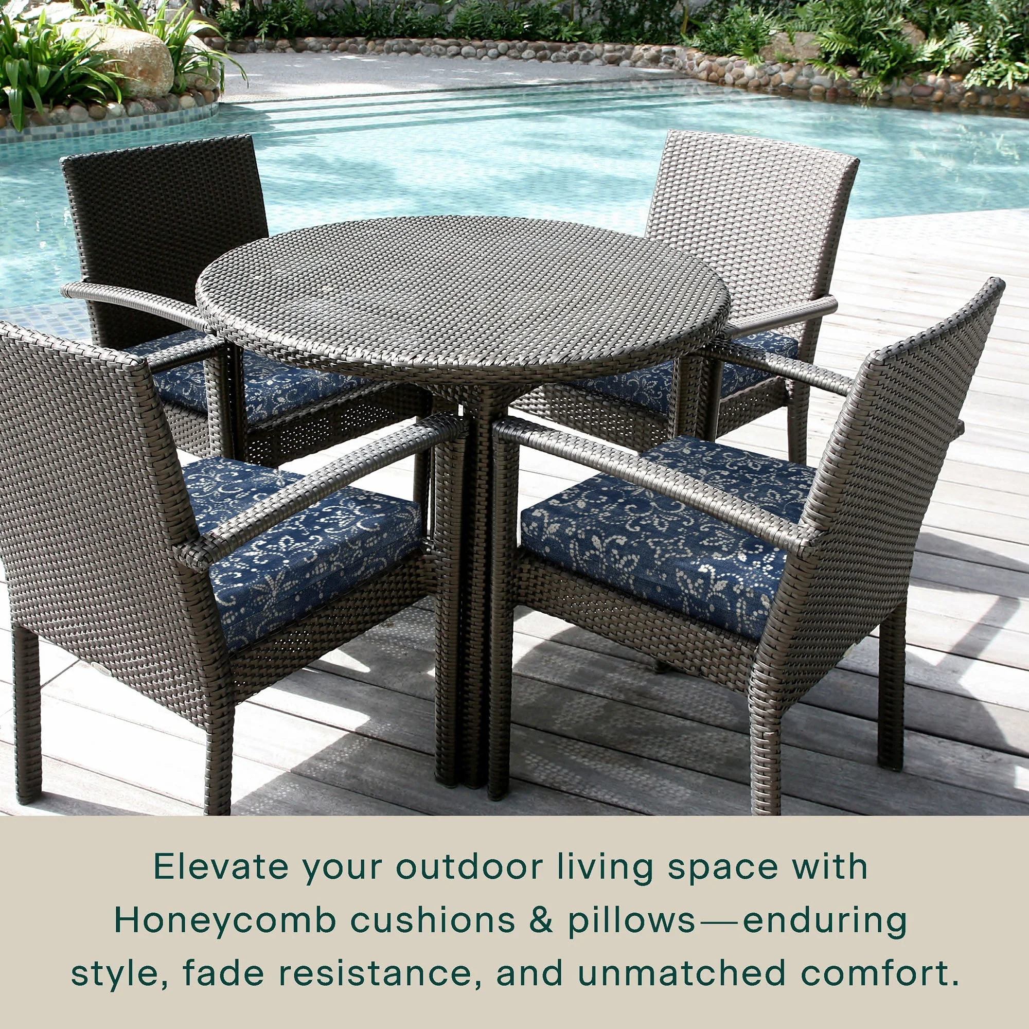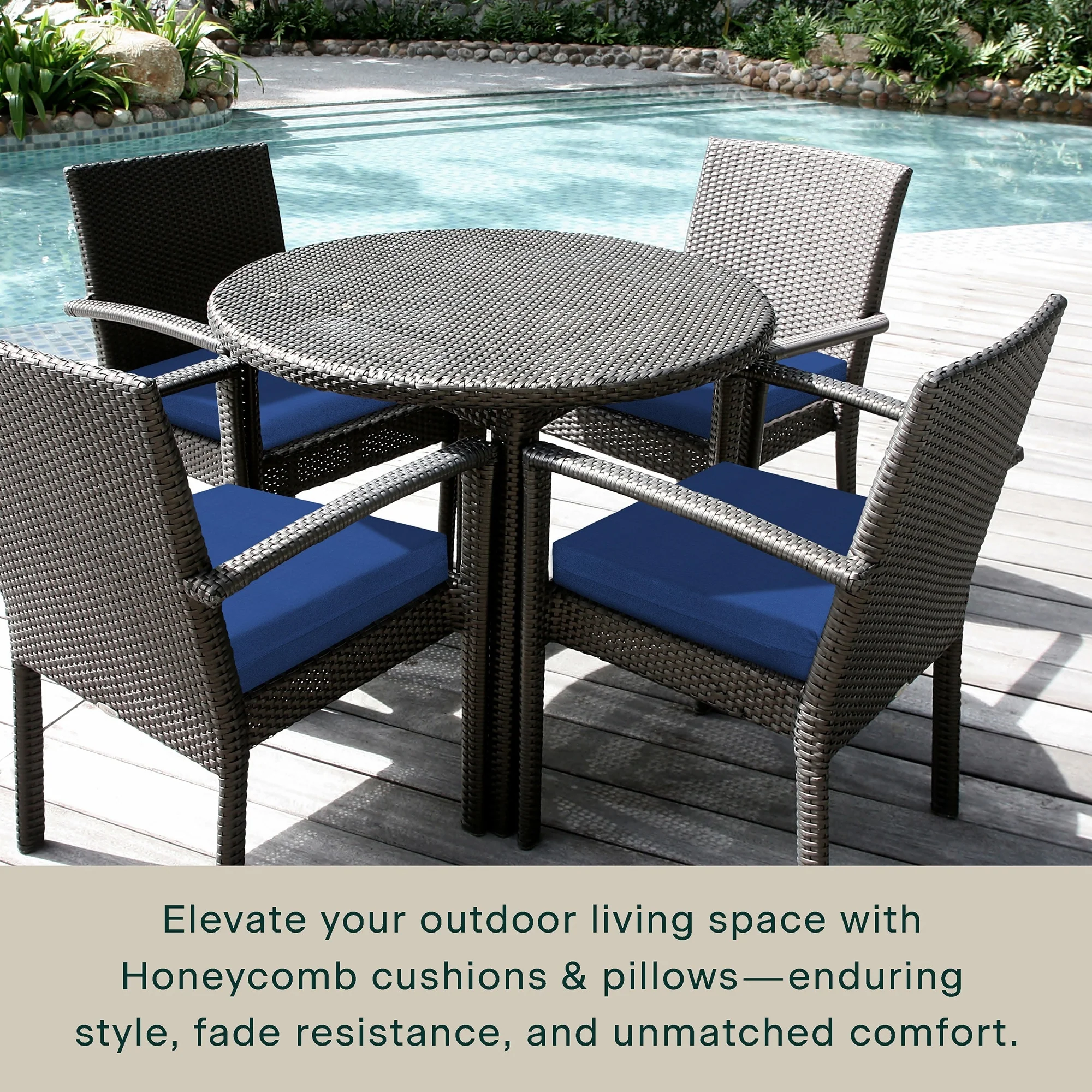 - Superior Look + Feel - Revive your outdoor furniture in comfort and style with our premium dining seat cushion from Honeycomb. With durable outdoor fabric and 4-inch-thick polyester fiber filling you are guaranteed long-lasting softness and support.