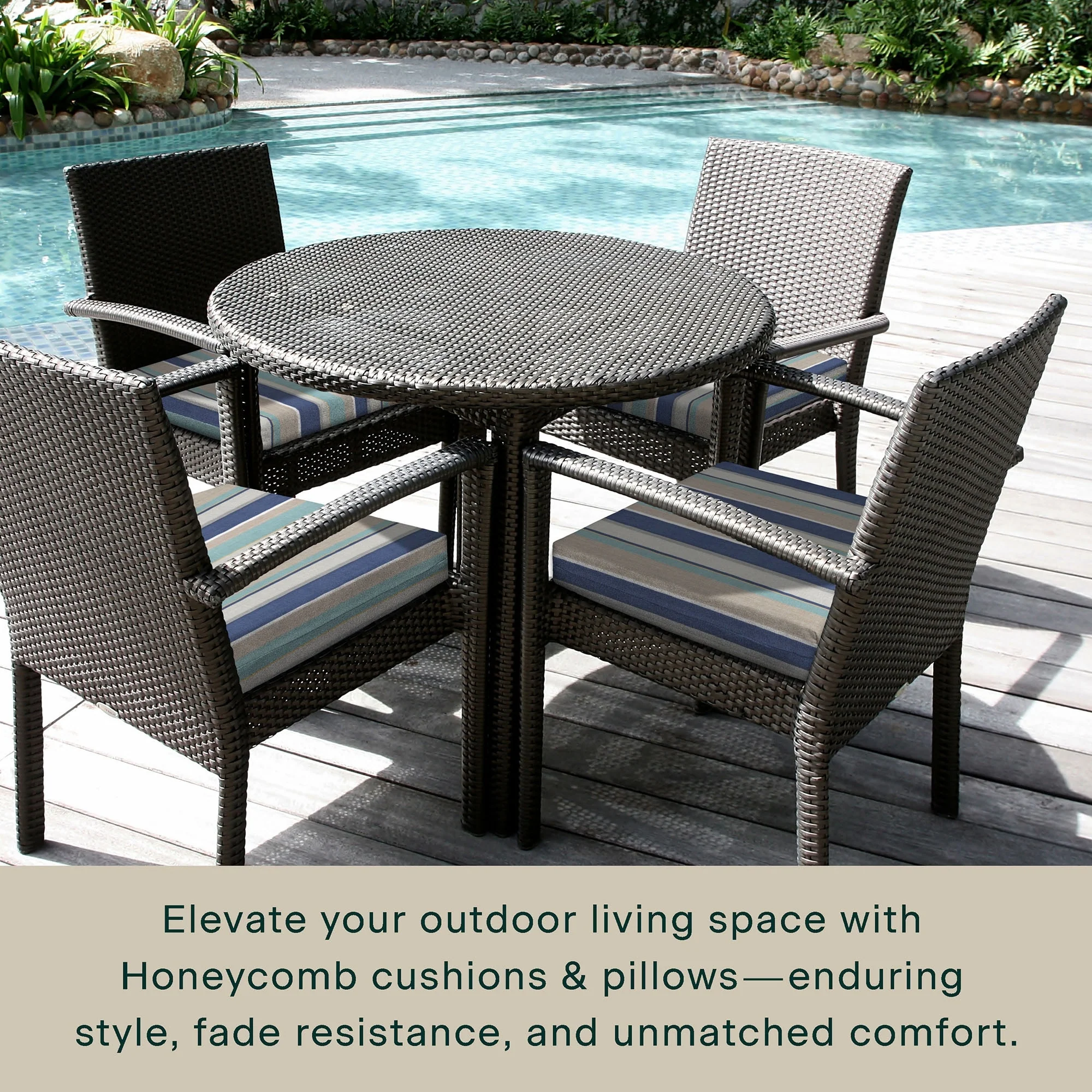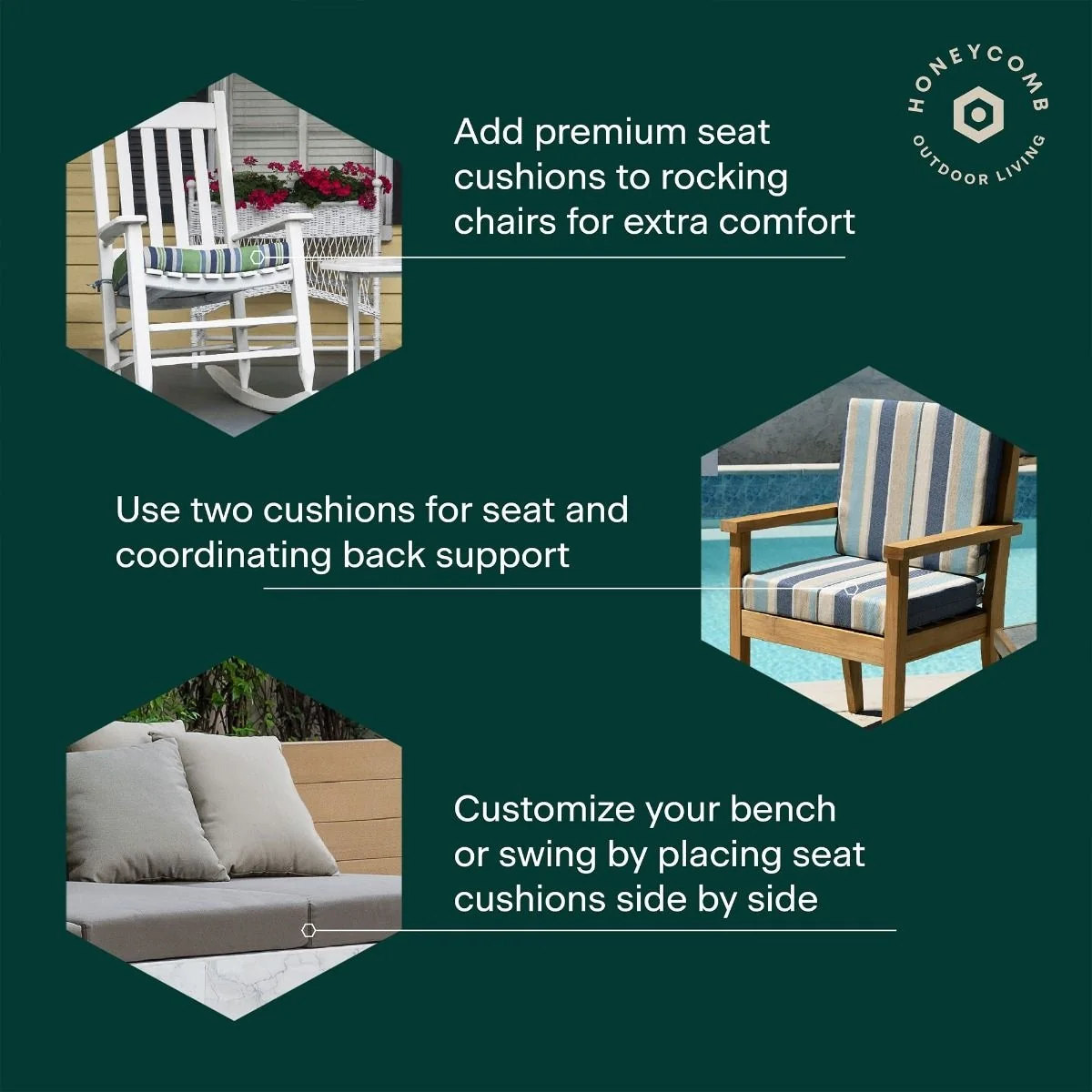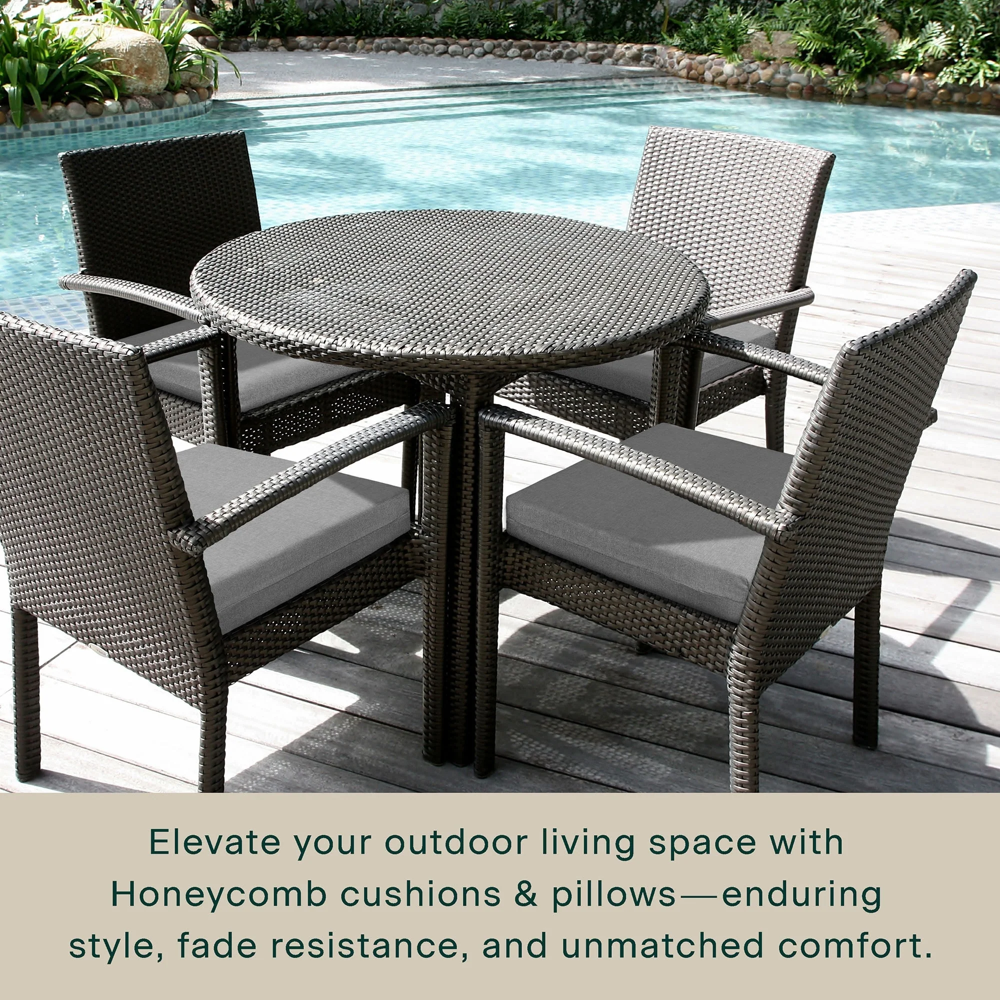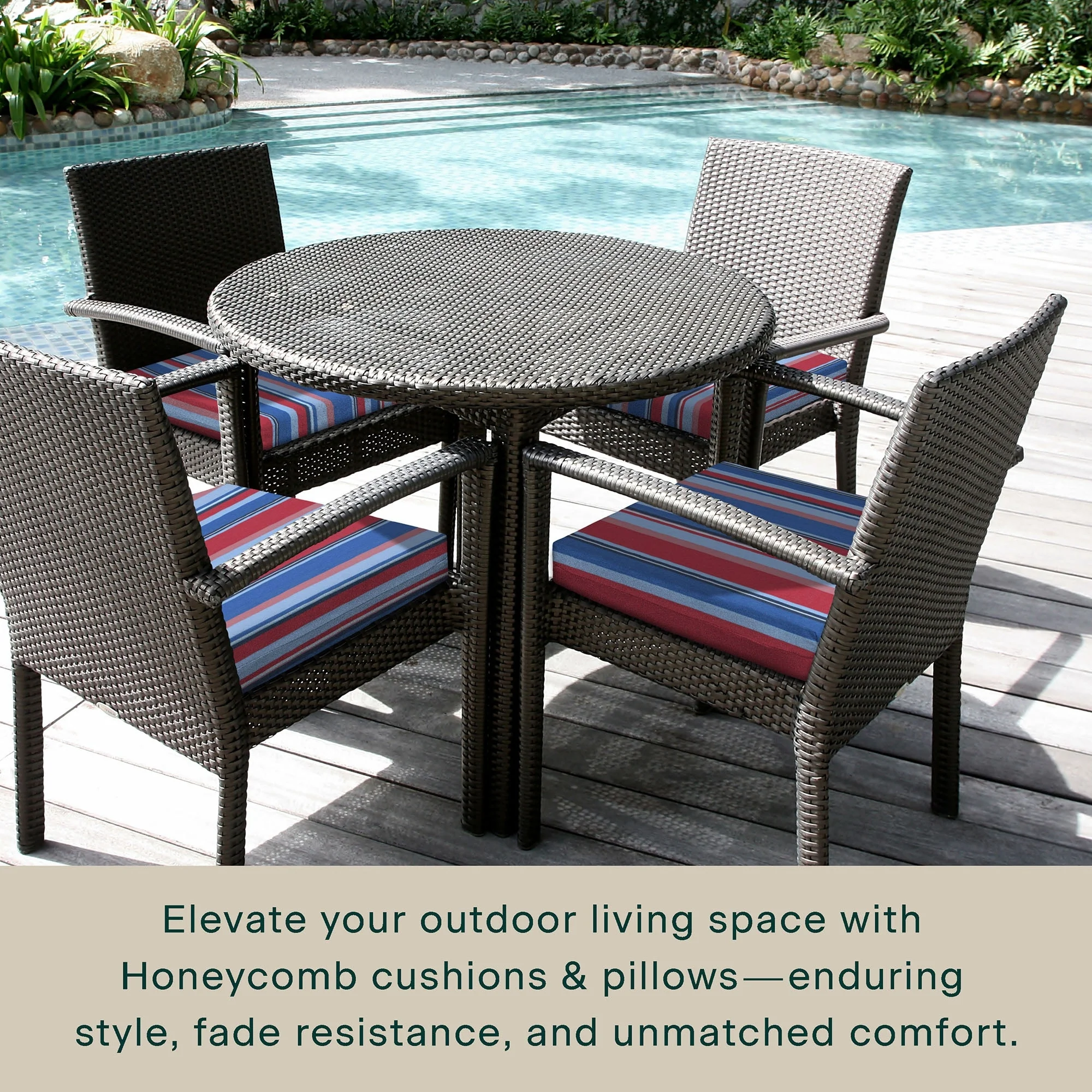 - Superior Look + Feel - Revive your outdoor furniture in comfort and style with our premium dining seat cushion from Honeycomb. With durable outdoor fabric and 4-inch-thick polyester fiber filling you are guaranteed long-lasting softness and support.