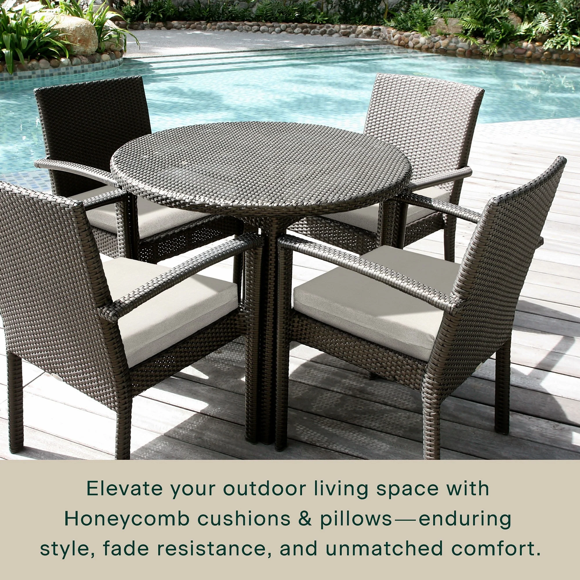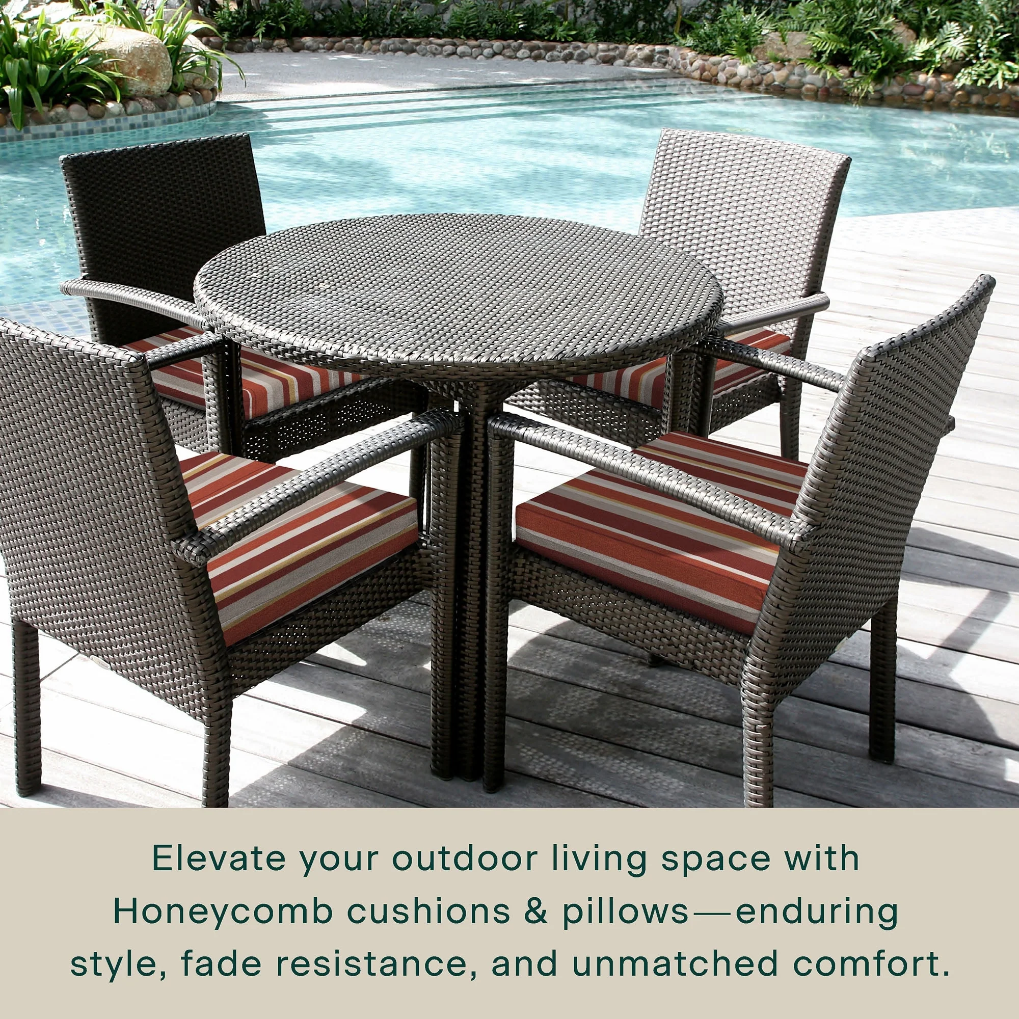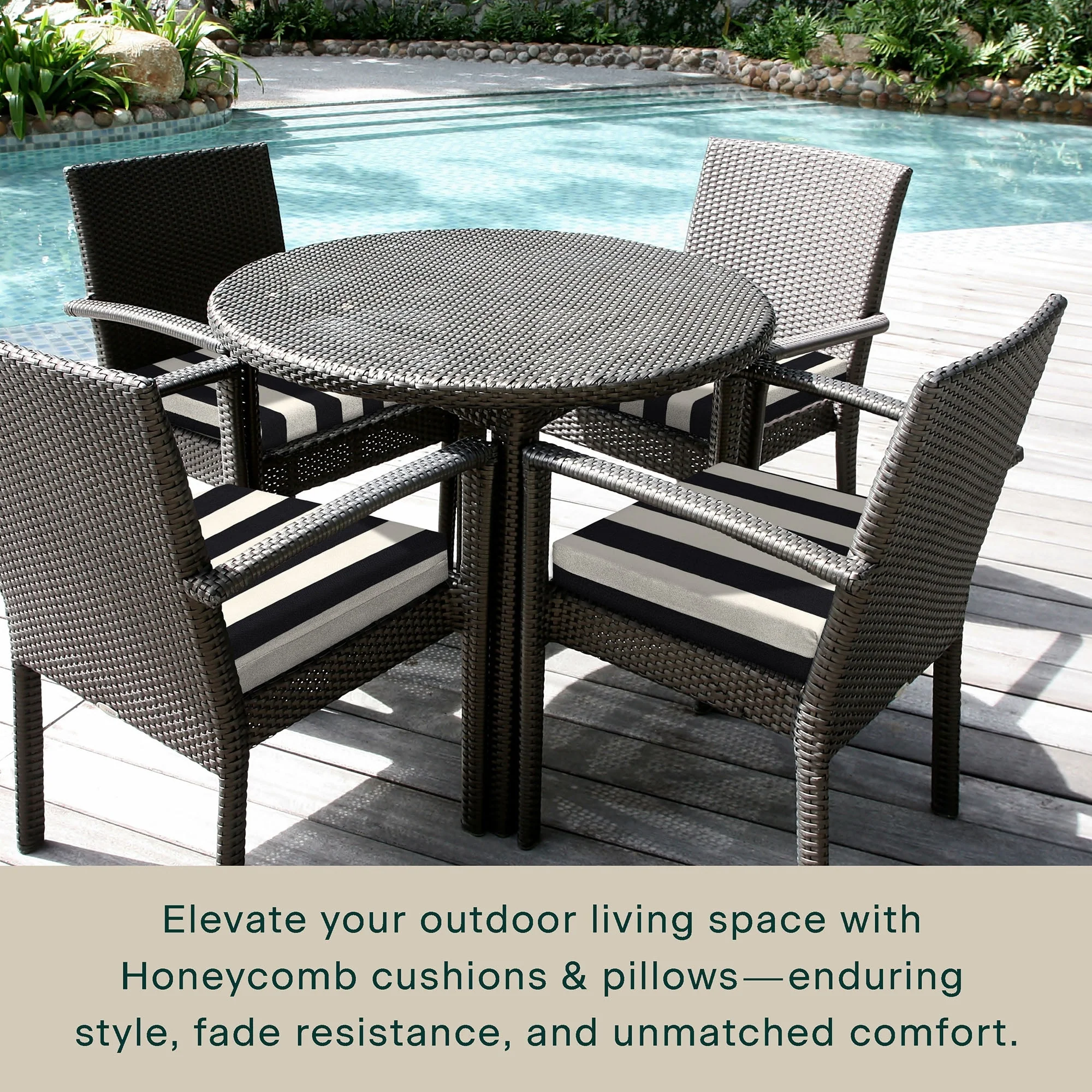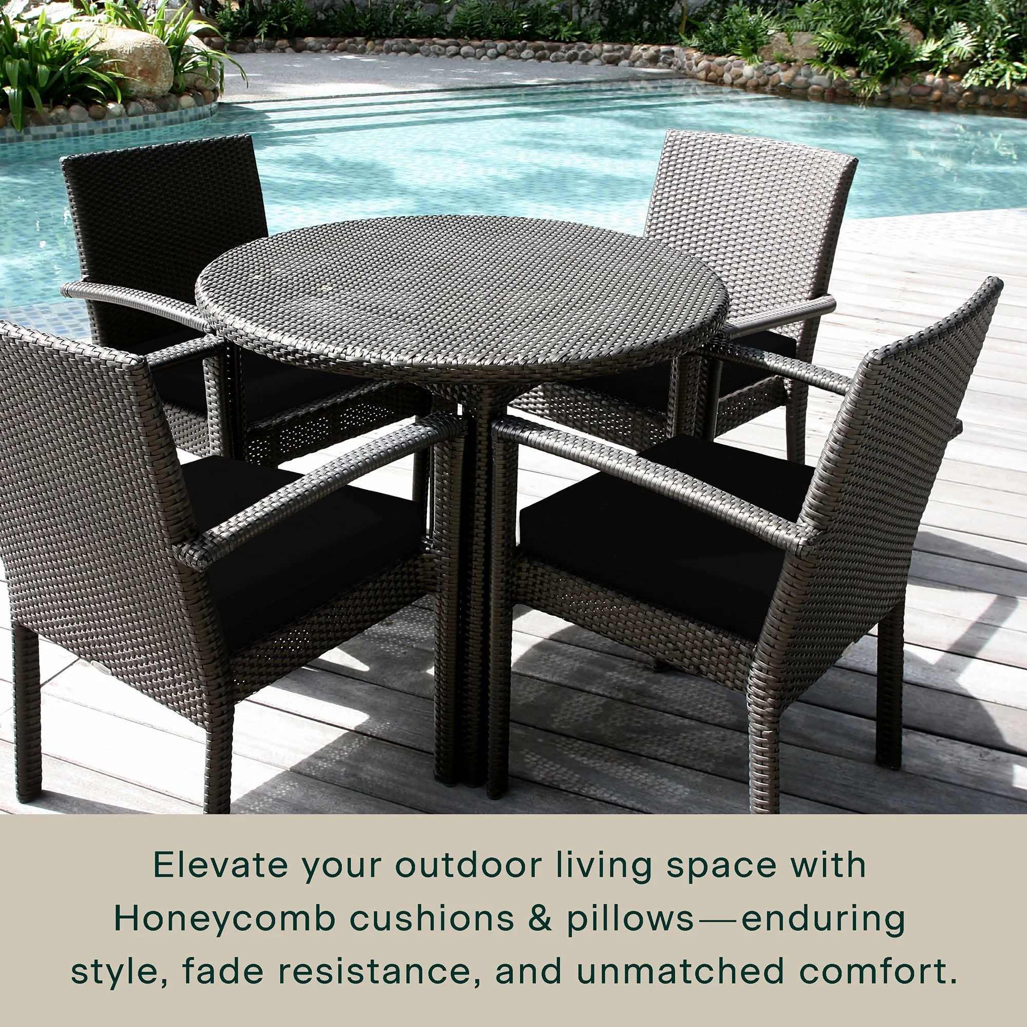 - Superior Look + Feel - Revive your outdoor furniture in comfort and style with our premium dining seat cushion from Honeycomb. With durable outdoor fabric and 4-inch-thick polyester fiber filling you are guaranteed long-lasting softness and support.