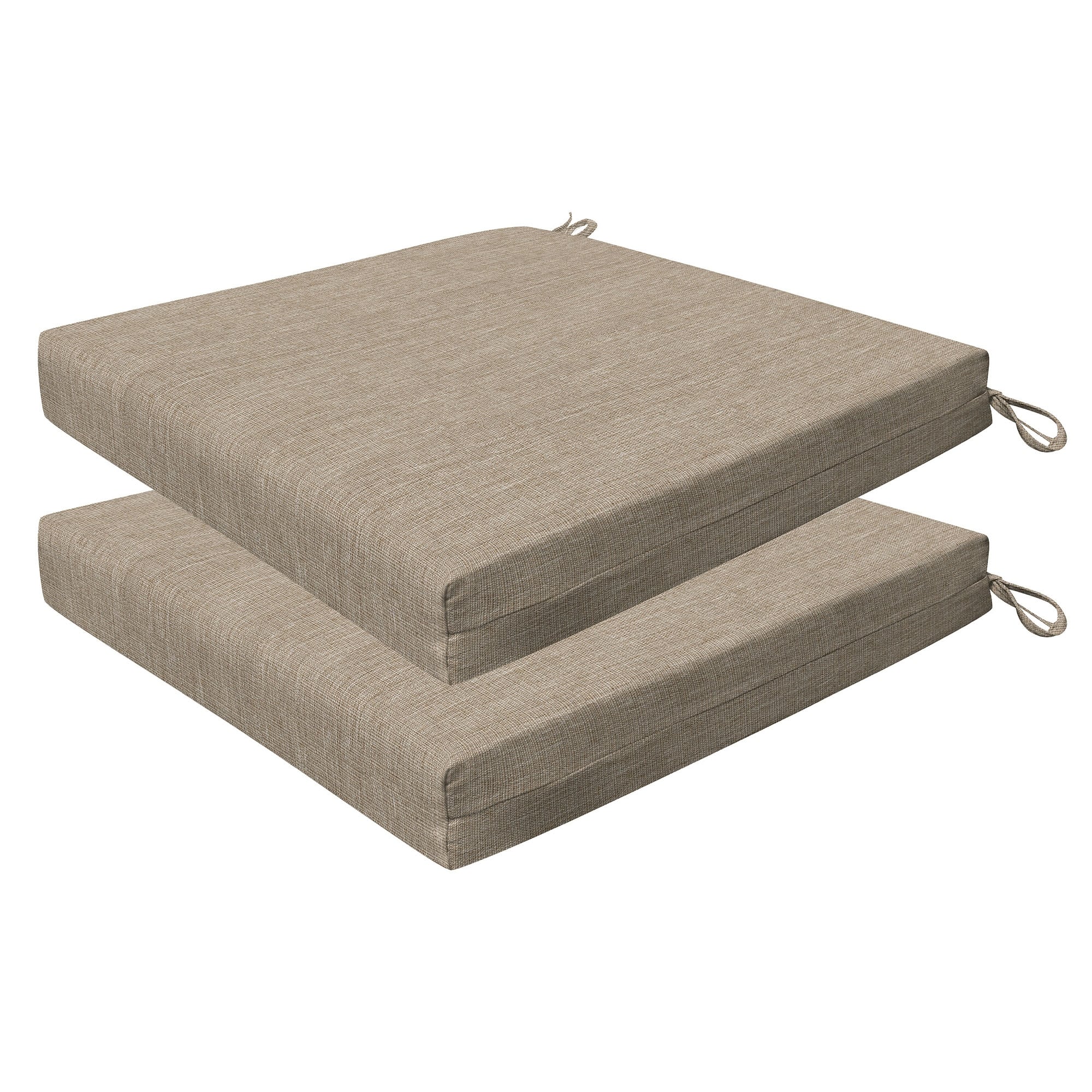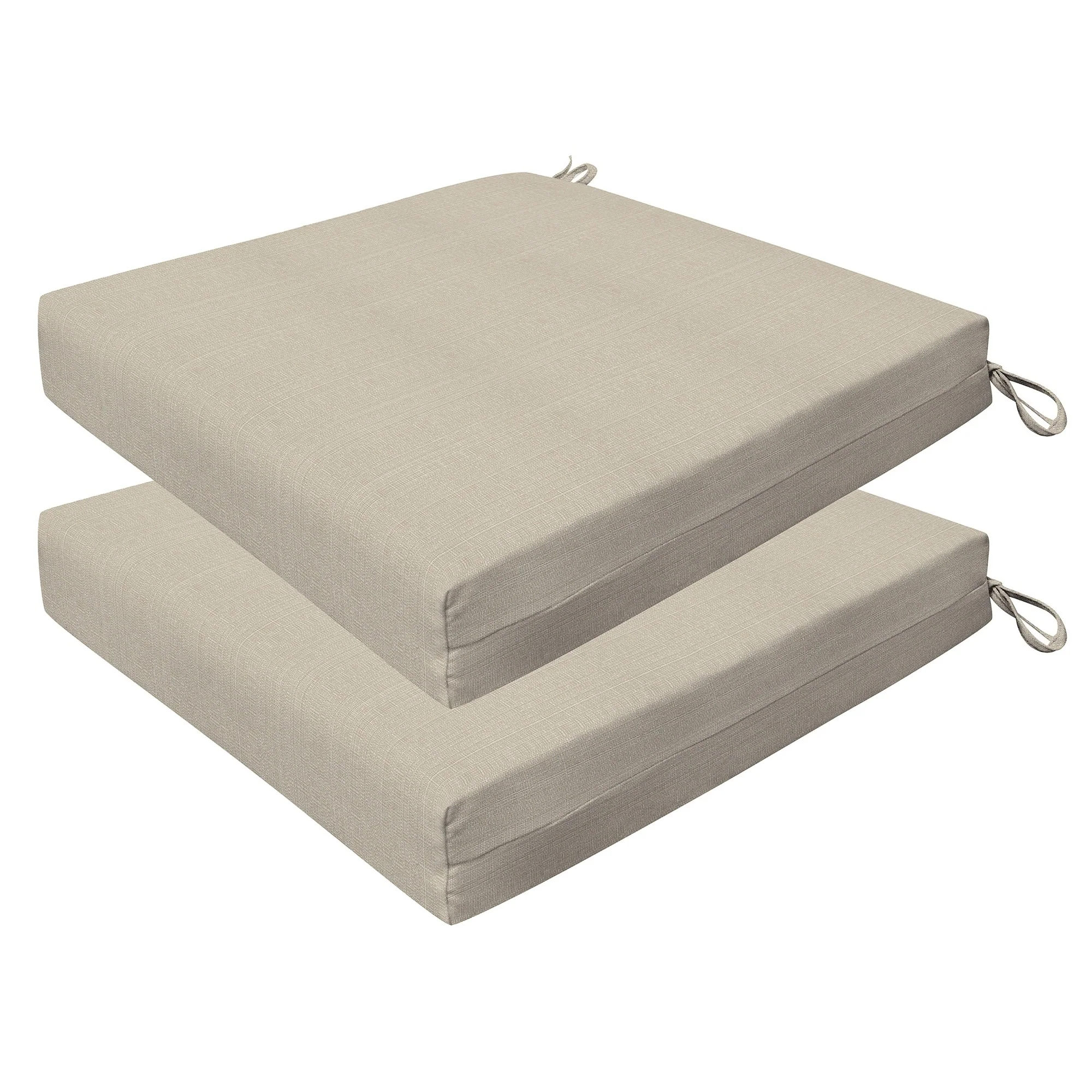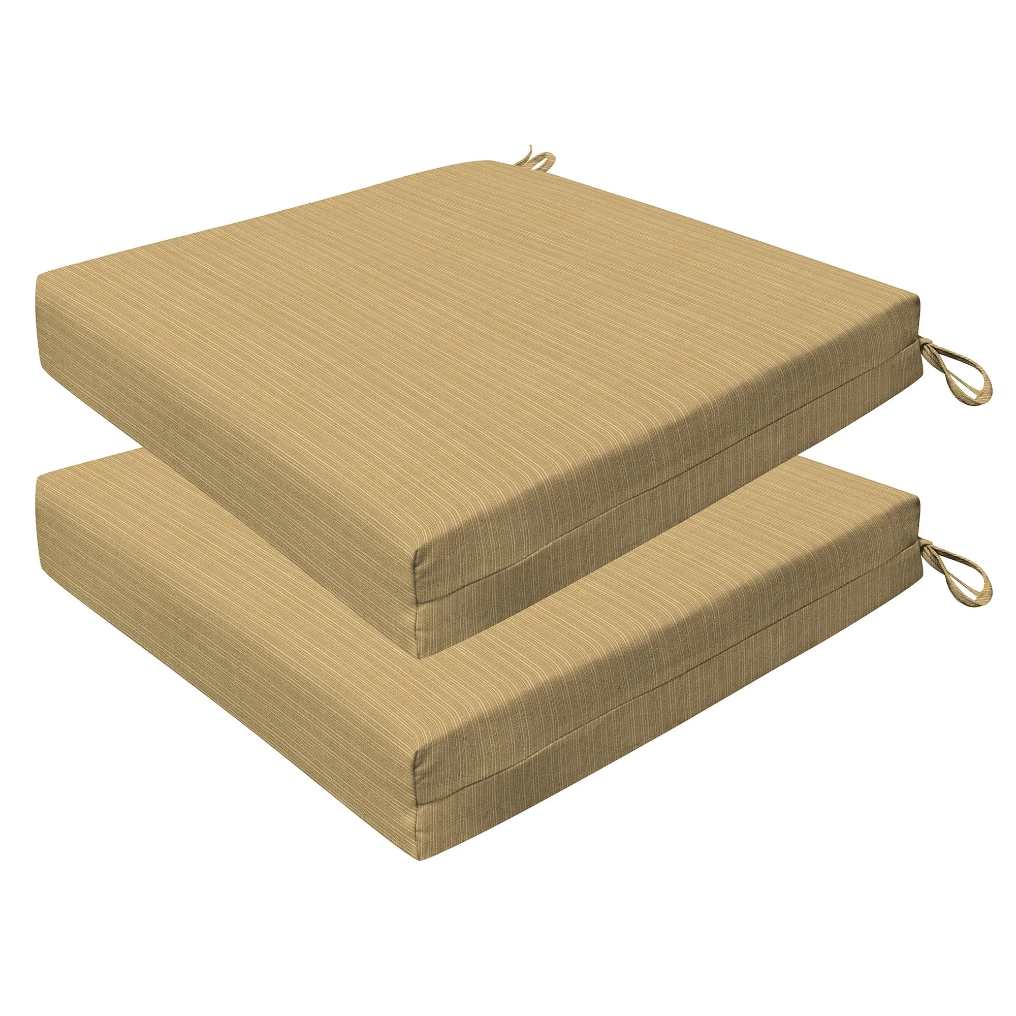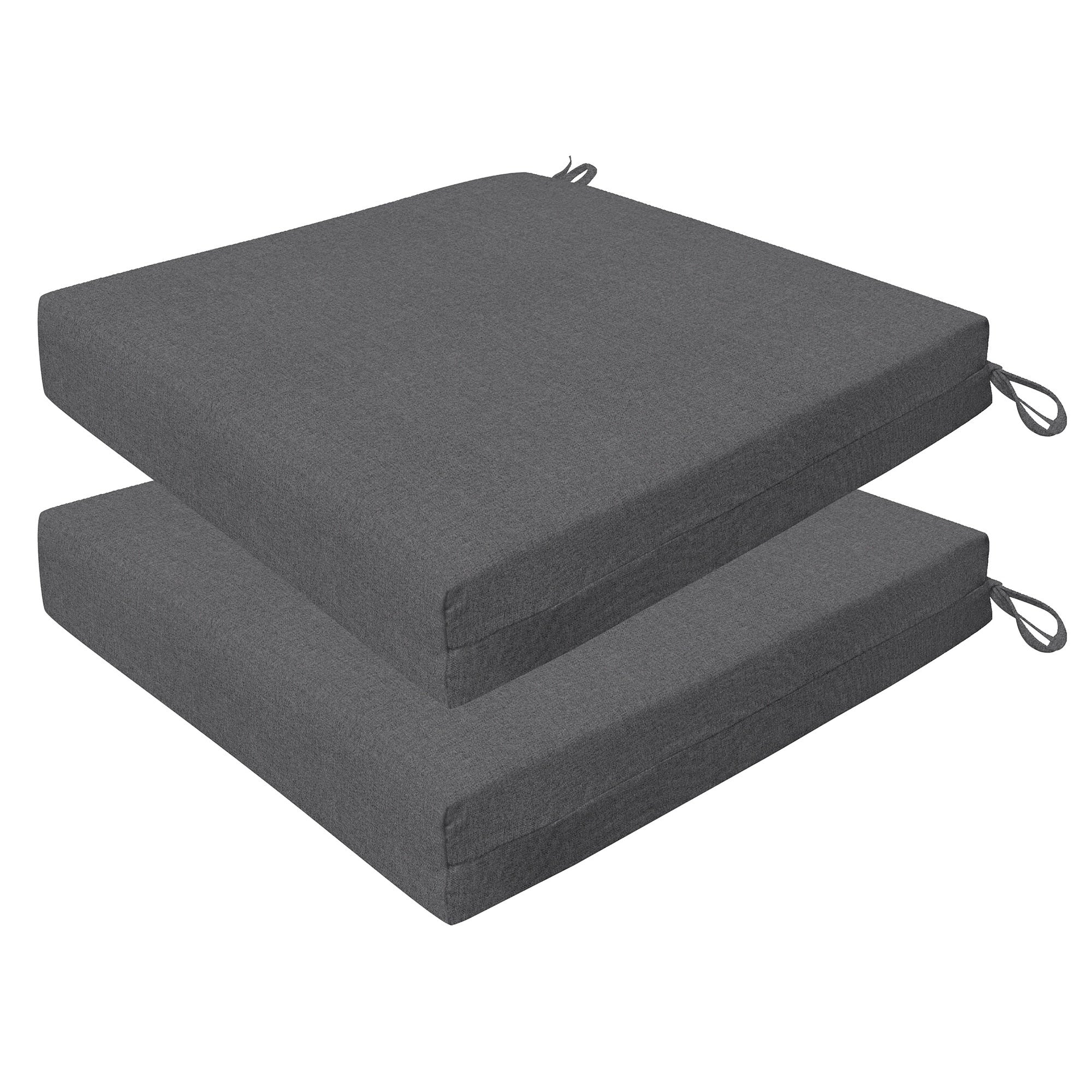 Revive your outdoor furniture in quality and style with our 2-pack premium patio dining seat cushions. Crafted with durable and beautiful fabrics, these cushions will resist the elements while remaining bright and beautiful for years to come. Finished & filled in the US with superior recycled polyester fiber for long-lasting comfort and support. Measures 20'W x 20'D x 4' thick.