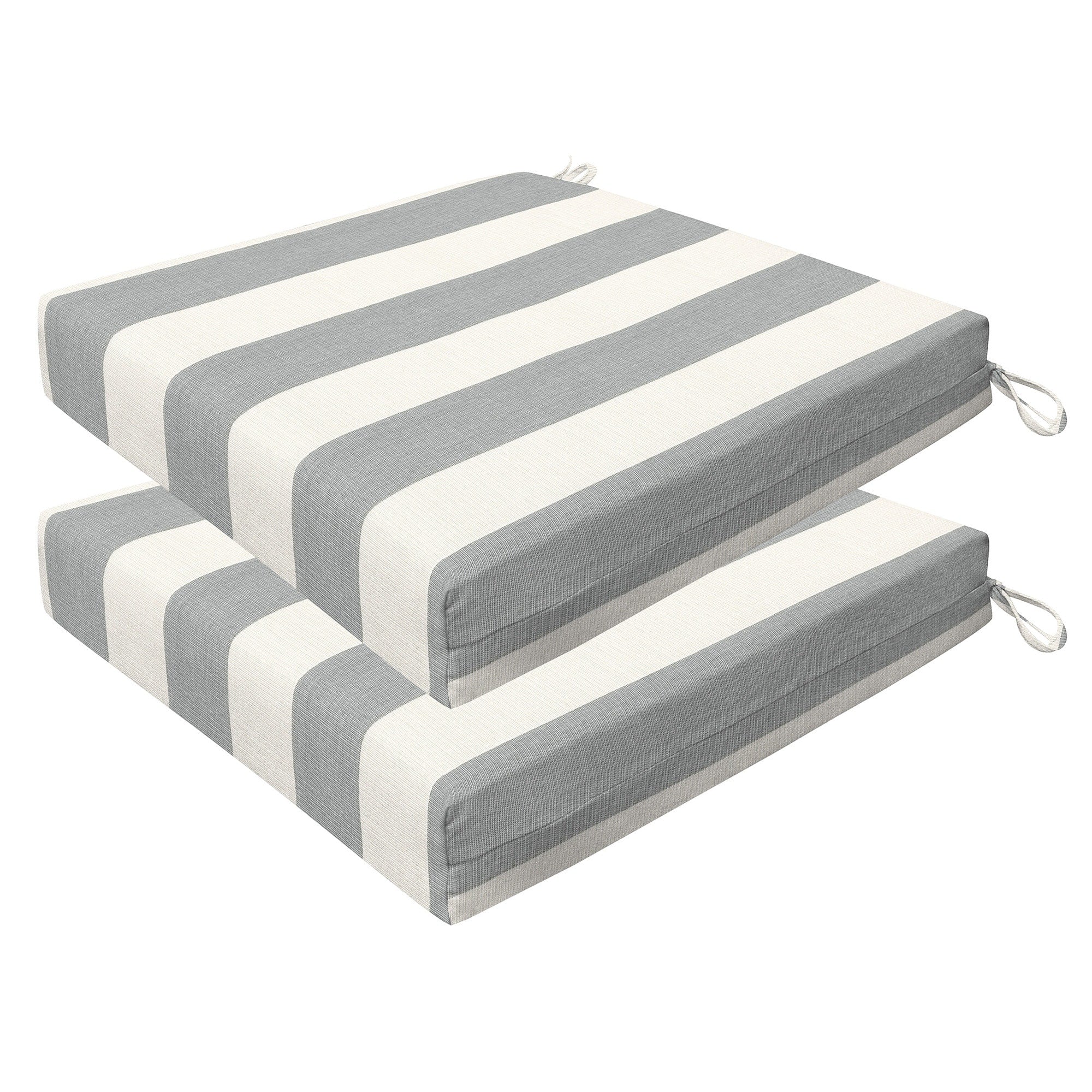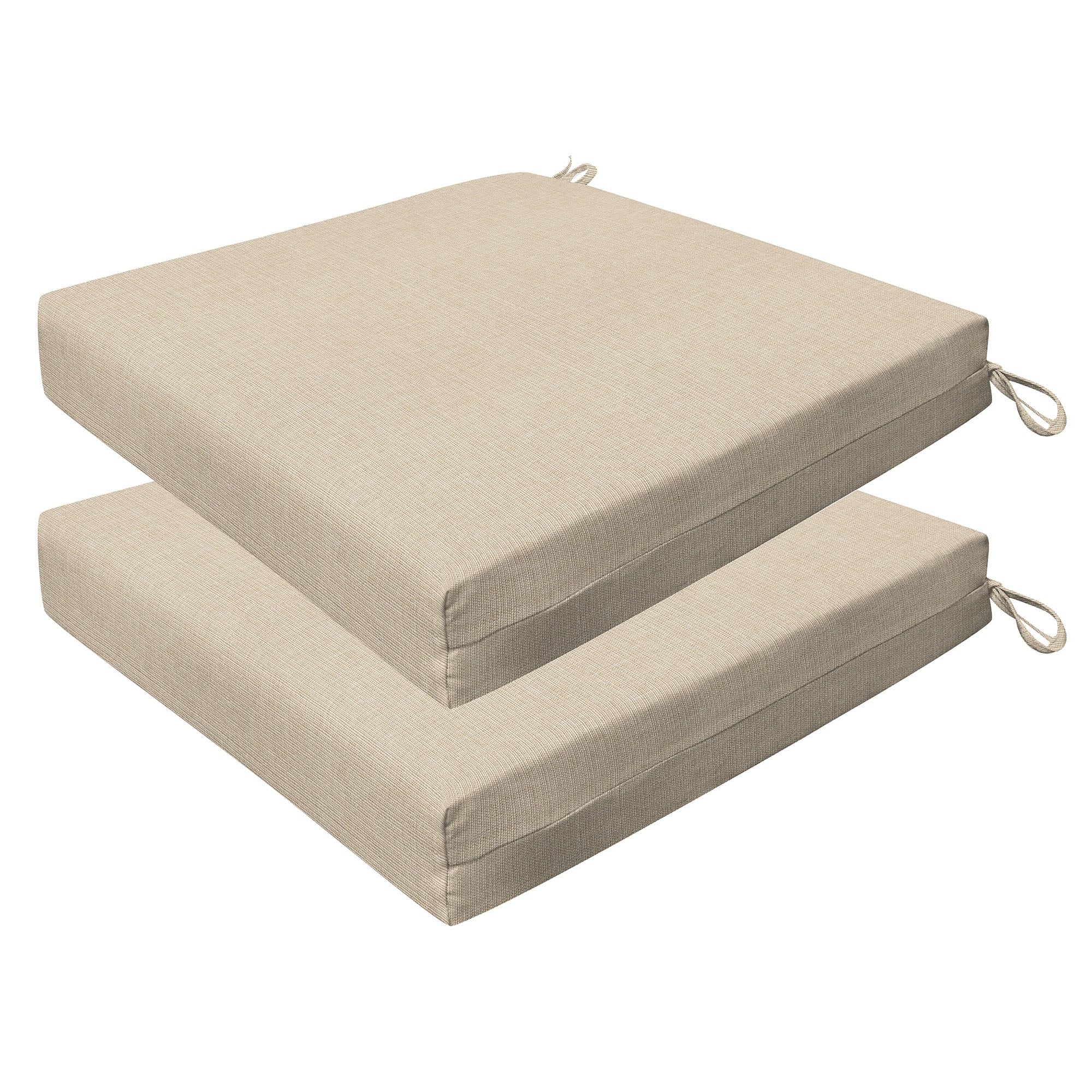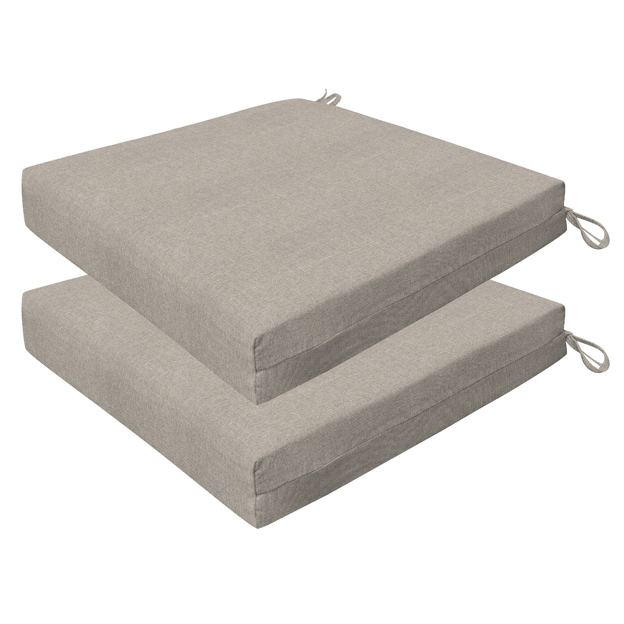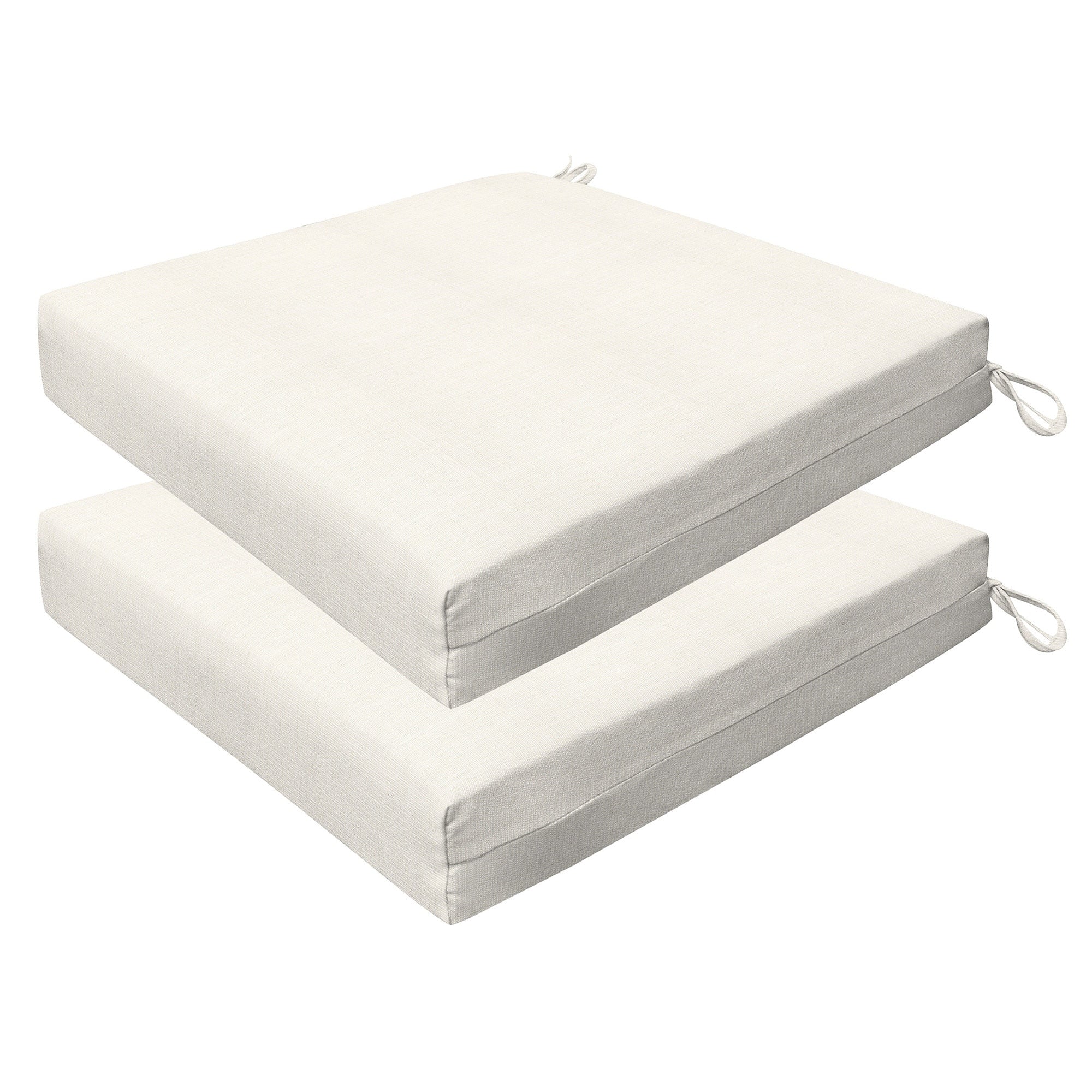 Revive your outdoor furniture in quality and style with our 2-pack premium patio dining seat cushions. Crafted with durable and beautiful fabrics, these cushions will resist the elements while remaining bright and beautiful for years to come. Finished & filled in the US with superior recycled polyester fiber for long-lasting comfort and support. Measures 20'W x 20'D x 4' thick.