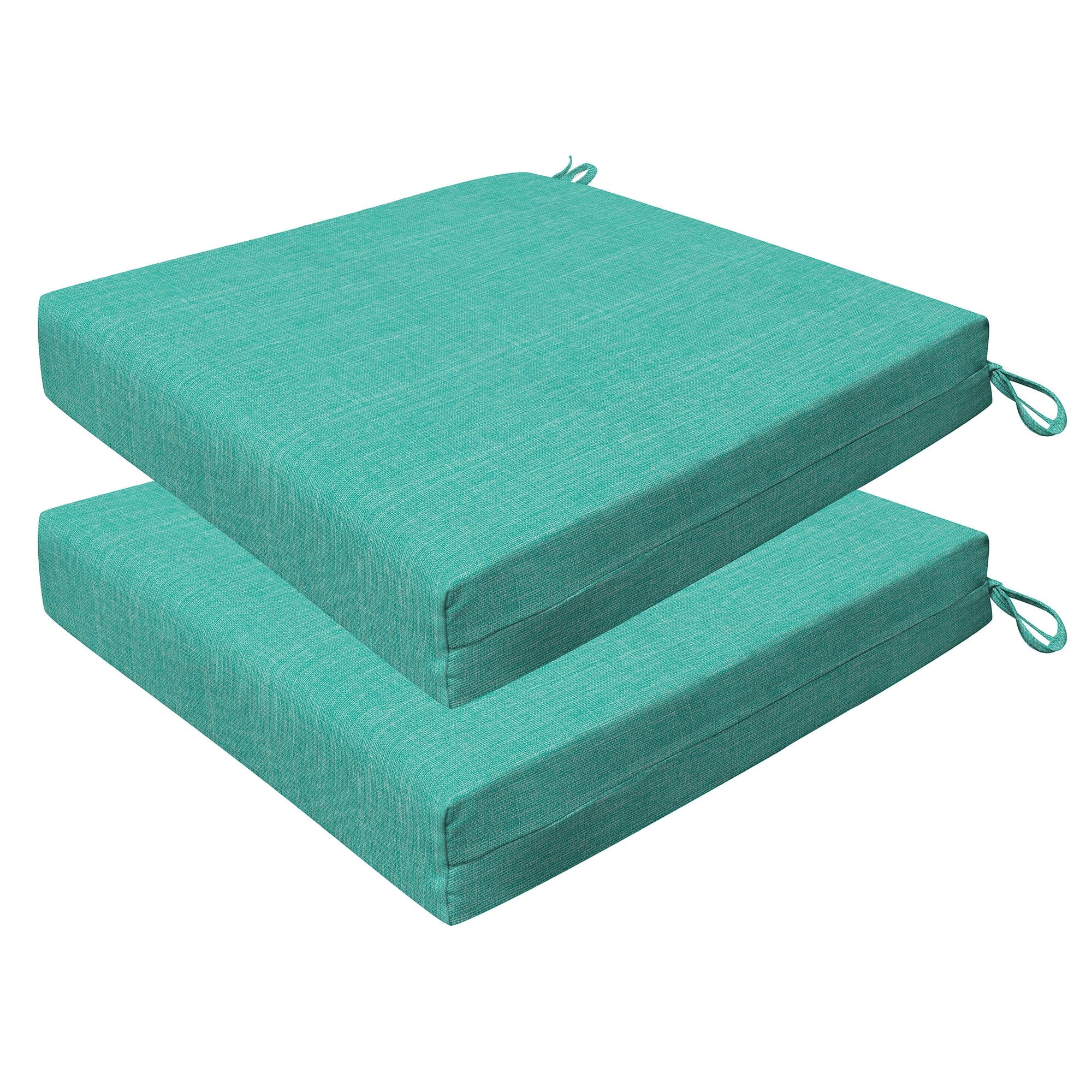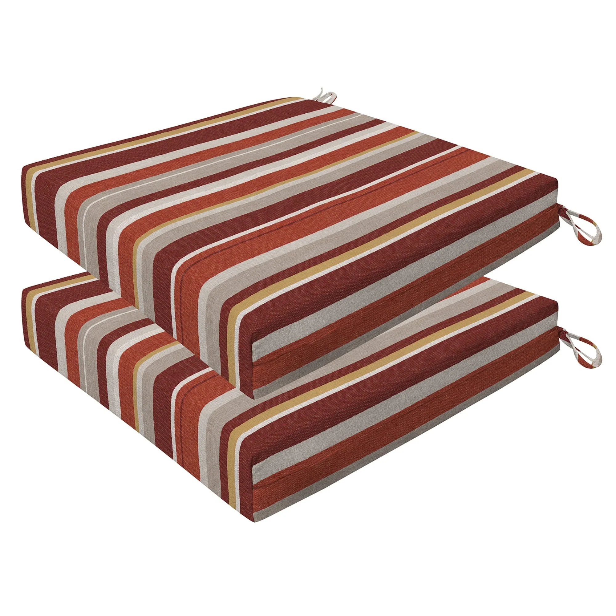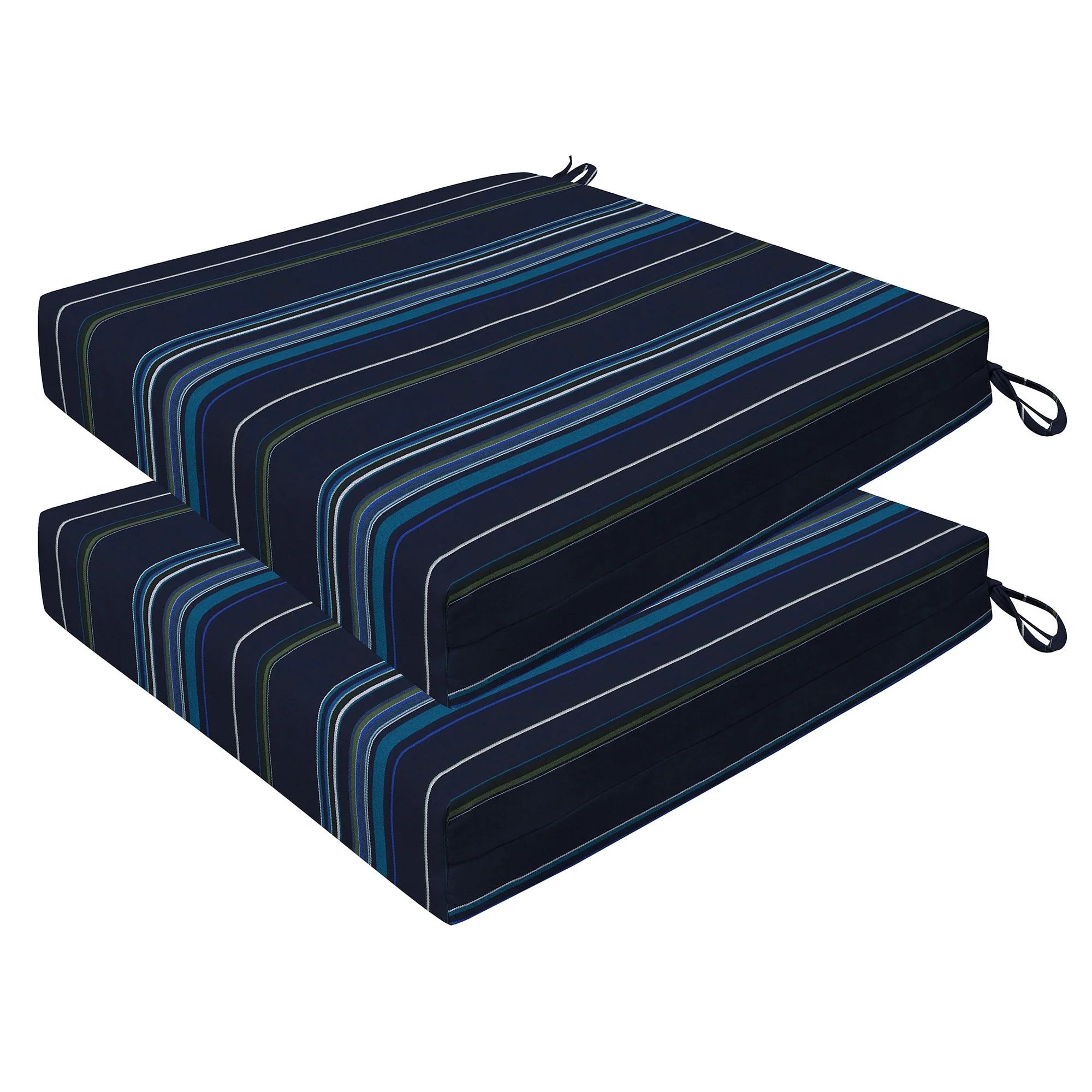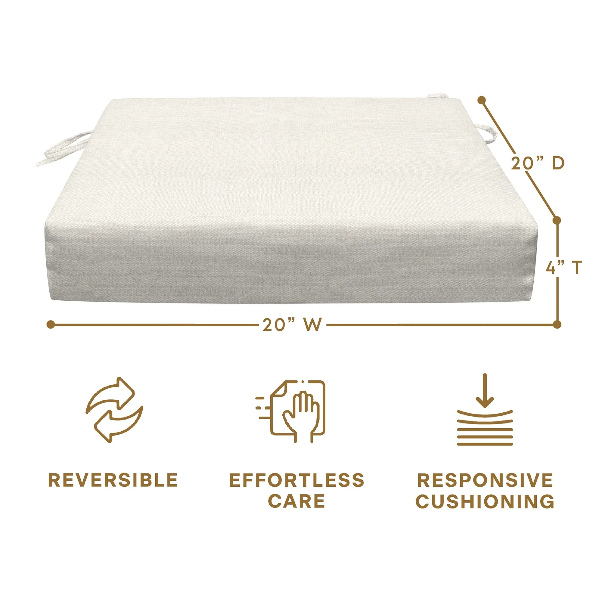 Revive your outdoor furniture in quality and style with our 2-pack premium patio dining seat cushions. Crafted with durable and beautiful fabrics, these cushions will resist the elements while remaining bright and beautiful for years to come. Finished & filled in the US with superior recycled polyester fiber for long-lasting comfort and support. Measures 20'W x 20'D x 4' thick.
