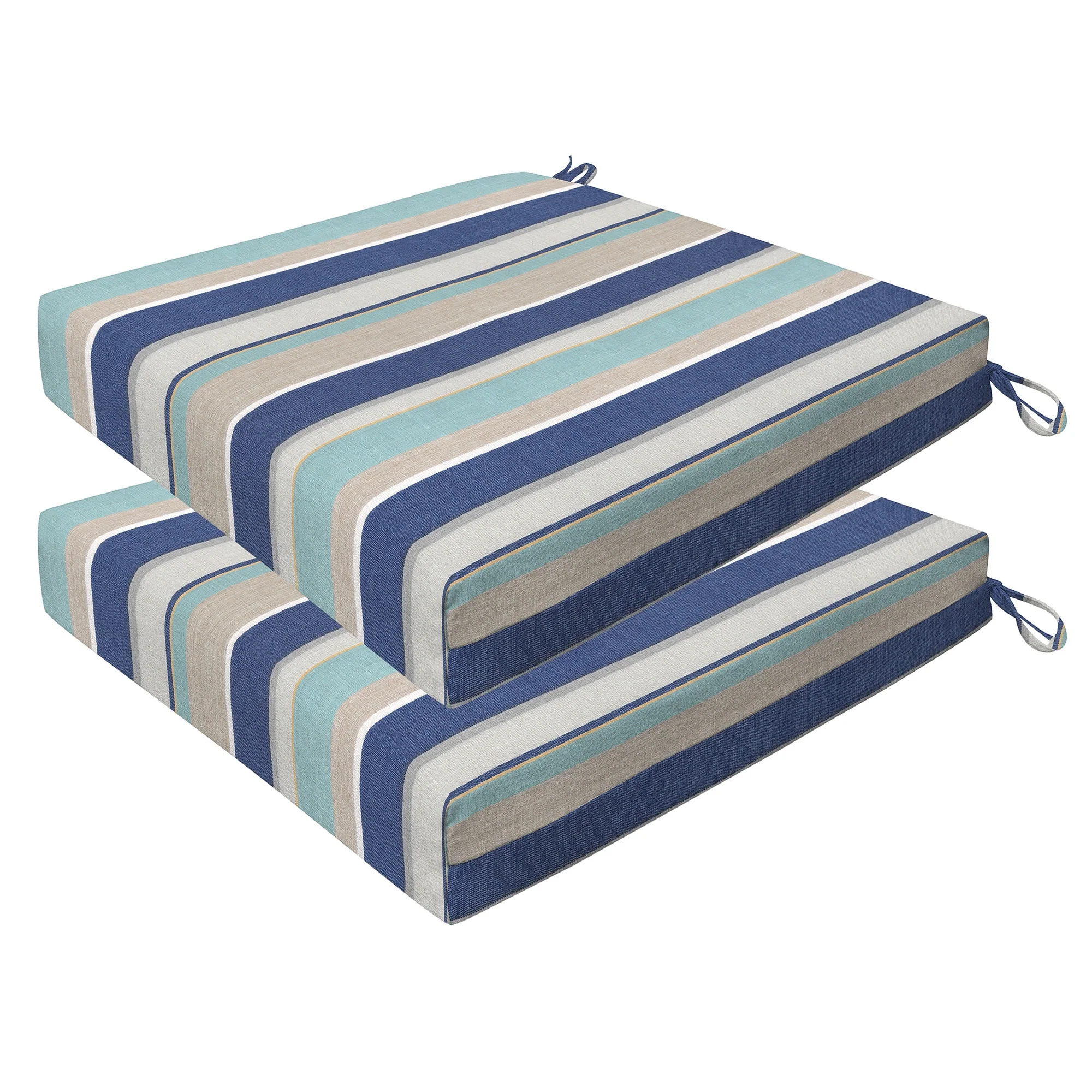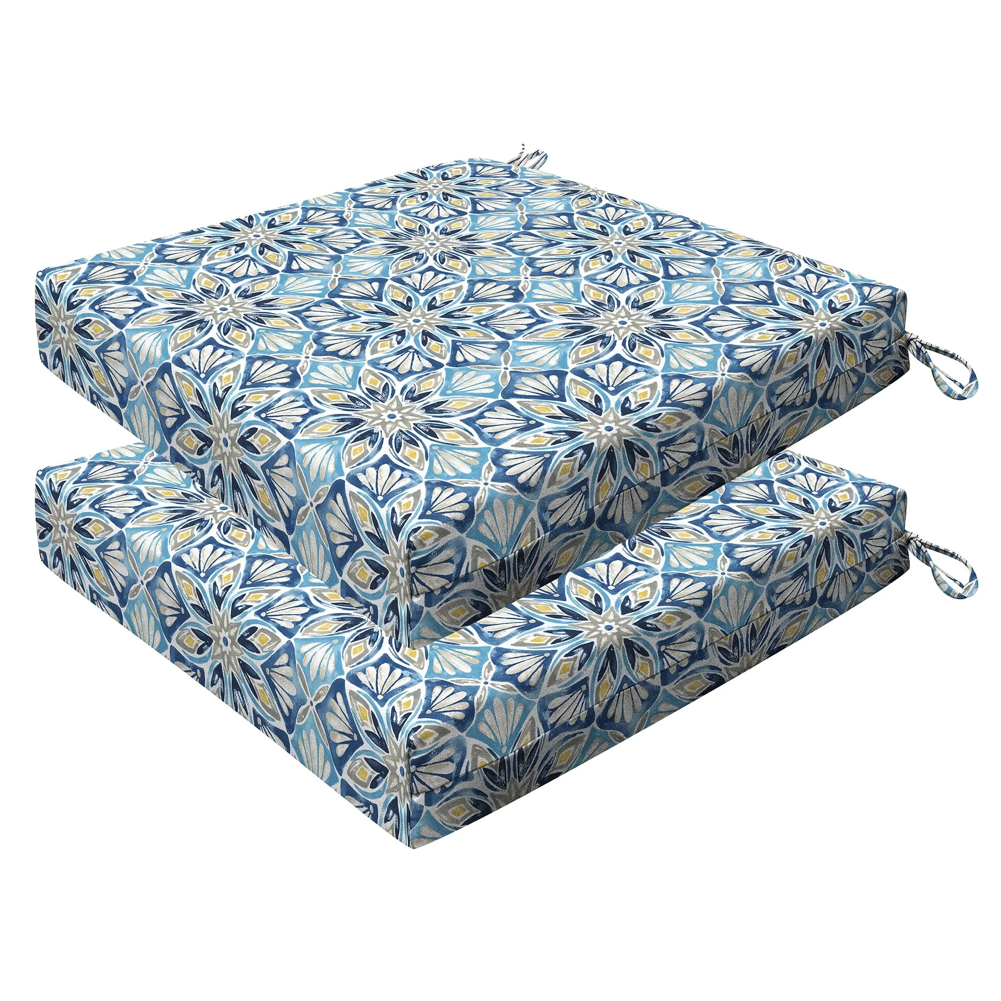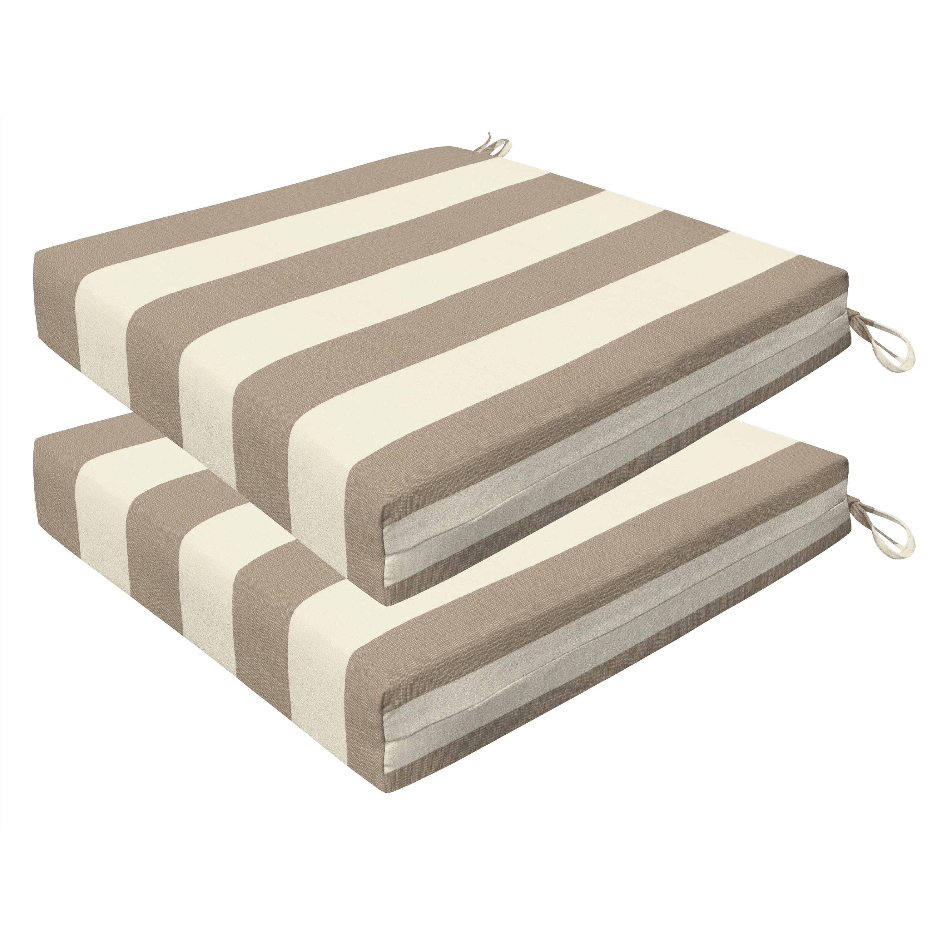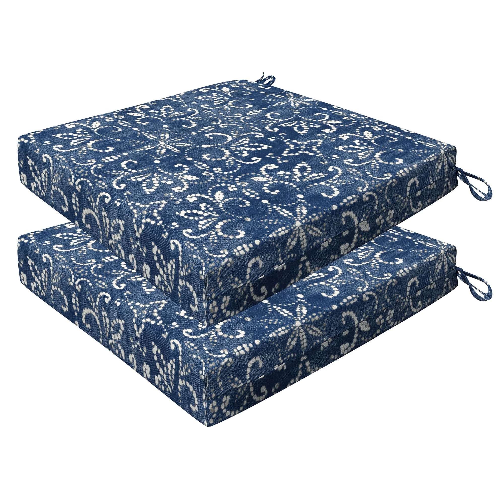 Revive your outdoor furniture in quality and style with our 2-pack premium patio dining seat cushions. Crafted with durable and beautiful fabrics, these cushions will resist the elements while remaining bright and beautiful for years to come. Finished & filled in the US with superior recycled polyester fiber for long-lasting comfort and support. Measures 20'W x 20'D x 4' thick.